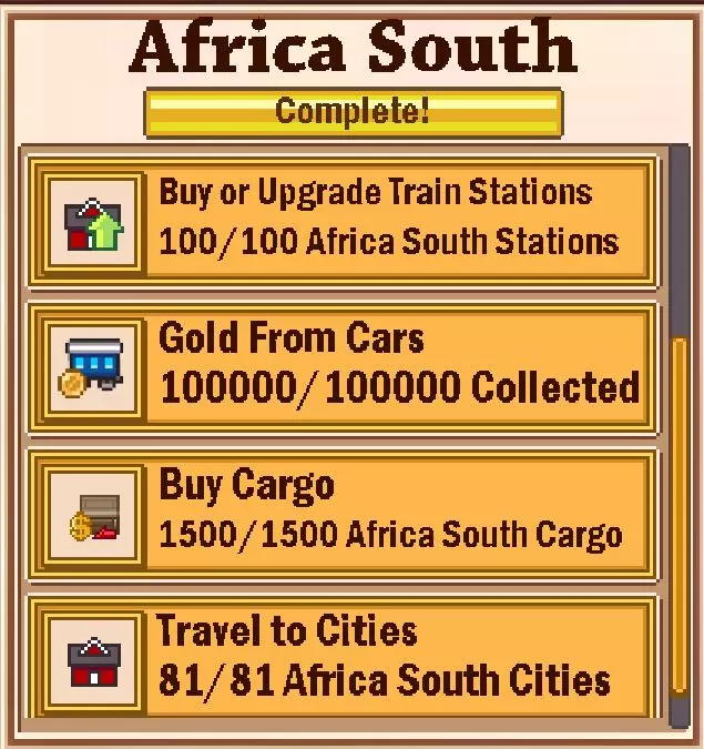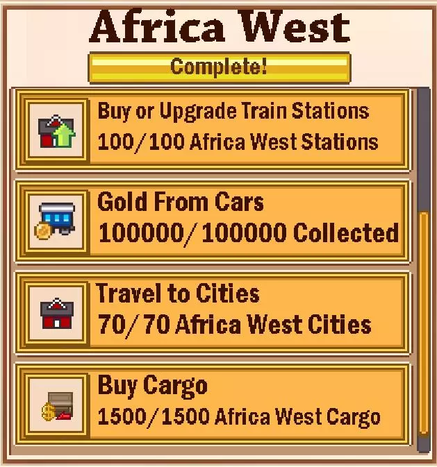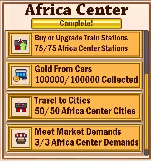 游戏中有一些基础目标,比如运输一定数量的乘客和赚取一些金钱,但我们可以忽略这些。 主要目标如下: 1. 购买或升级100个火车站 2. 升级5节车厢 3. 购买1500个货物 4. 满足1个市场需求 火车站可以升级3次,每次升级的费用如下: - 500 + 1000 + 5000 = 6500 - 1000 + 5000 + 10000 = 16000 - 5000 + 10000 + 50000 = 65000 - 50000 + 100000 + 500000 = 650000 在非洲东部地区,你无需购买成本超过16000的火车站。 升级5节车厢的目标是所有目标中最困难的,需要花费大量时间。不过,有两件事可以让这个目标变得更容易:第一,你只需在执行此任务期间点击升级按钮即可;第二,升级时无需在该区域内行驶。最简单的方法是使用新的普通火车车厢,并在行驶500公里后进行简单升级。不过在游戏中,两个车站之间的实际距离似乎比500公里要远得多。 满足车站需求可能有些困难,但在这里并非如此。向苏尔特运送25个胡萝卜,或向该地区北部的加特运送25份蜂蜜,就能完成任务。在做其他事情时,甚至可以在该地区找到胡萝卜。 非洲中部的目标:建设这片黑暗大陆。