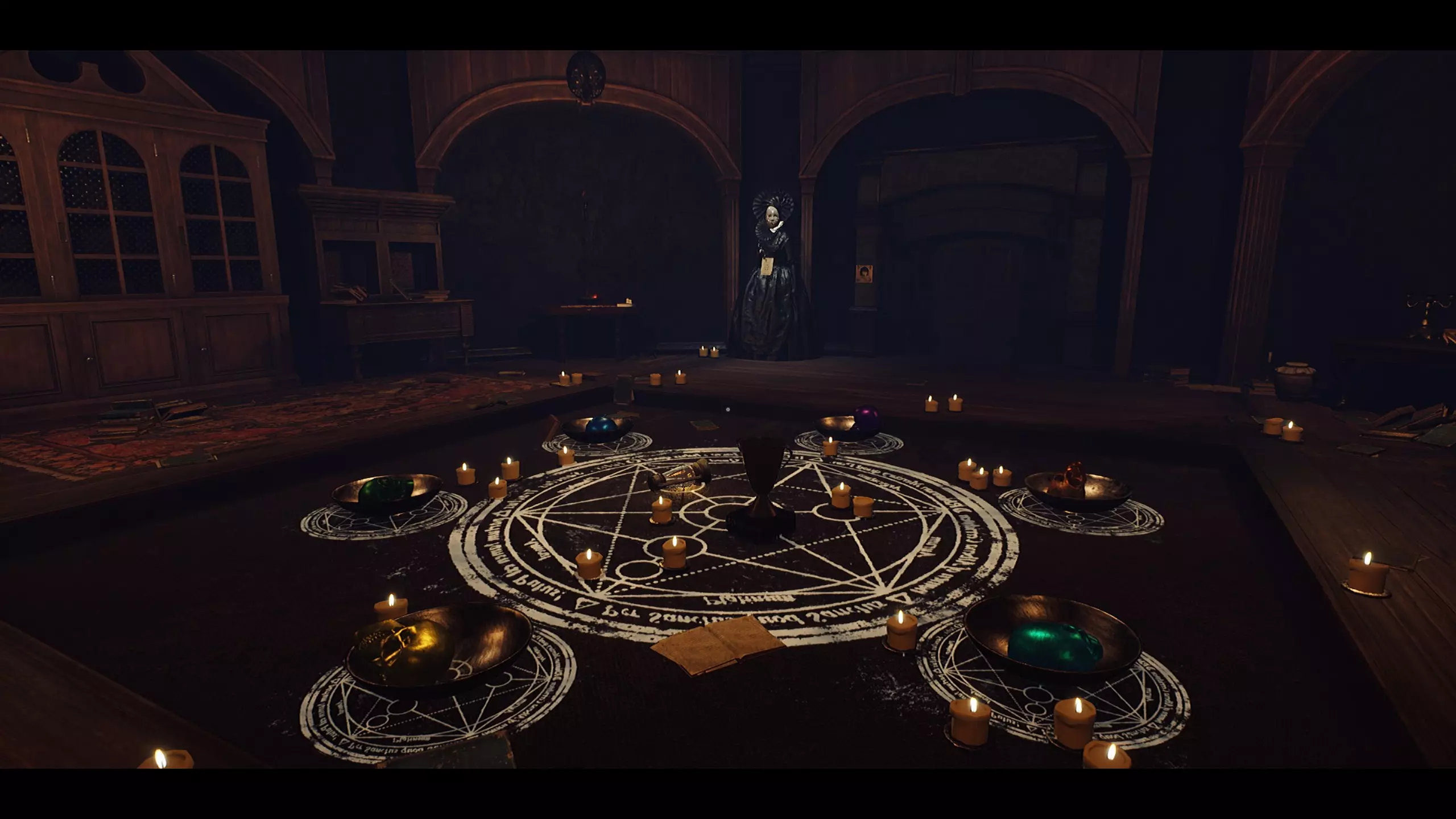 提示:务必阅读并记下钉在雕像上的便签以及梳妆台上便签中的关键点(宝石类型和颜色、放置方向等)。 找到所有头骨——总共有7个。一定要查看物体后面,有时甚至可能需要跳起来才能找到一个。 至于最后一个头骨——你会知道是哪一个——注意给出的提示……“能与死者对话”。你认为房间里有什么可以用来与死者对话? 游戏中所说的“门前”,指的是你进来时的那扇门,而不是你试图打开的那扇。 解决方案:头骨位置 1. 紫水晶/紫色——这个非常明显,在一个架子上。 2. 琥珀/橙色——在梳妆台顶部,需要跳一下。 3. 海蓝宝石/青色/浅蓝色——半埋在一些书下面。这很明显。 4. 黄玉/黄色——就在带有纸条的雕像旁边;它在地板上。 5. 翡翠/绿色——在靠近带有“神灯”的箱子附近的帽子下面。这很明显。 6. 蓝宝石/深蓝色——在一个海盗宝箱后面。 7. 红宝石/红色——在沙发上的抱枕后面。 如何放置头骨 1. 将紫水晶(紫色)头骨放在你进来的那扇门前的碗里。 2. 按顺时针方向,接下来放置琥珀(橙色)头骨。 3. 在下一个碗中放置海蓝宝石/青色(浅蓝色)头骨。 4. 然后将黄玉(黄色)头骨放在下一个碗中。这个头骨应该放在你试图打开的那扇门前的碗里。 5. 接着放置翡翠(绿色)头骨。 6. 最后放置蓝宝石(深蓝色)头骨。 7.别忘了将红色/红宝石头骨放在通灵板的碗里 解谜截图