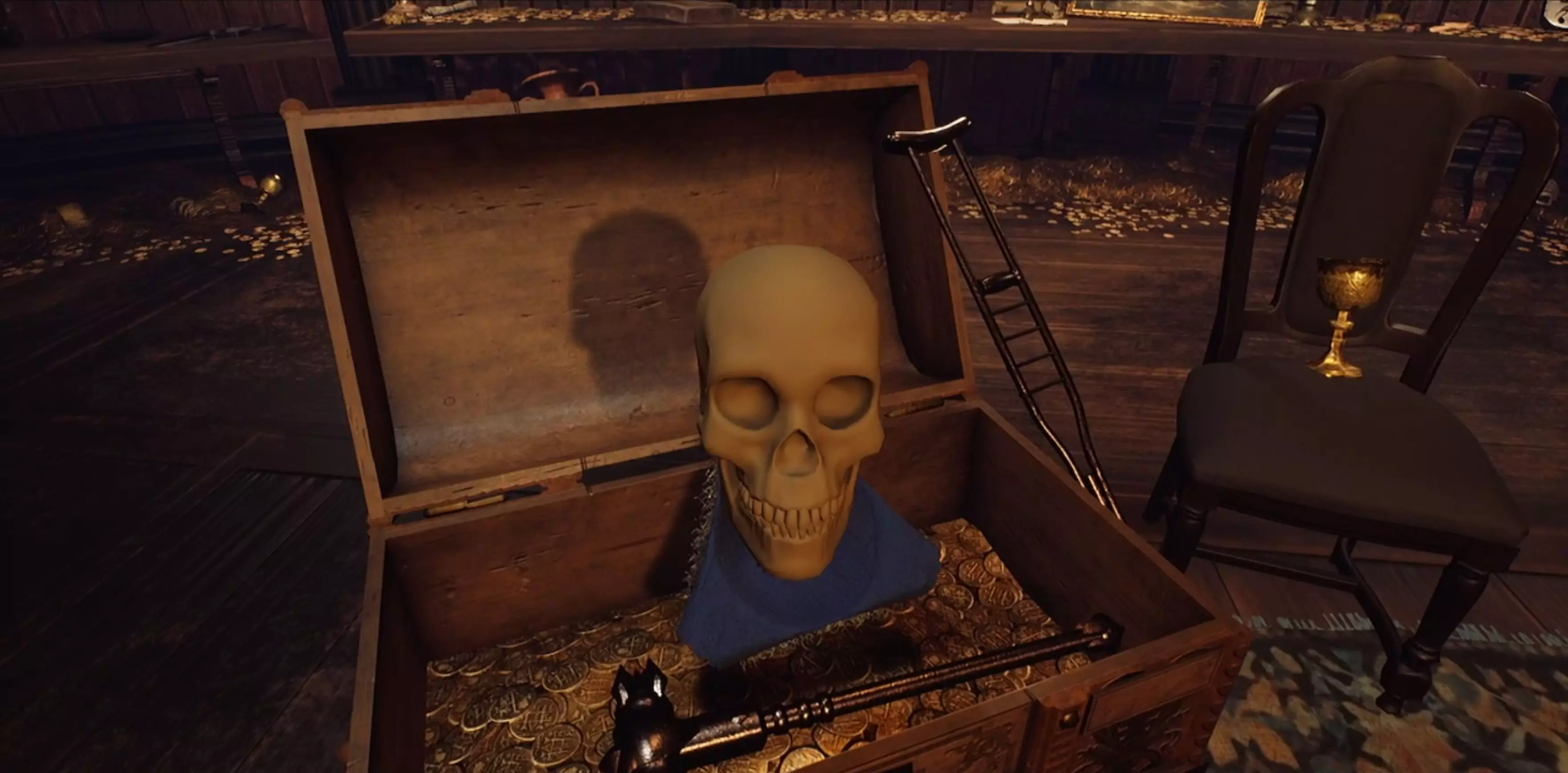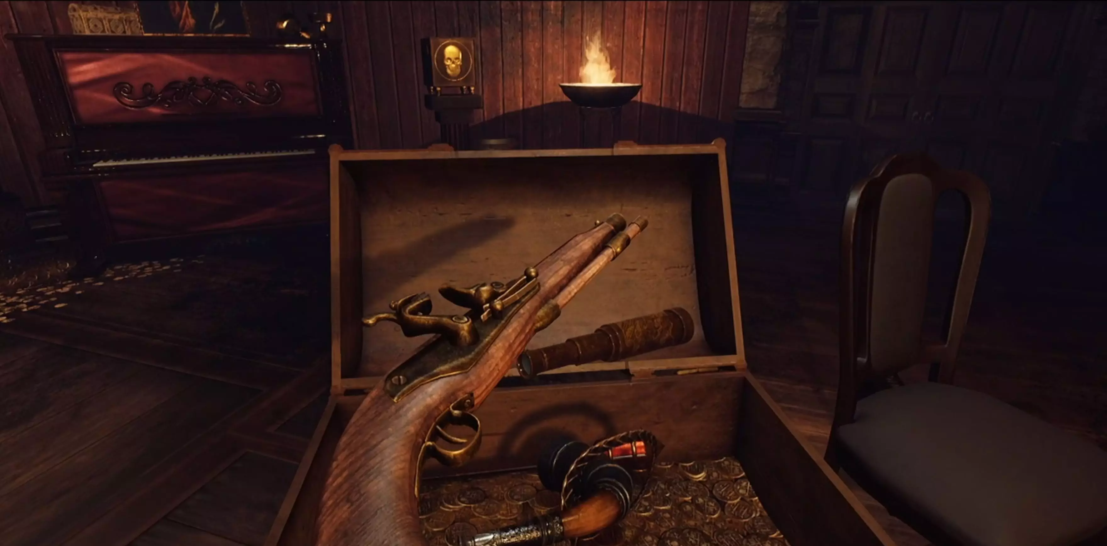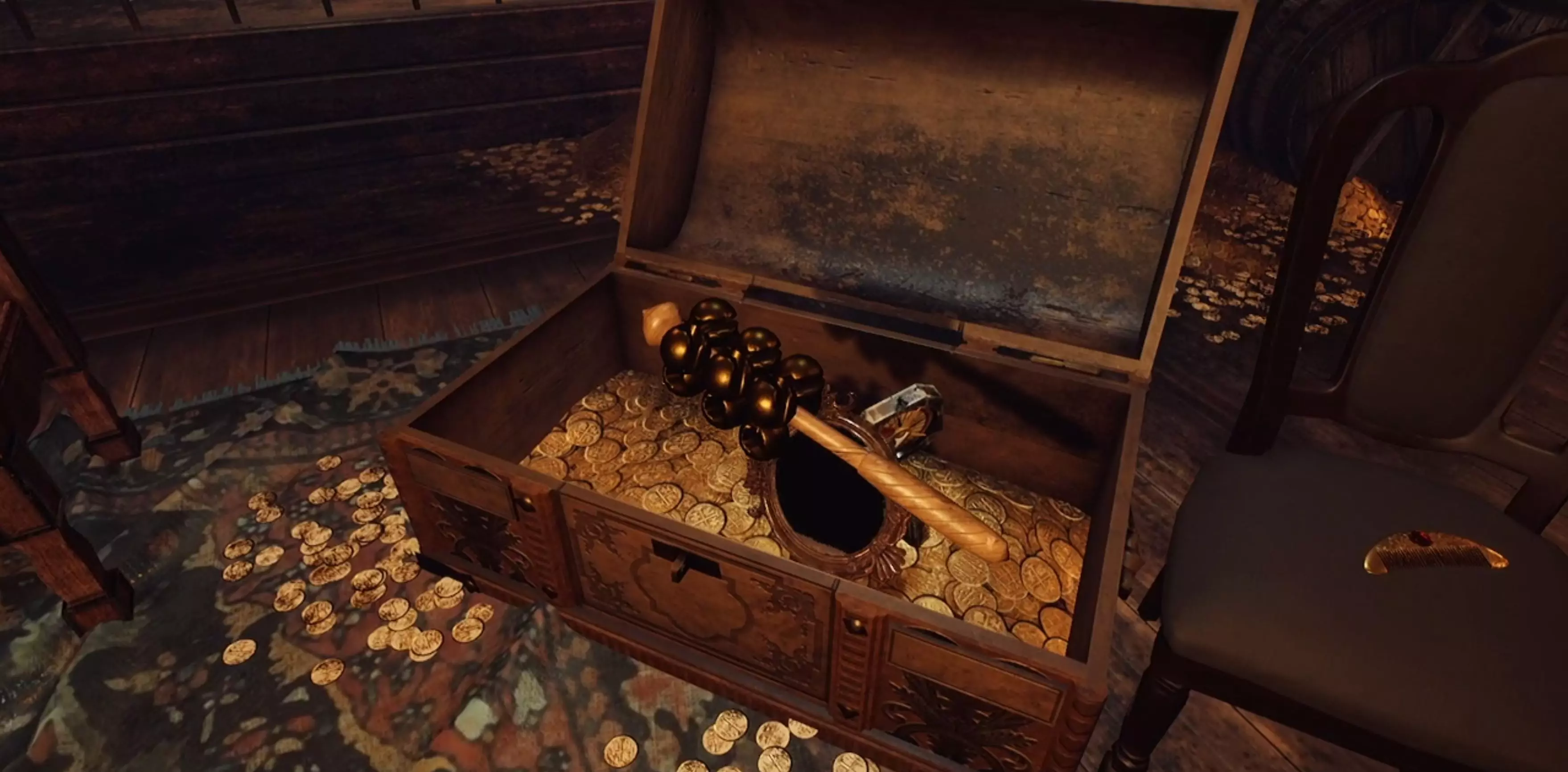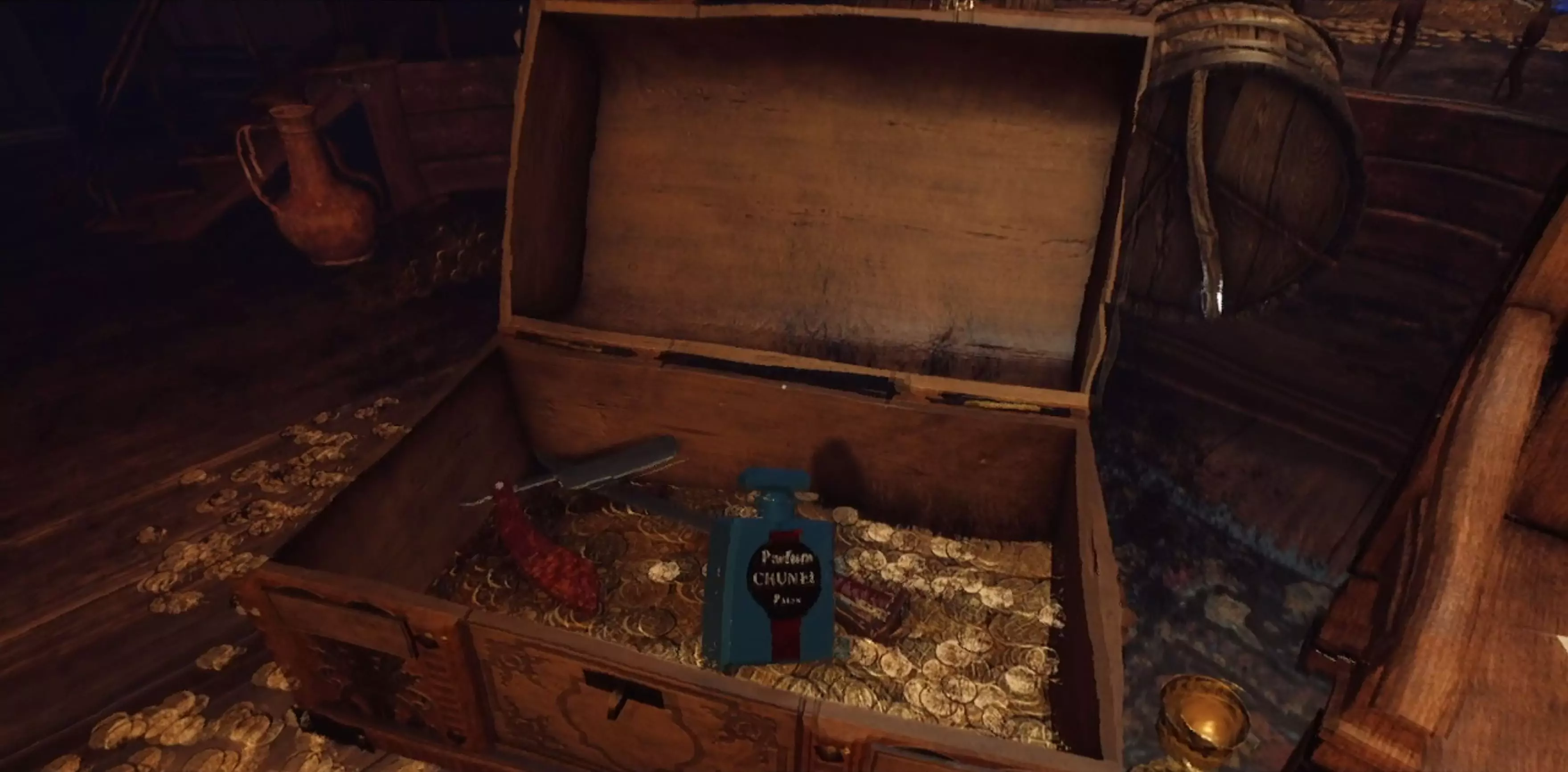 提示:阅读房间中央椅子上留下的便条。 阅读所有4名海盗的日志,找出每名海盗的重要“纪念品”。提示:每名海盗应有4件纪念品,其中杰克·高德只有3件。 你需要确定哪个箱子属于哪个海盗。这里的提示是查看每个箱子旁边或(某种程度上)内部的物品。这些物品将帮助你确定箱子的归属。最后未分配的箱子自然属于剩下的海盗。 大多数物品都很容易找到,它们并没有被刻意隐藏。 另外,如果你想放纵一下,可以喝掉所有朗姆酒,其效果很快就会消退。 额外提示 - 海盗日志中的关键词1.巴巴罗萨 失去了一条腿 钉头锤 元帅帽 保留着(船长的)头颅 2. 安妮·波妮 梳头 在镜子前 能告诉她北方在哪的东方小物件 怀孕 3. 杰克·高德 每日刮胡子 巴黎香水爱好者 偏爱刀剑武器的高贵感 4. 黑胡子 借助小物件能远距离探测船只 滋滋作响的烟花 食指指尖被火药灼伤 用维京号角喝朗姆酒 解决方法:所有物品的位置以及指向它们的关键词 1. 巴巴罗萨 失去了一条腿=拐杖(这表明附近的箱子是巴巴罗萨的) 钉头锤=钉头锤;在房间两侧其中一个平台上的加农炮附近。元帅帽=元帅帽;它和海盗日志在同一张桌子上(左侧)。 保留船指挥官的头颅=如今头颅已腐烂成头骨。你可以在离出口最近的加农炮附近找到它。注意头骨放在一张桌子上。 2. 安妮·邦尼 梳头=梳子(这表明附近的箱子是安妮的) 在镜子前=镜子;位于房间两侧其中一个平台上的加农炮附近,就在狼牙棒旁边。 向她指示北方的东方小装置=指南针;在箱子附近的桌子上 怀孕=拨浪鼓;就在海盗日志旁边 3. 杰克·高德 日常剃须=剃须刀;在房间两侧其中一个平台的地板上平台就是上面有大炮的那个。 喜爱巴黎香水的人=香水瓶;它在靠近出口的一个桶上。 偏爱利刃武器高贵感的人=剑;它和海盗日志在同一张桌子上(左边)。 4. 黑胡子 他借助一个小装置能远距离探测船只=望远镜(这表明这个箱子是黑胡子的) 滋滋作响的烟花=烟花;它在地毯上的箱子附近——你不会错过的。 他的食指指尖被火药灼伤=燧发枪/手枪;在箱子附近的桌子上。 用维京号角喝朗姆酒=维京号角;它在地毯上的箱子附近——你不会错过的。 已装满物品的箱子截图 1. 巴巴罗萨
