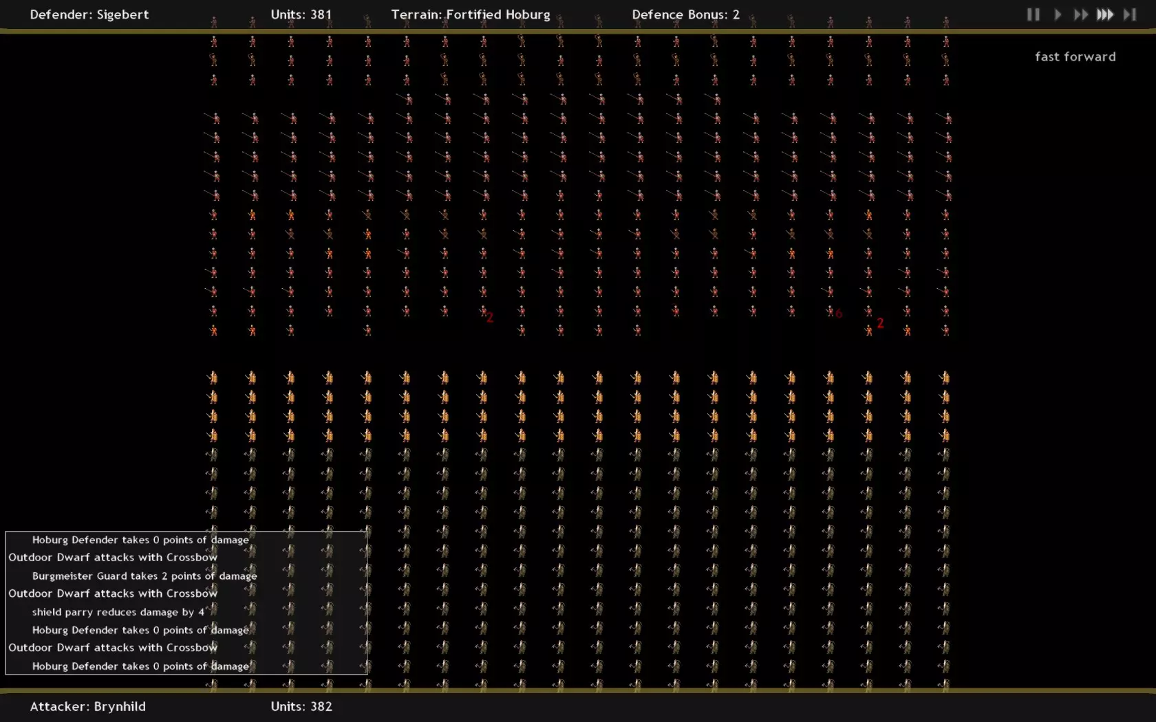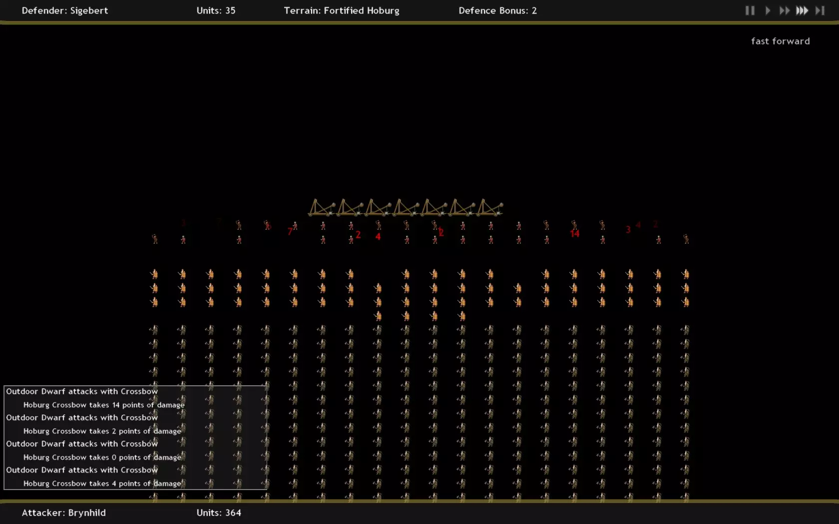规则5:远程单位造价高昂且生产耗时。矮人拥有3种远程单位。我认为劲弩手(5个单位耗费30铁)是矮人最差的远程单位。他们每3回合才能攻击一次,从长远来看,就其成本而言性价比很低(在长时间战斗中几乎毫无价值)。我一直搞不懂弩炮的用途。它们非常昂贵,而且我认为其成本和在军队中的地位并不值得……它们造成的伤害根本达不到应有的价值。由于弩炮是后排单位,如果你发现自己有几千铁的盈余,或许可以考虑使用它们。不过仔细想想,它们可能比劲弩手还要差。真正厉害的是户外矮人!他拥有1点护甲,远程伤害为1-8,具备小盾特性(同样有20%几率抵消4点伤害),并且每隔一轮可以使用十字弩射击。如果情况变得非常危急,他被迫身处前线时,凭借1-5伤害的斧头、小盾特性以及+1护甲,也能进行自保。说真的,这家伙简直就是个火箭筒!他唯一的问题是需要单独训练。所以,请保持耐心并开始行动吧,因为各位读者,这绝对是最棒、最出色且真正靠谱的单位! - 规则6:不要将矮人工人用作正面突击部队。他们需要升级后才能发挥实际作用。当然,它们可以对无甲的低级部队造成伤害,也能防御城镇免受小股游荡怪物的侵扰,但它们会受到所有命中攻击的全额伤害。这是一支弱旅……一支庞大的弱旅!