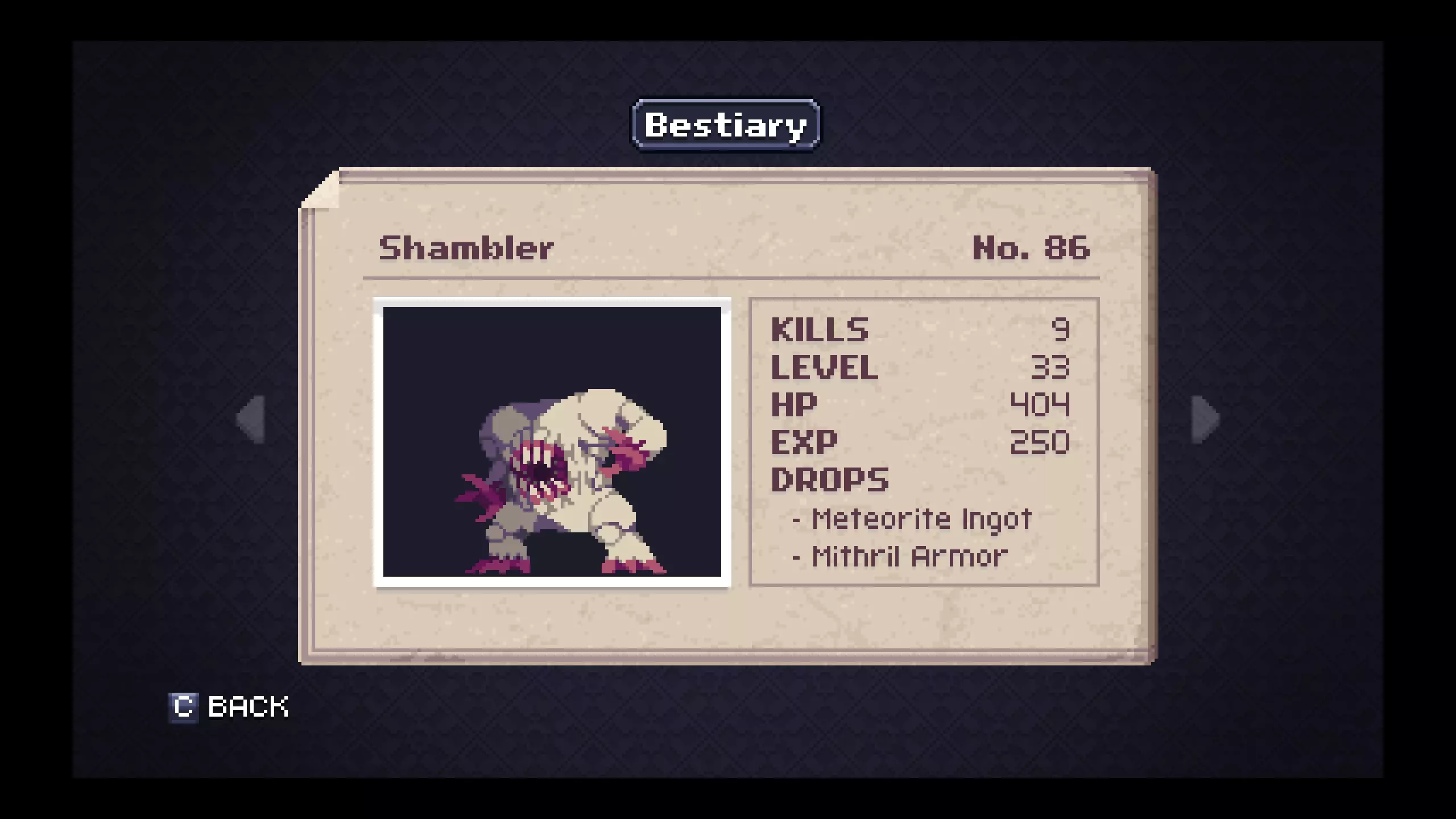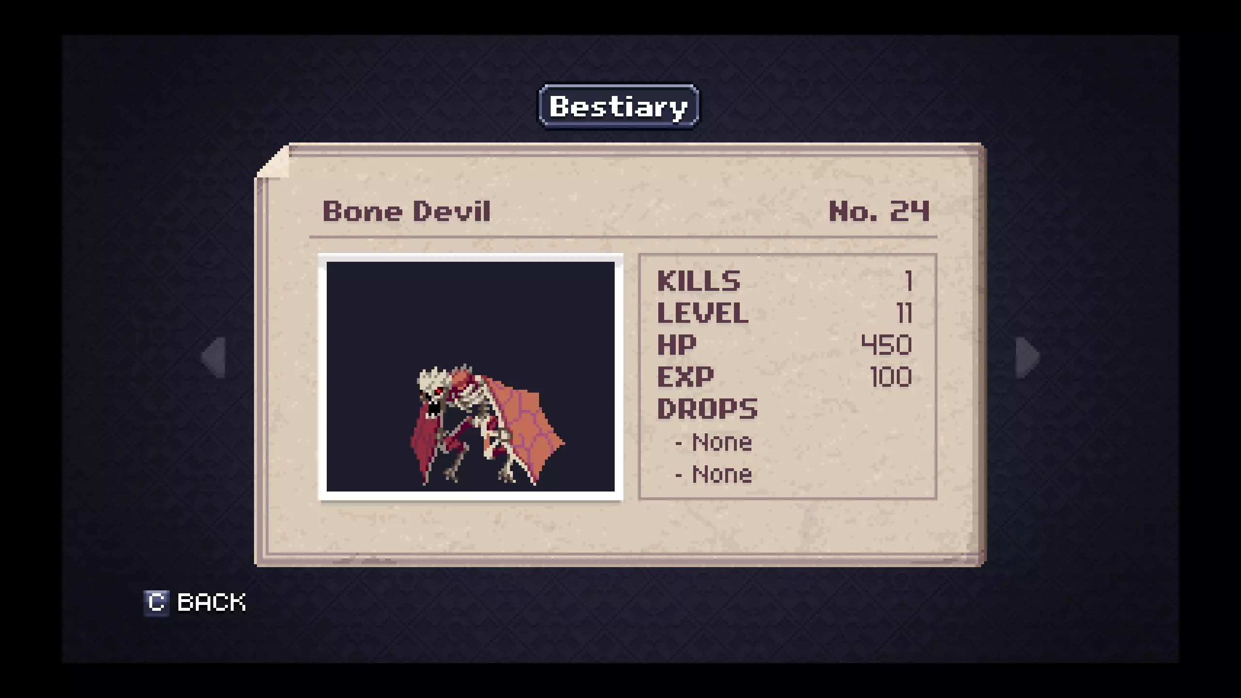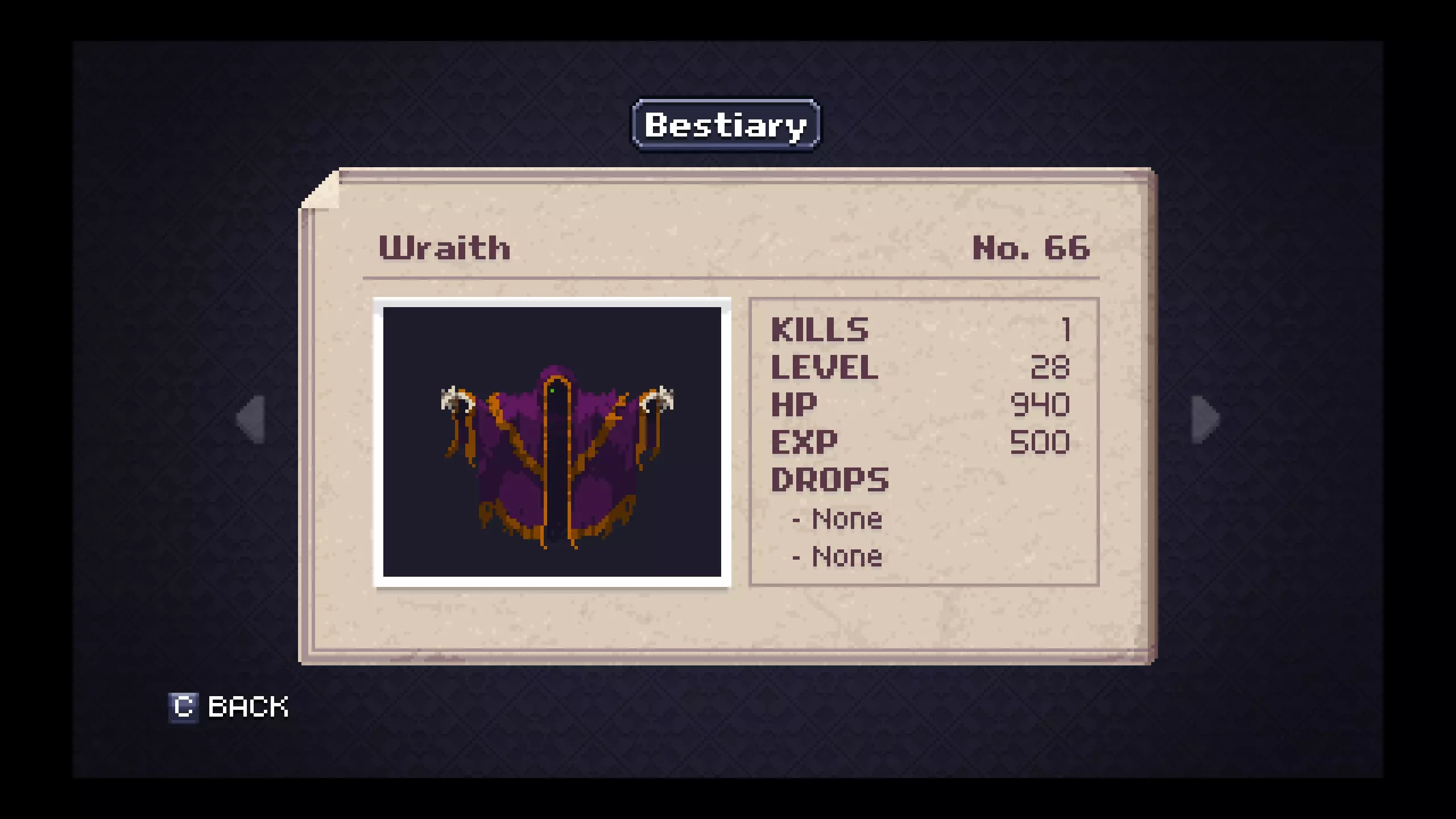 怪物图鉴 - 地下墓穴 笔记#18 - 飞行舱是掉落银锭概率较高的最低级敌人。在尝试探索地下墓穴更深区域前,用这些银锭制作银甲,对后续对抗小Boss和Boss会有极大帮助。 #20 - 骷髅的二级战利品会掉落一把相当强力且射程极远的武器。骨鞭在游戏的这个阶段非常有用,无论是偶然获得还是稍微刷一下就能得到。 #58 - 幻影作为非Boss敌人很特别,它只有一种物品掉落。装备献祭吊坠后能缓慢恢复法力值,当你恢复道具不足且需要撑到下一个存档点时,它在紧急情况下非常实用。
