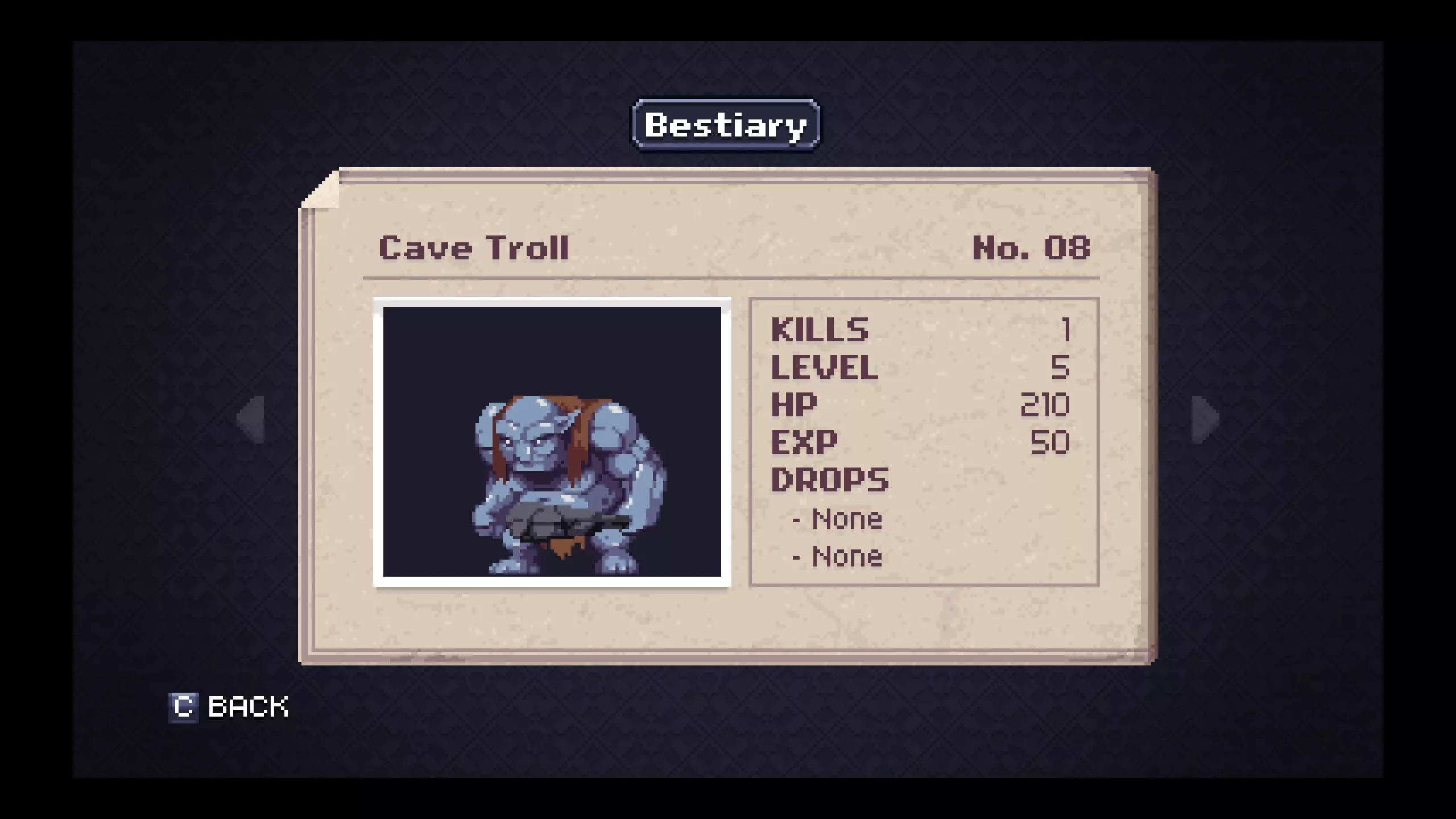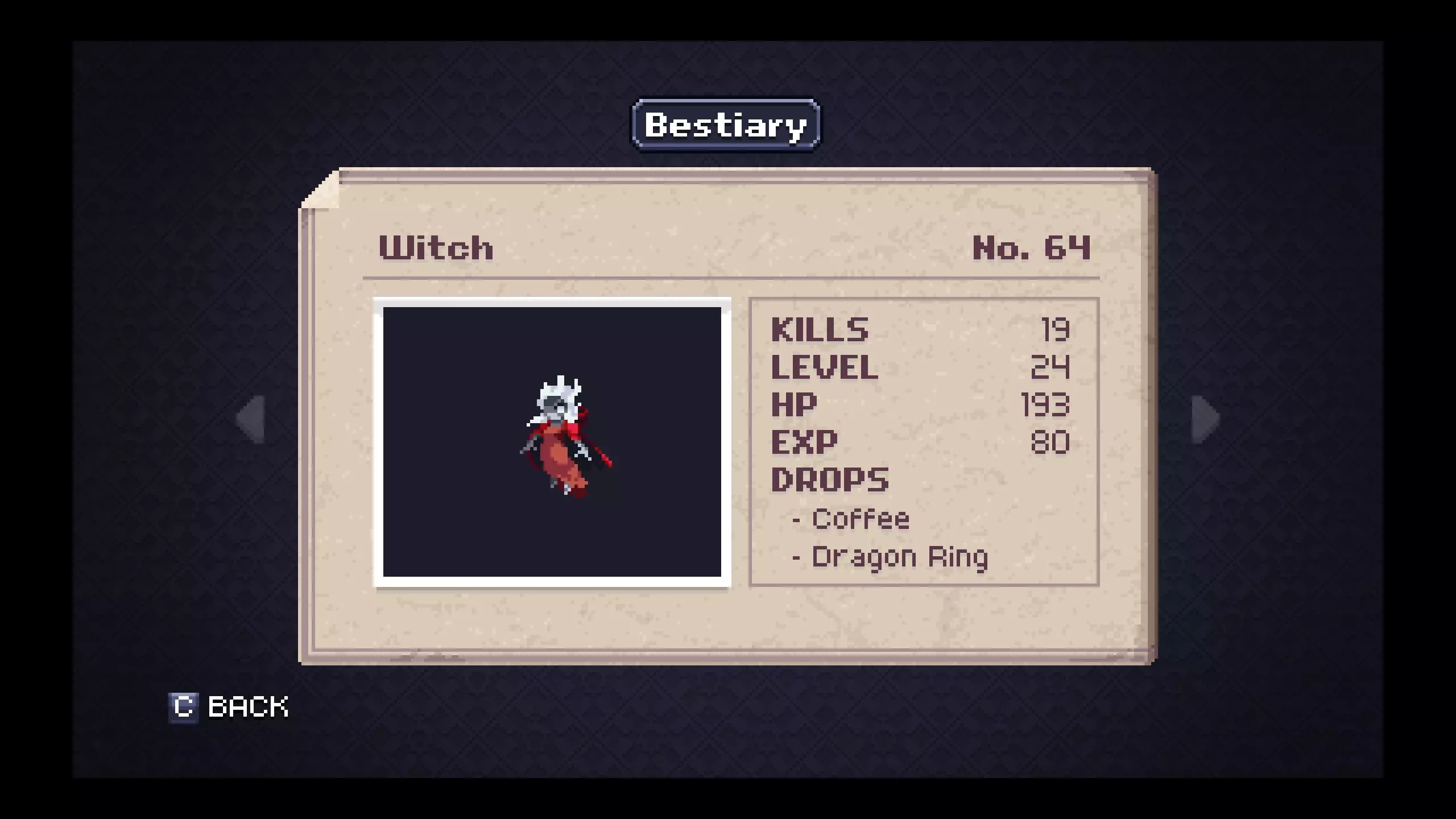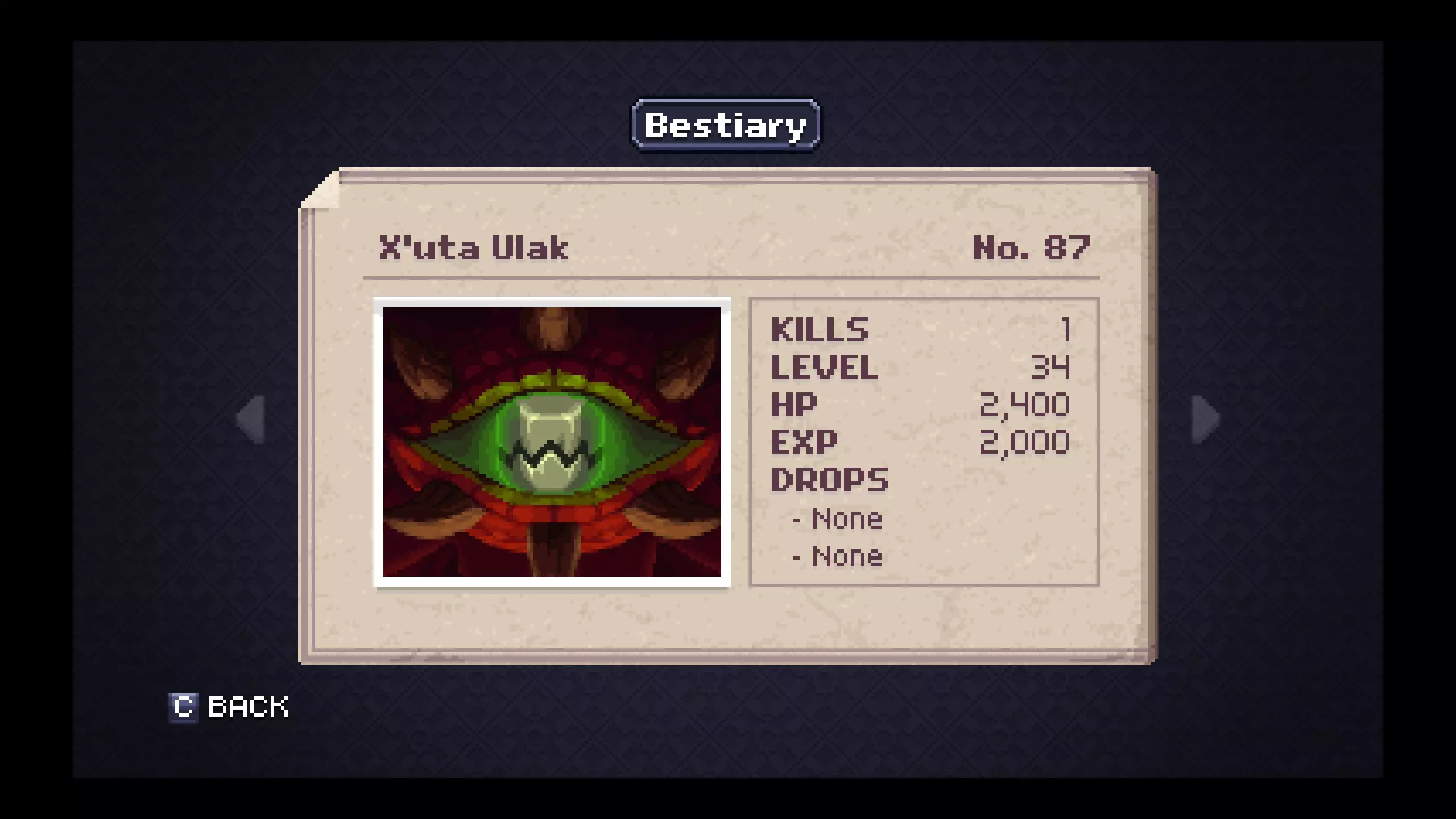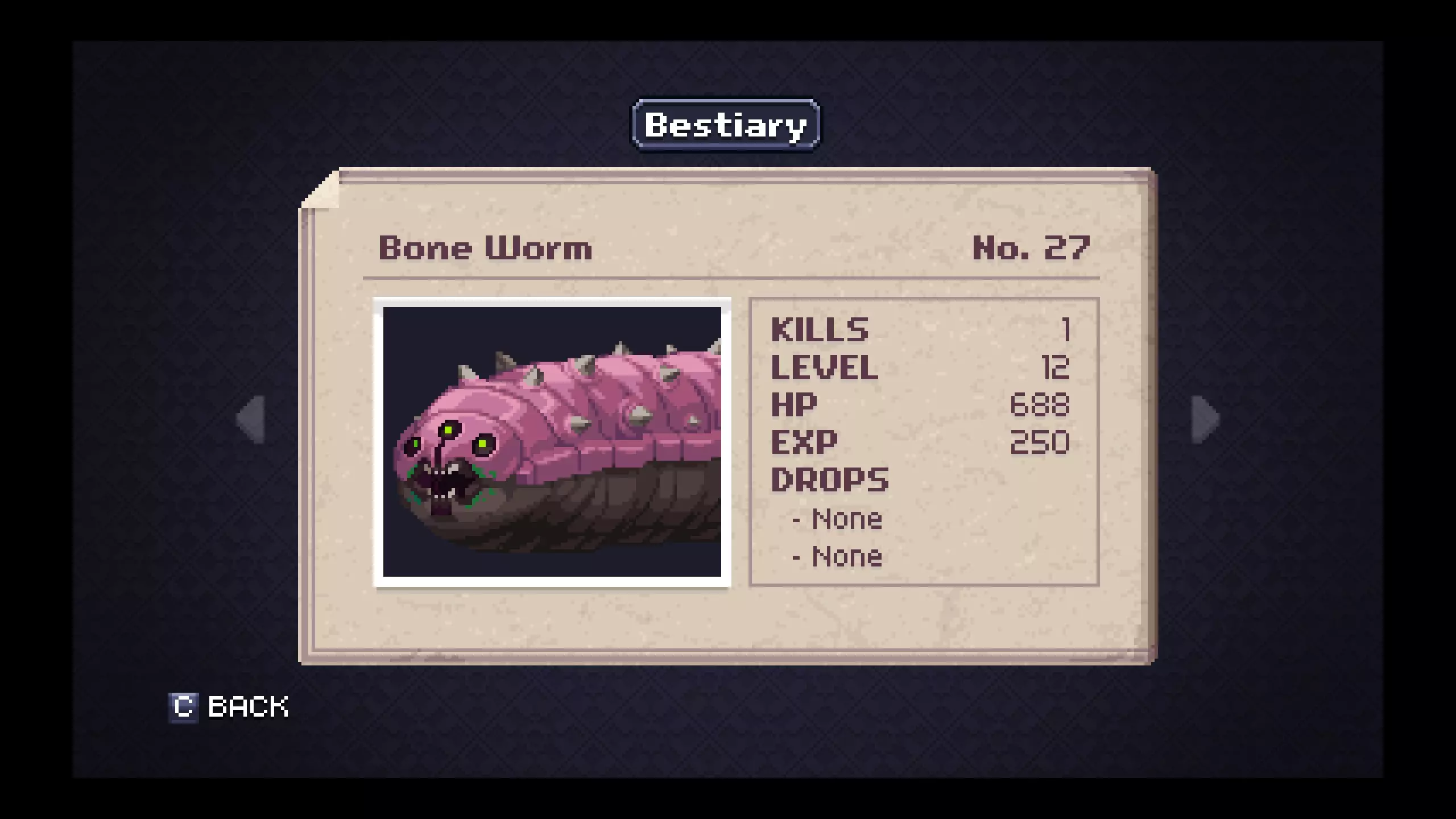 怪物图鉴 - 地下墓穴 笔记#18 - 飞行舱是掉落银锭概率较高的最低级敌人。在尝试探索地下墓穴更深区域前,用这些银锭制作银甲,对后续对抗小Boss和Boss会有极大帮助。 #20 - 骷髅的二级战利品会掉落一把相当强力且射程极远的武器。骨鞭在游戏的这个阶段非常有用,无论是偶然获得还是稍微刷一下就能得到。 #58 - 幻影作为非Boss敌人很特别,它只有一种物品掉落。装备献祭吊坠后能缓慢恢复法力值,当你恢复道具不足且需要撑到下一个存档点时,它在紧急情况下非常实用。