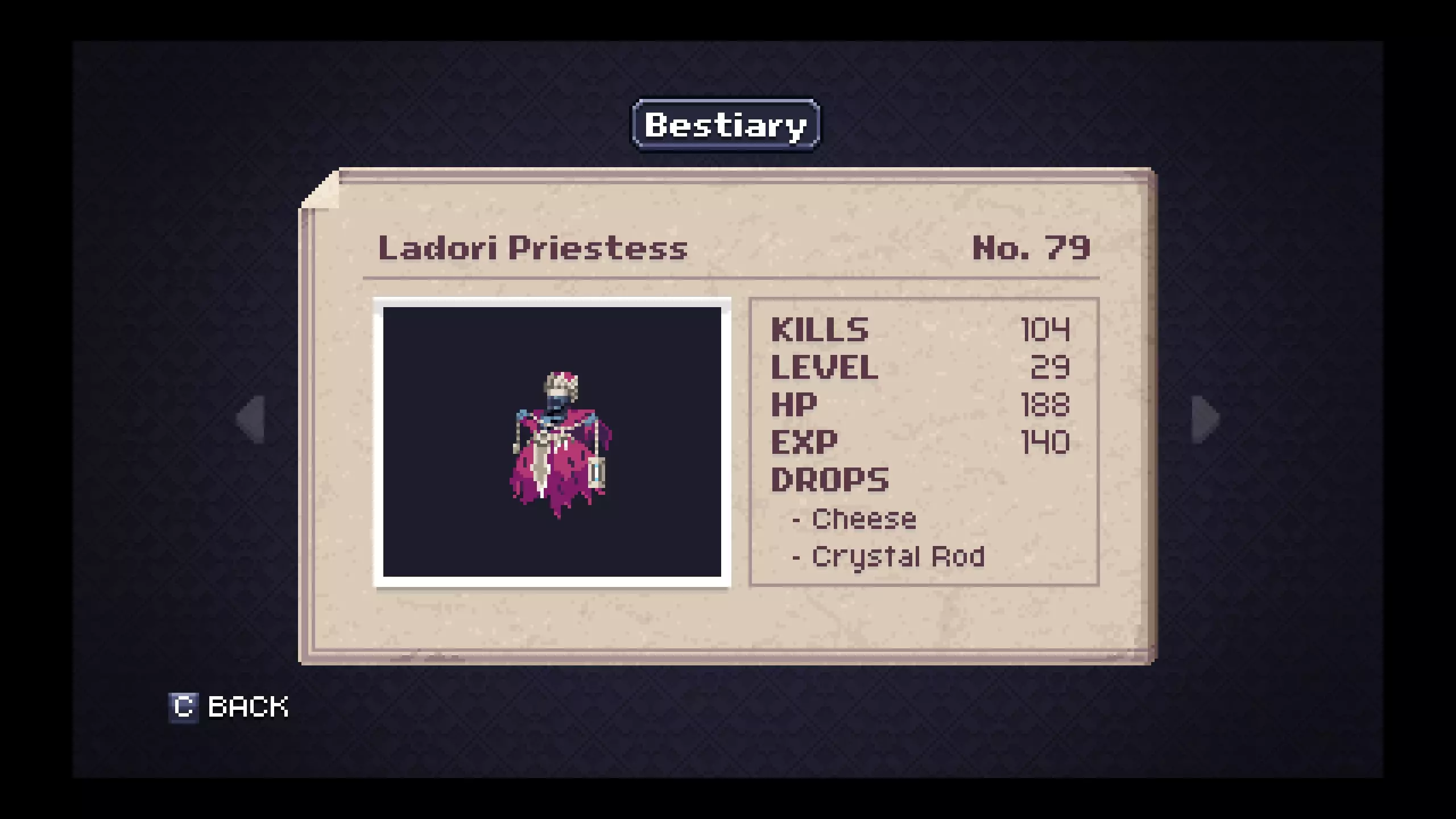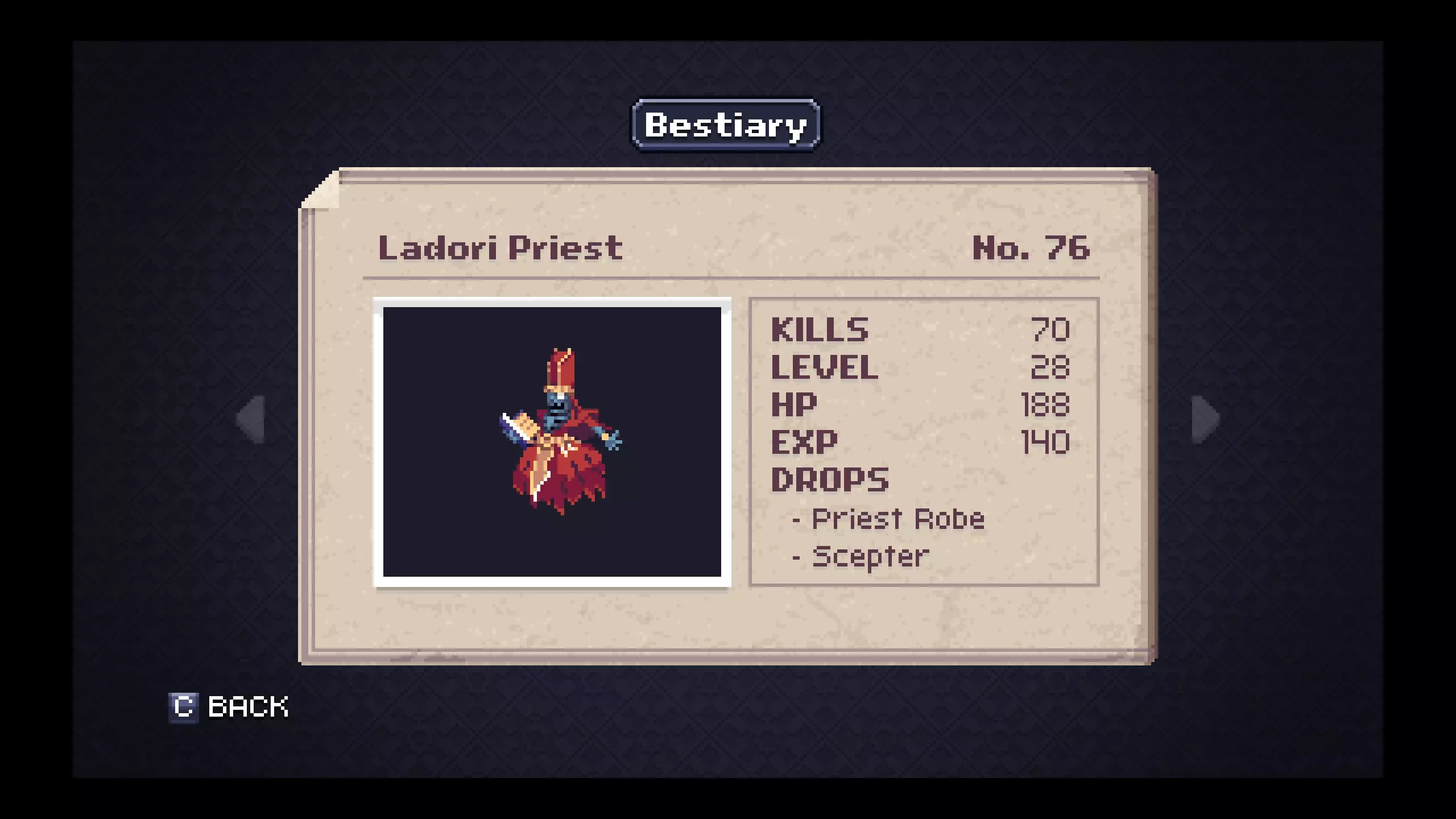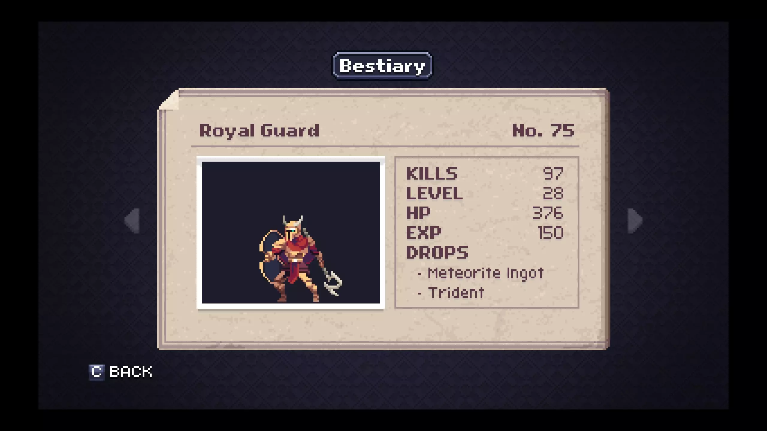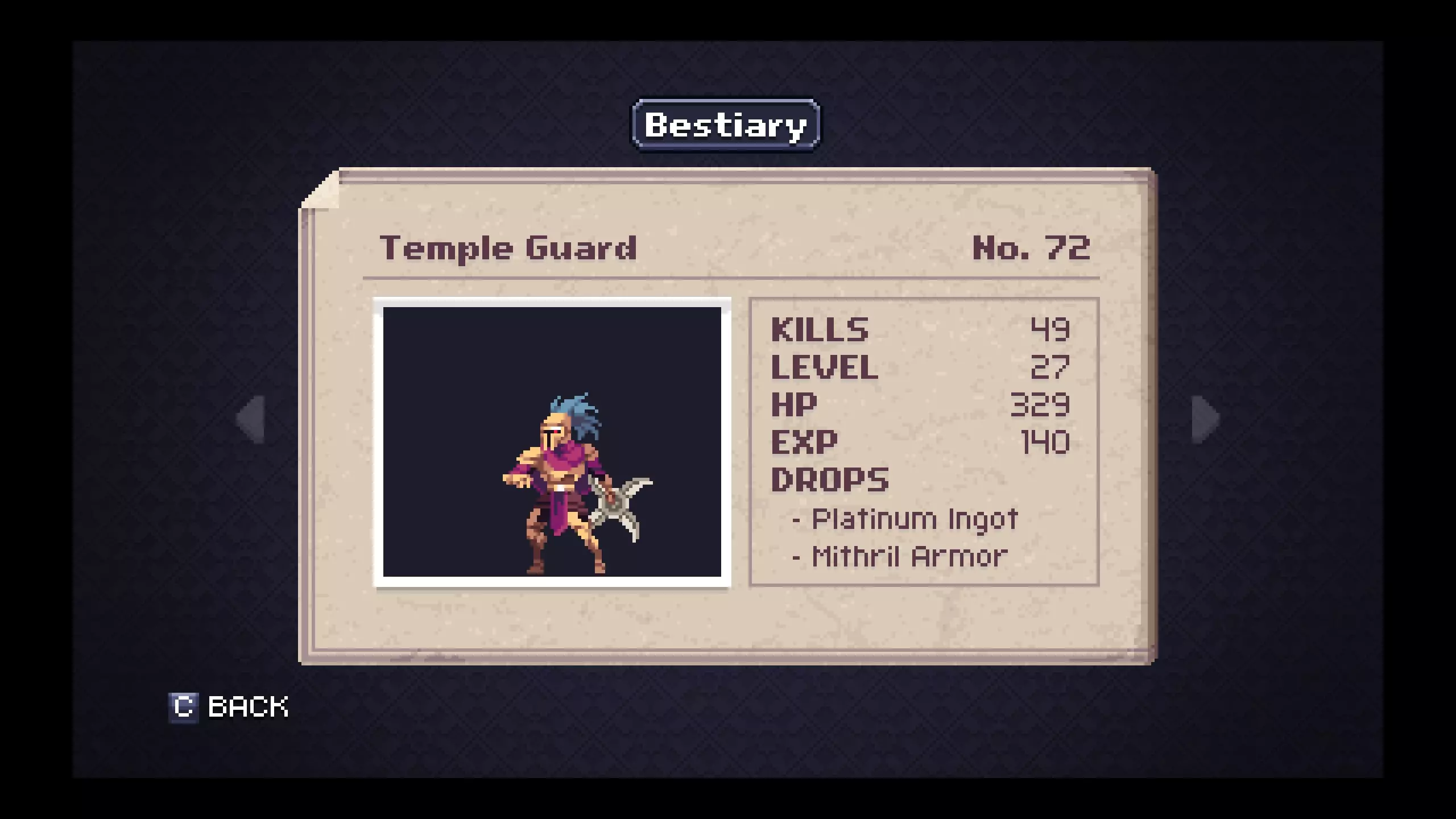 《深渊矿坑》怪物图鉴 - 神殿 笔记#72 - 神殿守卫是掉落【铂金锭】概率较高的最低等级敌人。游戏进行到这里,你应该已经获得了比铁匠能打造的更好的装备,但你仍需要一些铂金锭作为交给发明家的任务物品。 #75 - 皇家守卫是掉落【陨石锭】概率较高的最低等级敌人。我没发现刷这些东西有什么好理由,但也许你会有。 #79 - 拉多里女祭司会掉落【水晶法杖】,这是游戏中少数拥有投射物攻击的武器之一。对于某些游戏风格或特定的 Boss 战策略来说,这可能会很有用。