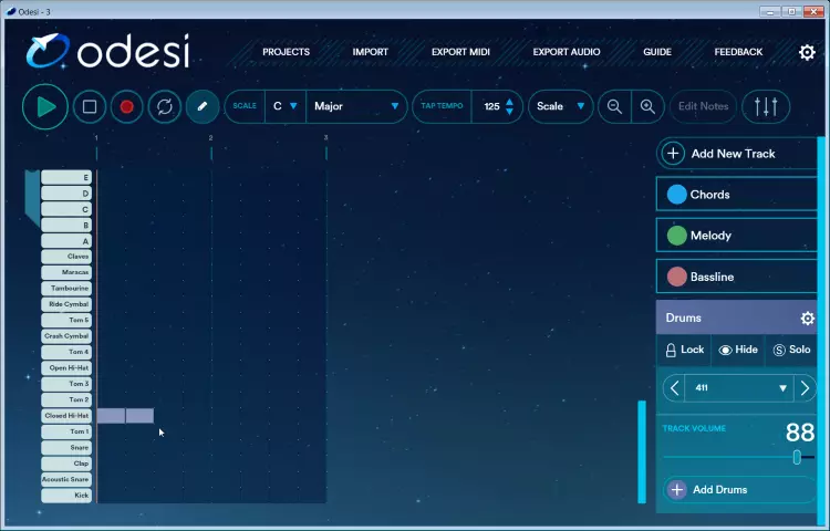 设置自定义节拍器 若你想使用自定义节拍器,可按以下步骤操作: * 首先,点击左上角的铅笔图标,确保处于铅笔模式。铅笔模式允许你添加和删除音符。 * 向下滚动至鼓组样本区域。 * 我个人喜欢使用闭合踩镲,所以会像这样在第1、2拍添加闭合踩镲。
