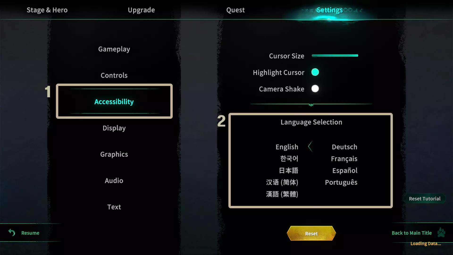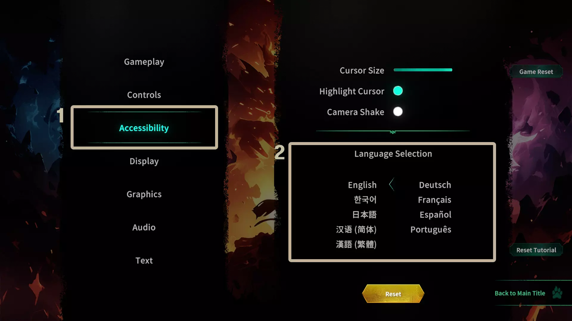在设置菜单中,点击高亮按钮【1】。 然后,在【2】区域选择你偏好的语言支持。 在游戏内: