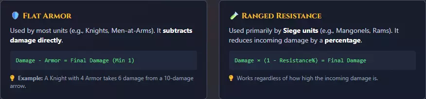 为什么40个诸葛弩能秒杀骑士?为什么弓箭手对投石机只能造成1点伤害?我们将深入探讨伤害公式与机制,并提供相关工具。 简介 你是否曾见过自己的军队在几秒内被击溃,明明以为占据优势却疑惑“怎么会这样”? 《帝国时代4》的战斗采用特定的数学公式。理解【固定护甲】、【额外伤害】和【百分比抗性】之间的区别,正是铂金玩家与征服者段位玩家的差距所在。 1. 黄金法则:伤害公式 与其他RTS游戏中护甲可能是百分比减免不同,《帝国时代4》的大多数单位采用【固定减免】系统。 公式简单却直接: 造成伤害 = 最大值(1,基础伤害 + 额外伤害 - 护甲) 这意味着什么? 基础伤害:单位的标准攻击力。额外伤害:对特定类型单位造成额外伤害(例如:十字弩手对重装单位)。 护甲:目标的护甲值。 ⚠️【仁慈伤害】规则(最低1点伤害)注意到公式中的Max(1, ...)部分了吗?游戏引擎强制每次攻击至少造成1点伤害,无论敌人护甲多高。 战术示例:这就是为什么大量诸葛弩(低伤害、高射速)能击杀帝国骑士。即使骑士有10点护甲,而诸葛弩原本应造成4点伤害(实际计算应为0),但每支箭仍会造成1点伤害。当40个单位每秒发射3支箭时,仅靠【仁慈伤害】就能达到120点每秒伤害。 2. 隐藏陷阱:护甲与抗性 这是大多数玩家感到困惑的地方。游戏中有两种防御系统。 A. 固定护甲(标准单位) 骑士、重装步兵和骑兵使用固定护甲。