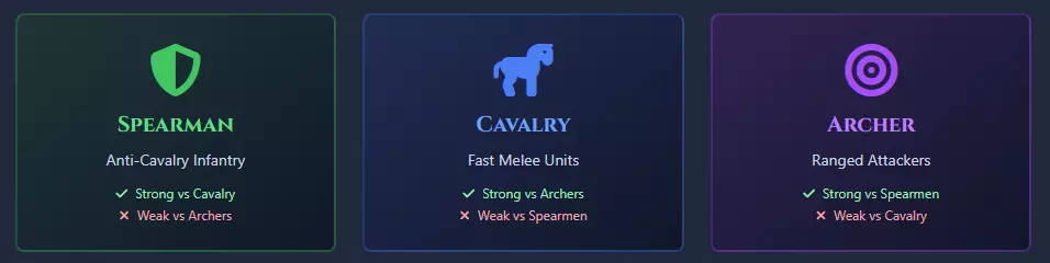 ✅ 专业提示:这就是为什么永远不要用弓箭手攻击投石机,而骑兵(近战伤害)能瞬间摧毁它,因为投石机的近战护甲/抗性为0。 3. 克制矩阵:强硬克制与经济克制 大多数玩家都知道基础克制关系(长矛兵克制骑兵)。