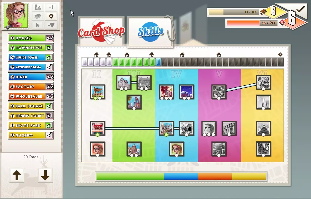 达成条件:建造20个地标。 地标是VI级建筑。要获得该成就,你总共需要使用20张这类卡牌(不必在一个回合内完成)。有三种获取地标的方式: 1. 使用VI级技能。 2. 在卡牌商店中,当获得足够科技达到VI级后获取。 3. 使用【音乐厅】的效果,这是一张只能通过莱妮的V级技能【摇滚呐喊】获得的卡牌。 获取该成就最快的方法之一是使用伊夫·洛朗的技能。在单人模式中以伊夫开启自定义无尽游戏,并选择最高初始购买额度。在你的卡组中放入一些【工厂】/【批发商】卡牌(它们是I级卡牌中能提供最多经济的)。开始游戏时,购买【特殊】技能,该技能能让你在整个游戏过程中更换卡牌商店中的一张卡牌。然后,尽可能购买更多卡牌来提升你的科技值。除以下技能外,你可以忽略其他所有技能: 【科学自动机】(三阶):为你提供+3科技值。 【东一点西一点】(三阶):为你提供一张【服务器农场】卡牌,每次使用该卡牌最多可获得+6经济值。 专注购买能提供高经济值或额外购买次数的卡牌,以更快提升科技值。以下是你应留意的卡牌: 二阶: