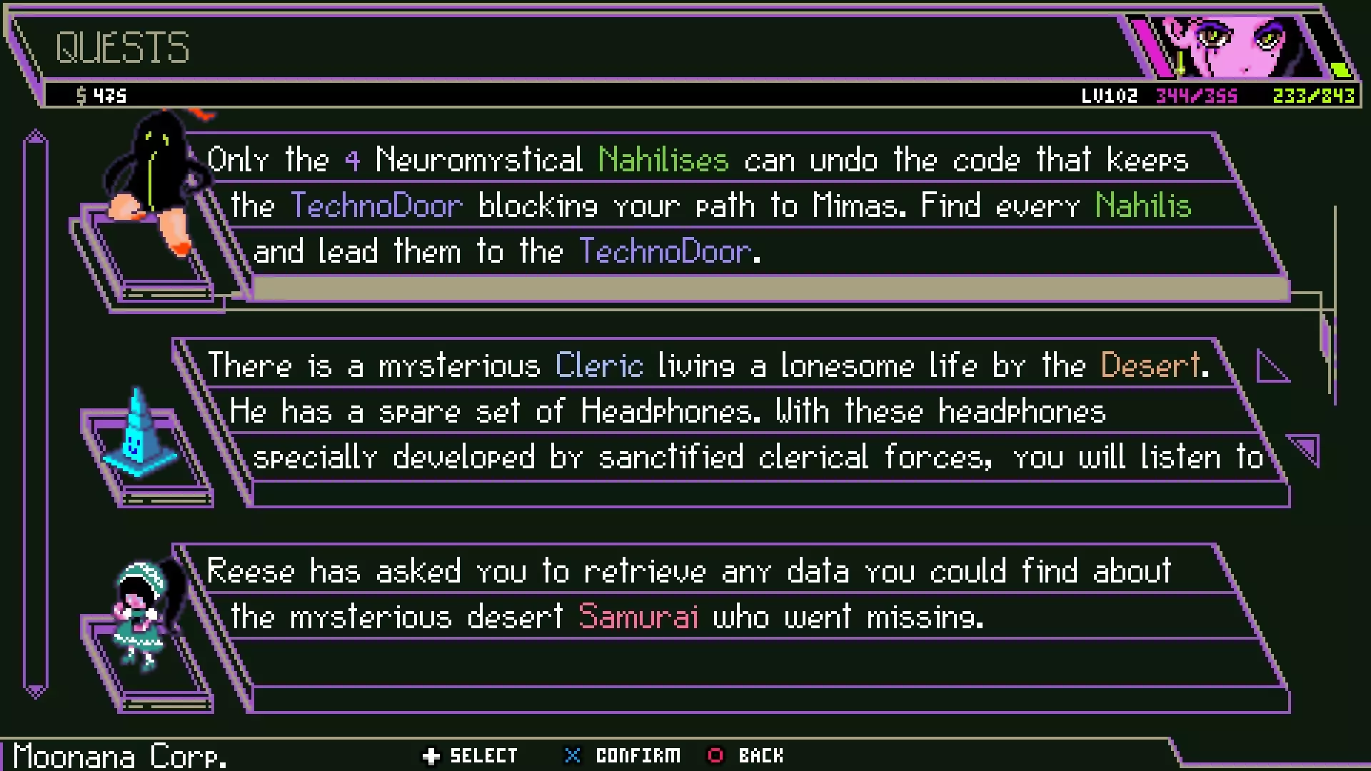 精灵机器人就是你要找的机器人。 ==存档 存档恐龙说它不会吃掉旧存档,这可不是开玩笑的。这能有效记录你的游戏进程,让你在觉得犯错或想尝试新玩法时,随时回溯到任何旧存档。 这个设定比较烦人的地方在于存档的管理。你得通过时间、队伍和角色等级来判断每个存档文件的内容。如果你担心之后会搞混,那可能就不宜太频繁地存档。 不过无论如何,存档功能还是相当实用的,你可以随时随地存档,不管那些恐龙是否真的在沙地里引发地震(“地震”这名字听起来像个金属乐队名)。 ==可错过内容 别为此焦虑。只需知道,一旦你通关某个章节,就无法再返回了。所以记得经常存档,一旦担心错过什么收集品或操作,只需重新加载到该阶段结束前的存档即可。一些小互动也可能会被错过。某些事情的严格时机是无法避免的,这只是这款游戏的一个特点。如果你熟悉FromSoft的游戏,那你应该已经了解这种情况了。不过与FromSoft不同的是,我们有Moonana Corp.和存档恐龙。你不会在游玩了40小时后,因为一个不幸的操作或难以理解的对话而搞砸整个流程。只需重新加载存档或继续前进。一旦熟悉了关卡,通关并不难,所以重玩也不一定那么令人望而生畏。 ==演唱会 准备好唱歌时就和存档恐龙对话。结合游戏内的事件发展,你会明白何时该这么做。当歌曲播放期间有伏特能量可用时,你可以按下X/A键暂时使分数翻倍。 屋顶直升机部分 在声波城,有一个关于用星星击退直升机无人机的场景,但没有说明你要寻找什么。收集所有星星,不要被发现。你不是在用星星寻找某个东西,实际上你要找的就是星星。 职业 - 第一部分(及选择) 理想情况下,你应该选择自己喜欢的职业。你无法在单次游玩中体验游戏的所有内容。你在游戏中做出的决定会影响后续的互动和遭遇。有些决定在游戏玩法层面有意义;有些则仅在个人体验层面有意义。所以除非你已经听说过【最佳女主角】并一心想和她发展浪漫关系,否则不必为在这里做出错误决定而感到压力。如果真是这种情况,那就“醒醒吧,武士。” 实际上,与角色发展浪漫关系只对众多结局中的一个有影响。所以如果这是你的第一次游玩,最好选择你感觉最投缘的选项。如果你不知道【巨鲸】是什么,不用担心。你大概能推断出【序列器】很特别,因为它们不需要它。当你了解【先驱者】和【武士】的历史时,你不需要知道【土星】历史和政治的具体细节。当你从【黑客】身上感受到【矩阵】的氛围时,你也不需要知道【密钥库网络】是什么。游戏并不想捉弄你,没有诱饵和陷阱。选择感觉对的选项,你会更享受游戏。别想太多。 如果你只是为了游戏玩法,这里有更深入的内容。