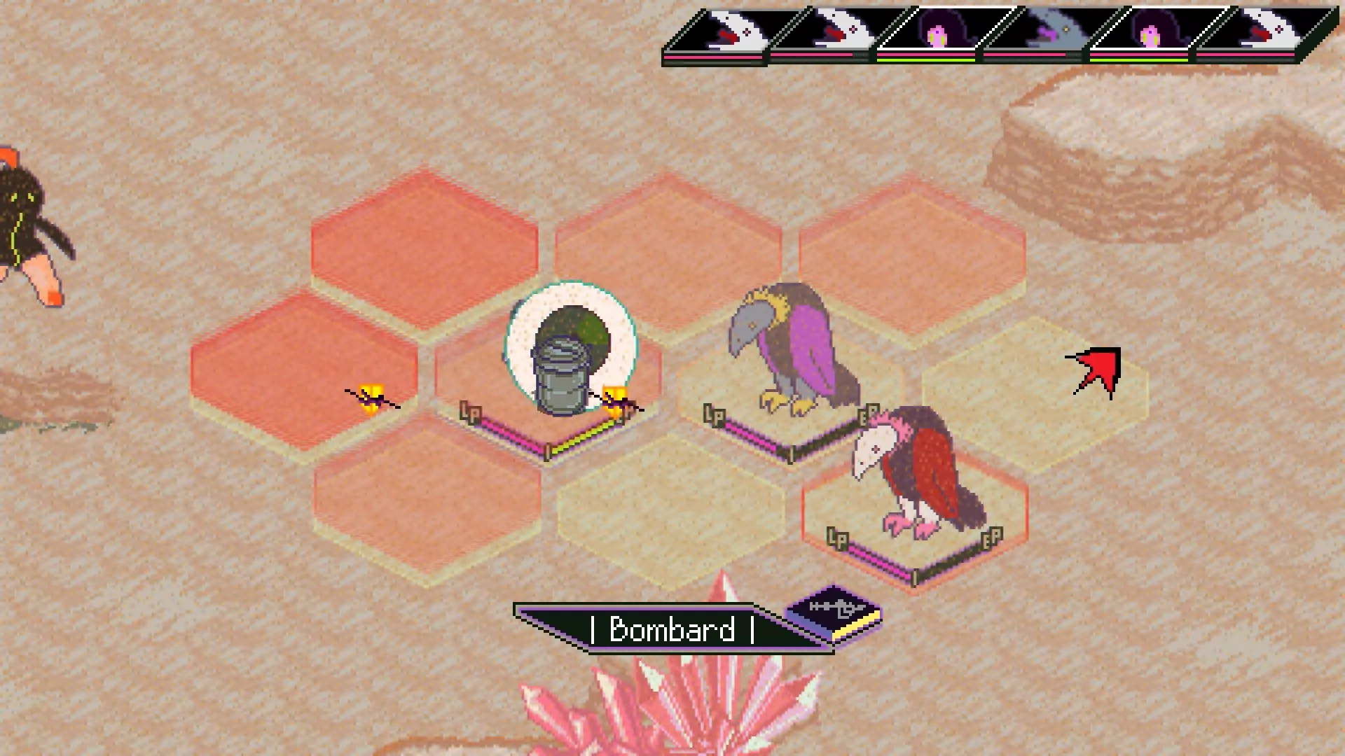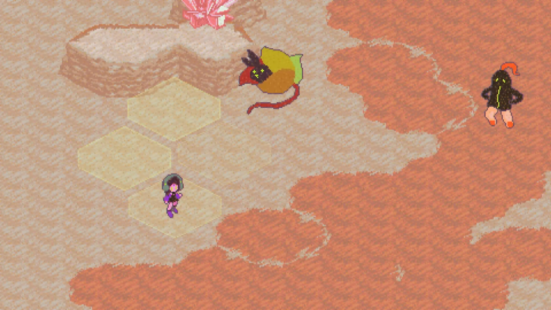 如果你和我一样,可能第一次在凯梅尔沙漠里与秃鹫战斗时看到这些东西,觉得它们看起来像箭头。然后你可能会试图避开它们指向的格子,或者根本不在意,因为你不知道它们有什么作用,这可能会让你出戏。 这种情况其实是一种名为【意志力】的状态。它能确保站在带有该状态格子上的角色,其下一次造成伤害的效果必定暴击。技能也可以暴击。 这里有个通用规则:所有效果只影响它们所在的格子。忽略那些形状。 如果你在游戏中收集USB,通常在遇到某些效果对你生效之前,就能在游戏中读到它们的大部分作用说明了。但在第一章,情况并非如此。刚开始需要了解的是,状态效果会作用于格子,而非一定作用于角色。状态效果可能因格子上的角色而锁定该格子,但离开格子后,该状态效果(增益、减益或脉冲)会留在原地。随着游戏进行,你会逐渐了解各种效果的作用,其中一些是很直观的。 如果愿意,你可以浏览【技能树】来熟悉部分技能效果。 使用技能和状态效果时存在一个缺点:当你对敌人使用带有状态效果的技能时,如果盟友处于该技能的作用范围内,盟友也会受到相同的状态效果影响。注意:盟友不会受到普通攻击的伤害,但会受到技能伤害,并且会完全受其陷入的任何效果影响。注意。 技能树、钥匙与等级提升 ==钥匙 钥匙=技能点 参与更多战斗,就能获得更多钥匙。你也可以在野外找到钥匙。入侵某些敌人也会给予大量钥匙(会有提示)。 有钥匙刷取点吗?我知道一个。凯梅尔沙漠中有一朵黄色花朵,会掉落30把钥匙,这在 boss 战之外是相当多的数量,并且每次重新加载该区域后它都会刷新。它距离东南出口也不远。