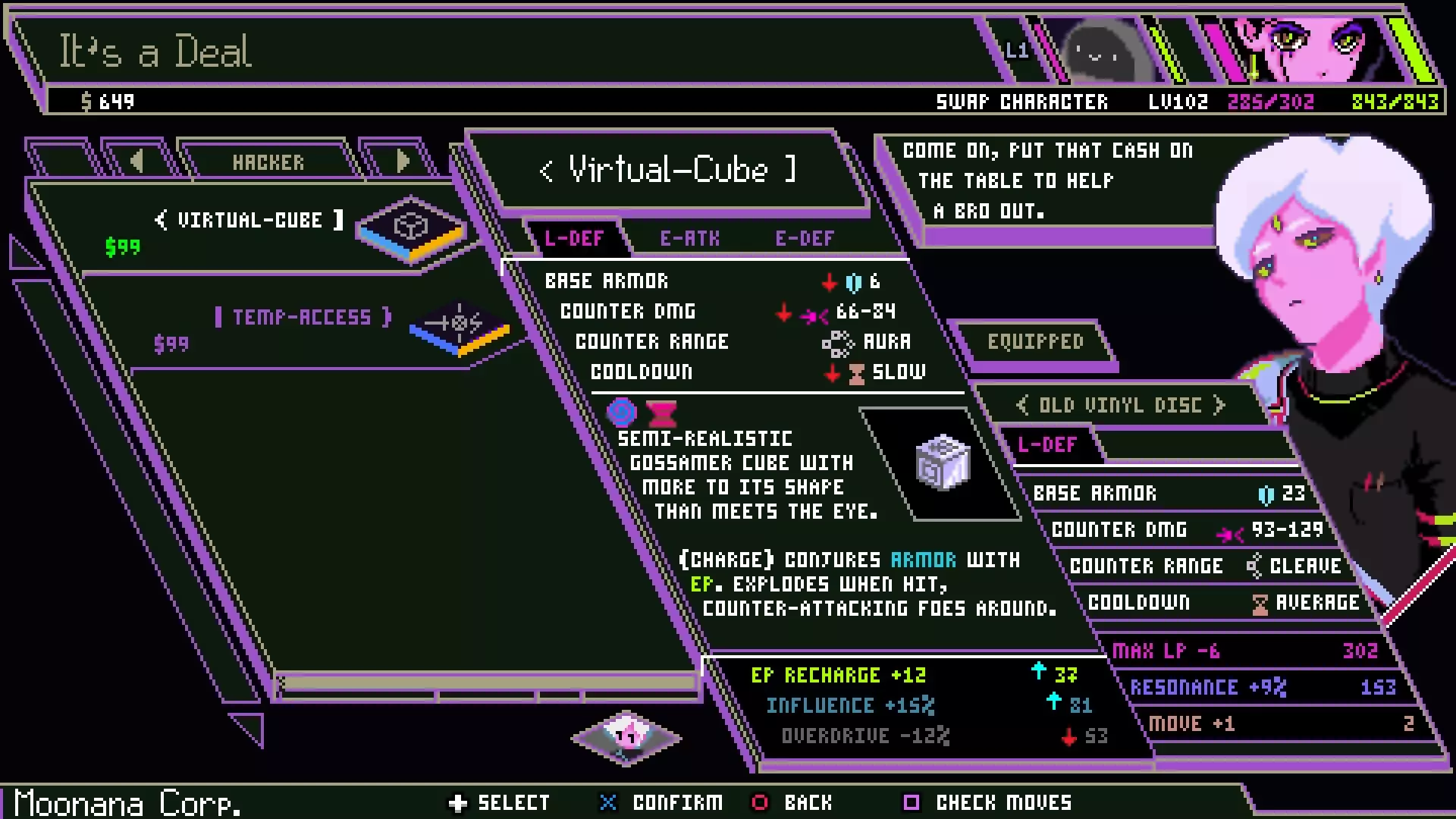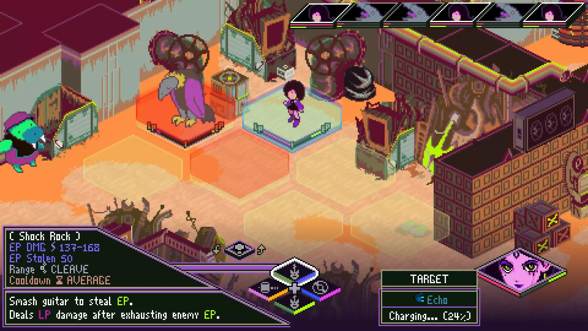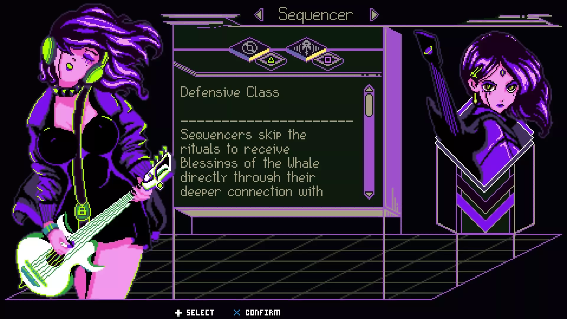 这些是“防御型”职业。他们技能树中的技能专为技能效果、反击、能量值支援、生命值支援和移动而设计。不过,他们在进攻方面绝非弱势。这些技能更侧重于反应和支援,而非全力进攻,这使得战斗方式更具策略性和趣味性。 武士:优势:武士刀、最佳伙伴、武士道、甜甜圈!(以及自动格挡、反击、丰富技能、技能冷却缩短、强大暴击支援和多种武器) 这无疑是所有职业中操作最复杂的一个。如果你不喜欢在角色build或行动上费心思,这个职业可能不适合你。话虽如此,一旦你搭建好一个有效的配置并开始发挥作用,会带来极大的成就感。这个职业的速度确实偏慢,而且不像其他职业那样容易维持能量值。因此,它在游戏初期的节奏(比喻意义上)会比较缓慢。该职业不太注重快速压制战术和能量值。打造一个优秀的武士build的关键在于,将技能巧妙地配置到行动上,并运用策略让行动和技能形成良性循环。例如,你先用能量攻击突破敌人的能量防御,但你知道挥砍之后会面临反击,所以给能量攻击附加一个自动反击技能来进行防御;而且由于你刚刚汲取了一些能量,这个反击会得到强化并造成生命值伤害。之后给那个技能加上反击 buff,或许再加上意志力,这样就能确保后续攻击必定暴击并重置技能冷却,从而让你的防御始终保持在线。 如果你喜欢集换式卡牌游戏,可能会喜欢武士职业。培养它可能感觉有些繁琐,但当它开始流畅运作且停不下来时,那种满足感是无与伦比的。 序列器:优势:氛围拉满;兄弟,太酷了;你是独立自主的个体,不需要教会,用自己的双耳就能聆听“神谕”(你还快得飞起,能量值恢复比劲量兔子还快,生命值恢复量多到让你再也不需要奶昔,并且能在不牺牲进攻或防御能力的前提下支援整个小队)。 希望你一听到序列器那超赞的旋律就会想:“我想要这个。”如果不是这样,以下是我对序列师的看法:“力量掌控一切,没有EP,你就无法保护任何东西,更不用说你自己了”——大概是这个意思。选择这个职业,你永远不会缺乏资源。到第四章时,你单次行动就能恢复超过40点LP和600点EP,并且可以将所有EP以纯粹的 brute force 转化为强大的攻击,其威力足以与进攻型职业相媲美。 这个职业的优势在于资源生成和移动能力(比如在战斗网格上的实际移动)。将属性点投入到能让你与进攻型职业比肩的超强资源生成能力中的缺点是,这会使你变得极其脆弱,容易被一击秒杀。 这是一个高度灵活的职业,其玩法会随着你的build而变化。 “像水一样吧,朋友。”属性 LP = 生命值 EP = 电力值(可用于生命值攻击和生命值防御行动的能量值,同时也是对抗电力特定攻击的第二条生命条) Dissonance = 生命伤害 Life Res. = 生命防御 Resonance = 电力伤害 Electric Res. = 电力防御 Influence = 技能伤害(注:技能伤害可暴击) Special Res. = 技能伤害防御 Critical = 每次攻击造成额外伤害的几率 Overdrive = 额外伤害数值LP合成=每回合被动生命恢复 EP充能=每回合被动电力值恢复 速度=你的行动回合数以及行动顺序 战斗(你可能来此的原因) 当你进入游戏时,你并未拥有所有基础战斗选项(除非你使用预设配置——不过现在不用担心这个)。以下是基础介绍。