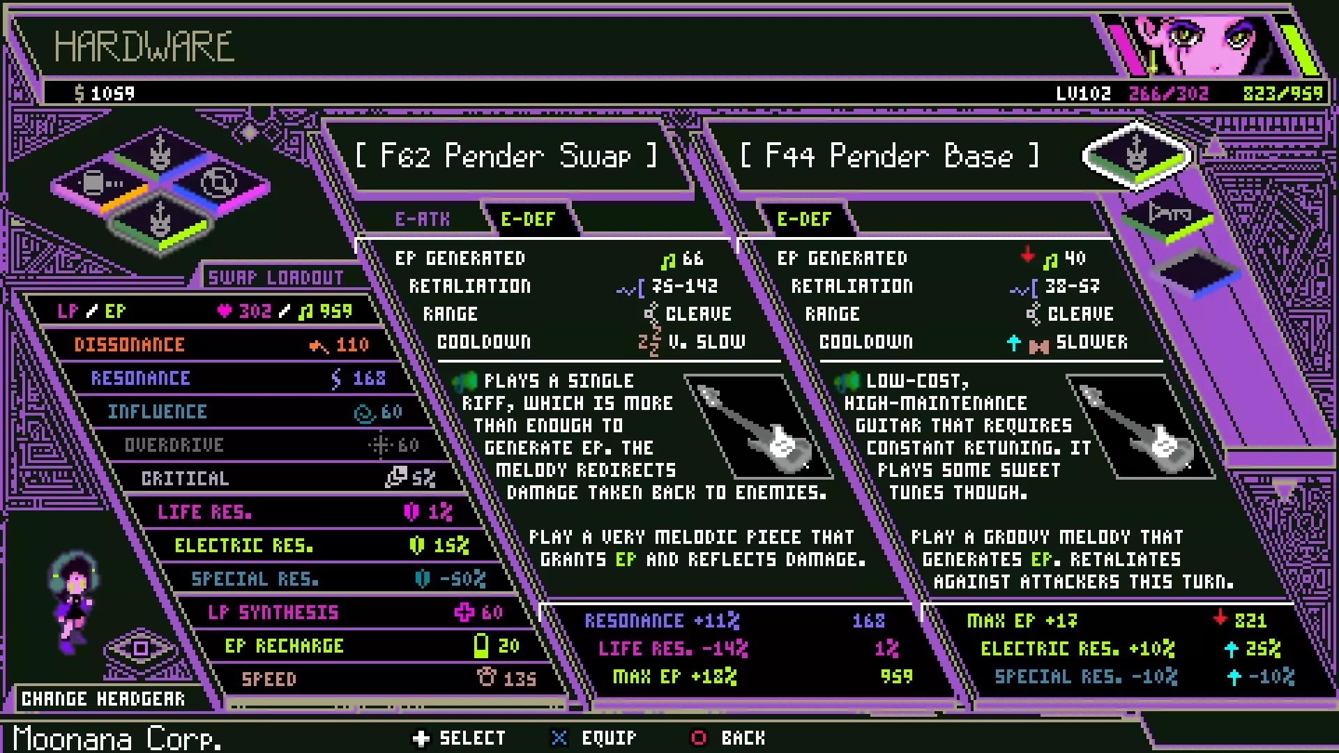 不那么直观的是如何读懂这个界面。问题在于它看起来似乎很简单。 游戏已更新,此部分内容将在未来几天内更新。上方图片未反映游戏当前版本。 彭德交换款和彭德基础款是类似的吉他。单看这个界面你不会知道这一点。请注意反击伤害属性。据此来看,交换款显然更优,但如果我们切换装备的话,彭德基础款会更出色。这是为什么呢? 在此菜单中,已装备的物品会应用你的属性。该菜单无法正确显示两件装备之间的属性差异。你必须分别装备每件装备才能分辨它们的区别。这一点同样适用于物品卡片底部的属性变化。例如,如果你查看【彭德交换】的右侧,会看到一些随机的静态数字,这些是装备该物品后的属性值。但如果你查看【彭德基础】,会注意到上下箭头,它们似乎表示武器的优缺点。仔细看看【特殊抗性】:上面显示【特殊抗性】-10%。现在看看最左侧我实际的属性,【特殊抗性】已经是-50%了。所以这把吉他应该会让我的【特殊抗性】变成-60%,但物品卡片最右侧却也显示-10%。不要依赖这种对比布局,它具有误导性。 如前所述,上述信息并不反映游戏的当前版本。物品间的属性可以按照常规直觉进行正常比较。百分比和固定数值的显示方式不同,但它们都对应着相关属性。物品卡片的数值是可信的。 同时请注意固定数值加成和百分比加成的区别。两把吉他都提供最大能量值加成,但一把是+18%,另一把是+17点。武器也会从自身的属性加成中获益,例如这里的【彭德转换】及其【共振】加成会提升反击伤害。 冷却时间指的是通过技能树施加到武器上的技能的冷却时间。 ==技能树武器 总体来说比较直观,但有两点不是特别清晰。部分技能会提升武器的速度。这意味着在战斗中使用该武器执行动作所占用的时间更少,实际上也就意味着你在战斗中能获得更多回合。如果你留意回合顺序,切换装备组合并选中同一个动作时,就能看到这种变化。简单来说,这能让你更频繁地行动。 其他一些技能树能力会为武器附加冷却缩减效果。这里指的是通过技能树施加到该武器上的技能。如果你给锤子附加了大量冷却缩减,而该锤子装配了治疗技能,那就意味着使用锤子攻击时,治疗技能的触发频率会更高。 ==装备组合 装备组合能让你灵活多变。例如,当洛克特首次可操作时,他只有两件武器。装备配置实际上使这变成了四个。