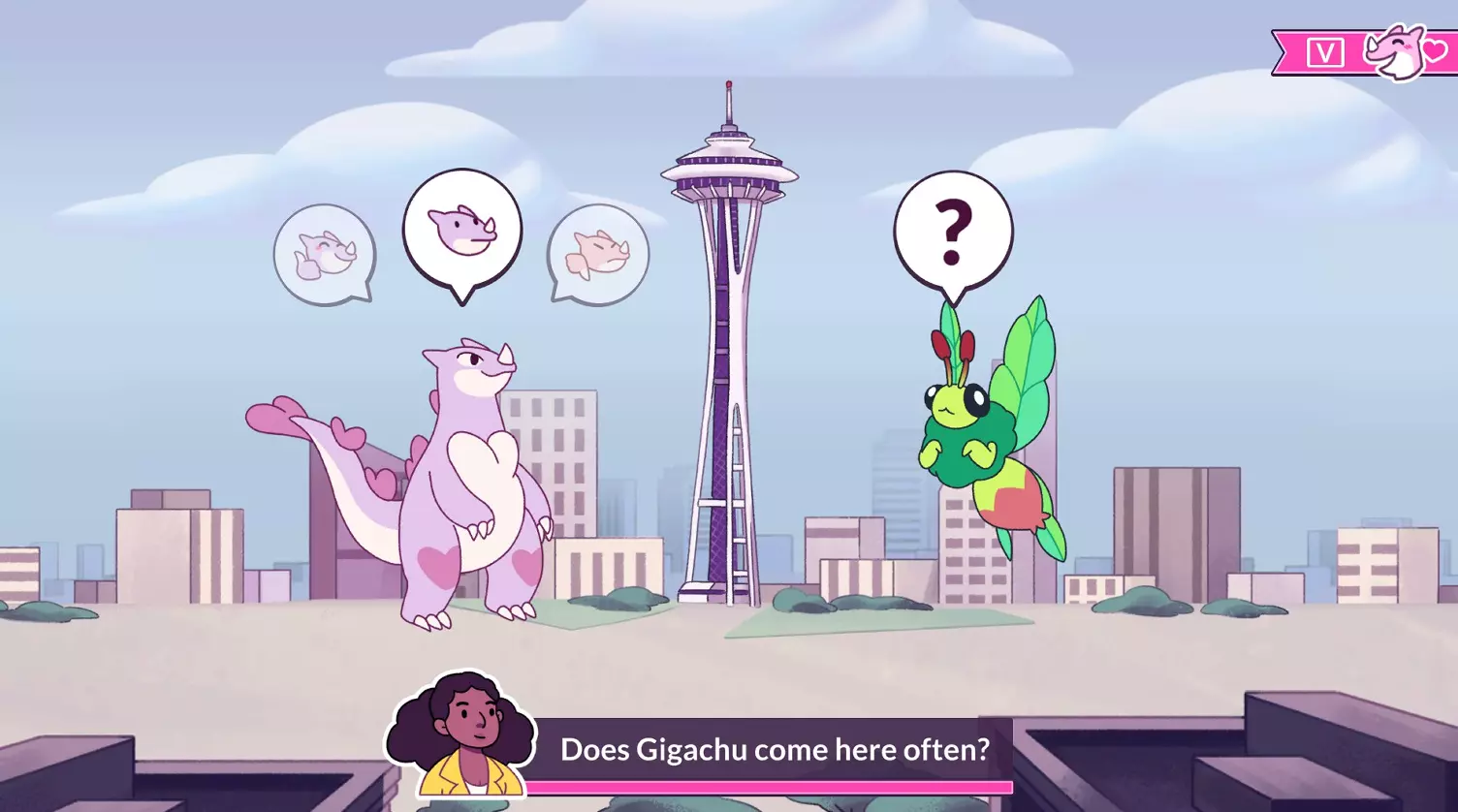 吉加丘目前心仪的对象!这位可爱的怪兽十分重视家庭与善良。 约会机制快速说明 要开始追求任何一只怪兽,你需要操控吉加丘移动到怪兽身边,然后带领它们前往一个地标。通常来说,地标本身并不重要,但你需要记住第一次约会和初吻的地点。如果你的第一次约会进展顺利,这两个地点通常会是同一个地方。
