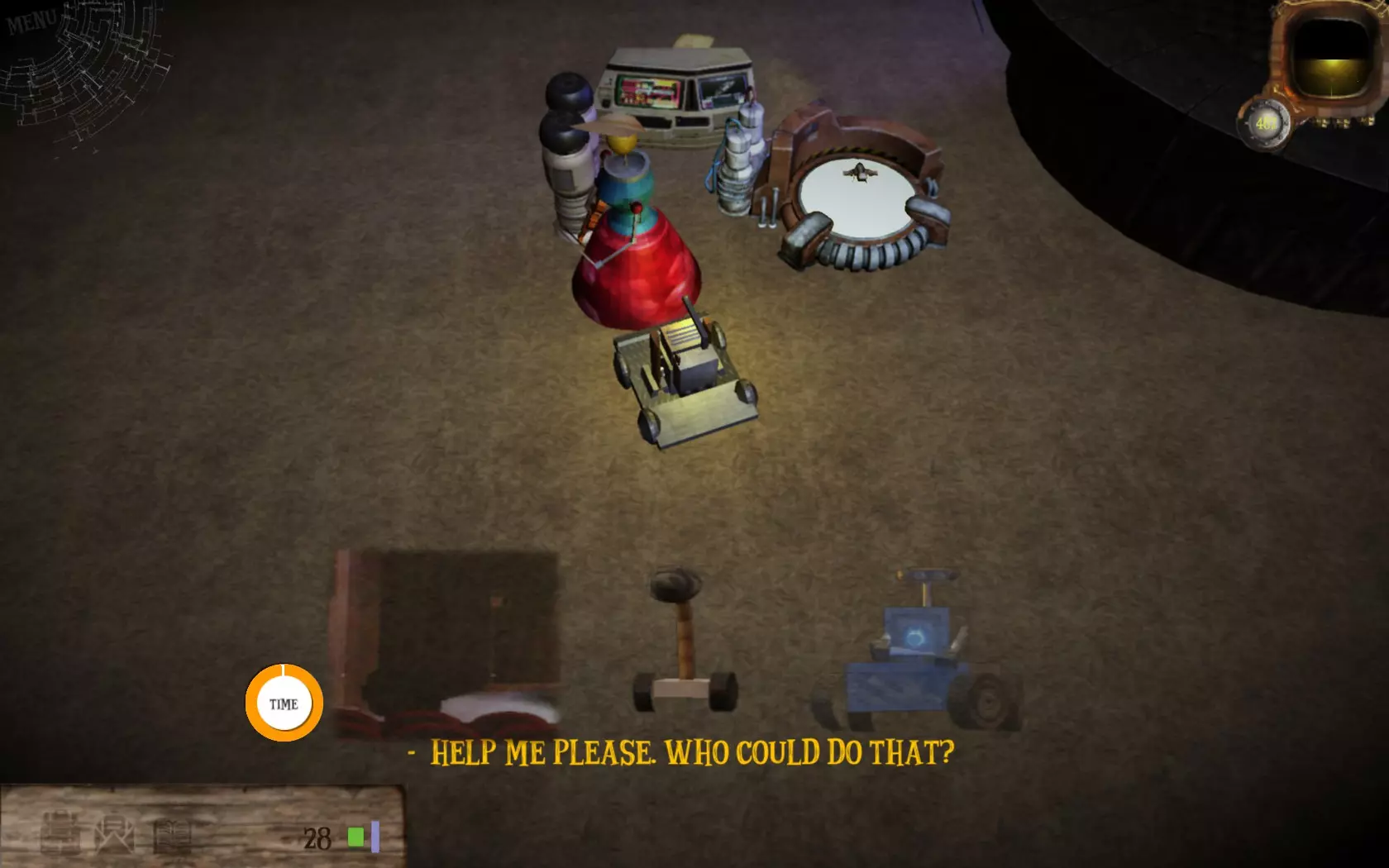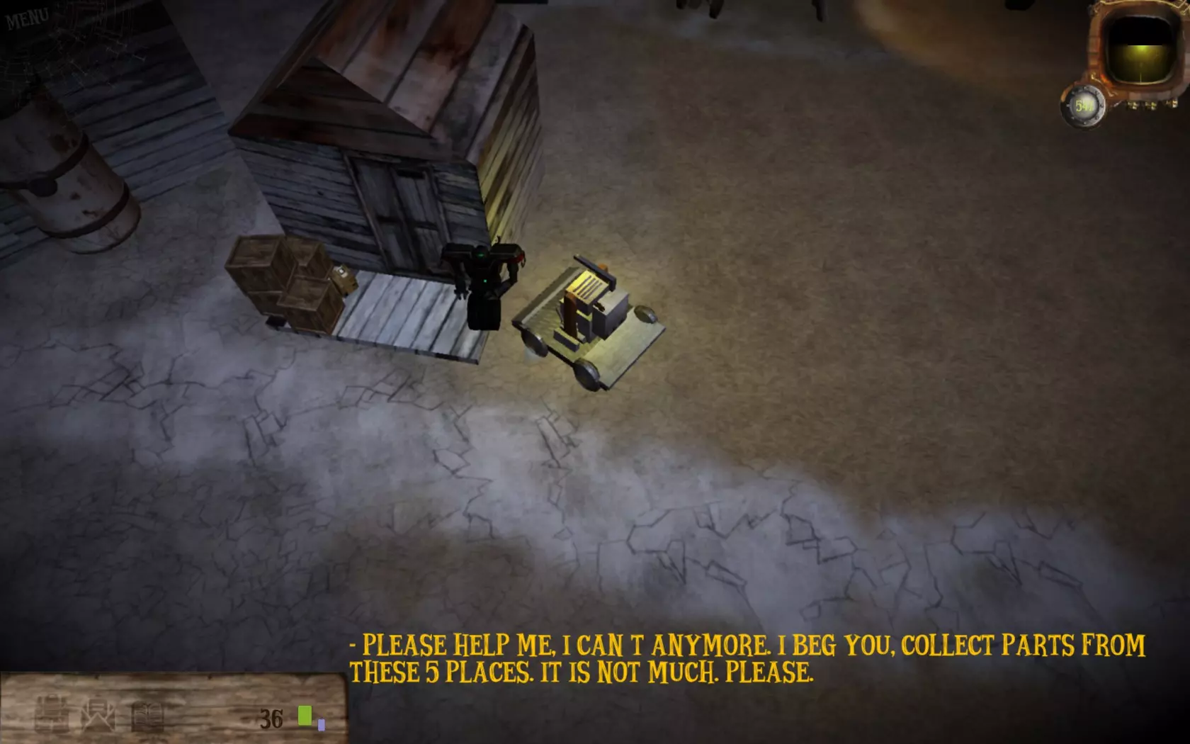 恩人 为那些无法行动的人效力 与途中遇到的黑色机器人对话 从所有标记的箱子中收集废料并返回给他