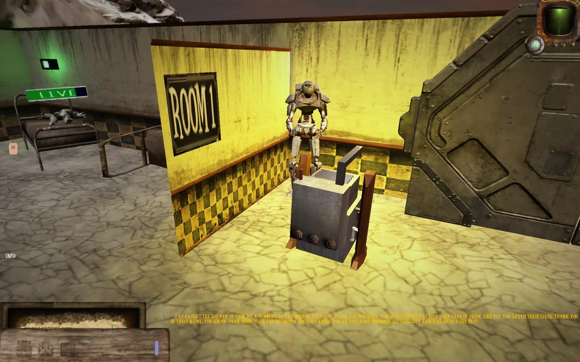 生命守护者 为那些拯救危难者而设 到达医院后,通过无线电与医生交谈并遵循其指示。治愈第一个机器人后,前往3号房间(最里面的那个),询问医生他们的情况。 经过一番询问,灯光会闪烁,你需要恢复电力。 之后,你需要迅速将所有机器人带到维修室,确保无人死亡。 如果成功,你将看到此画面。