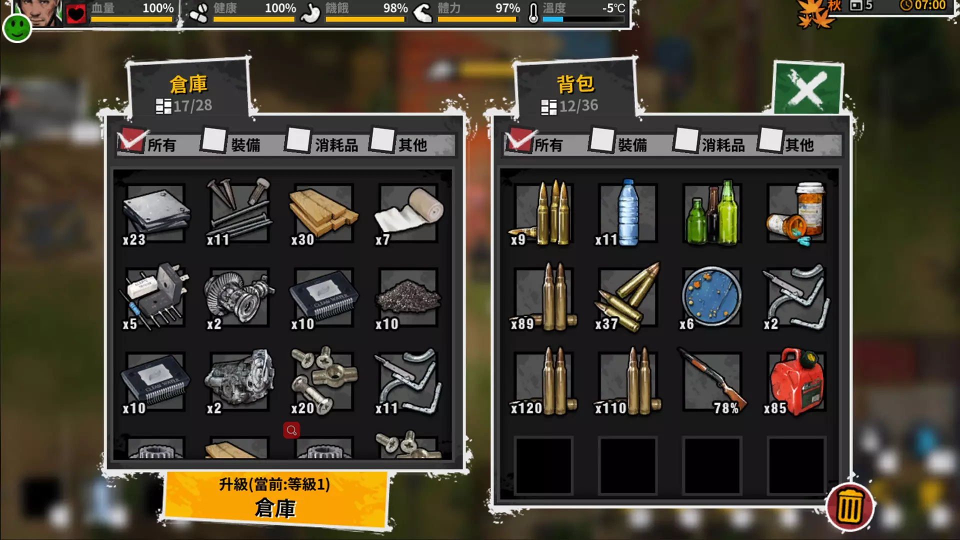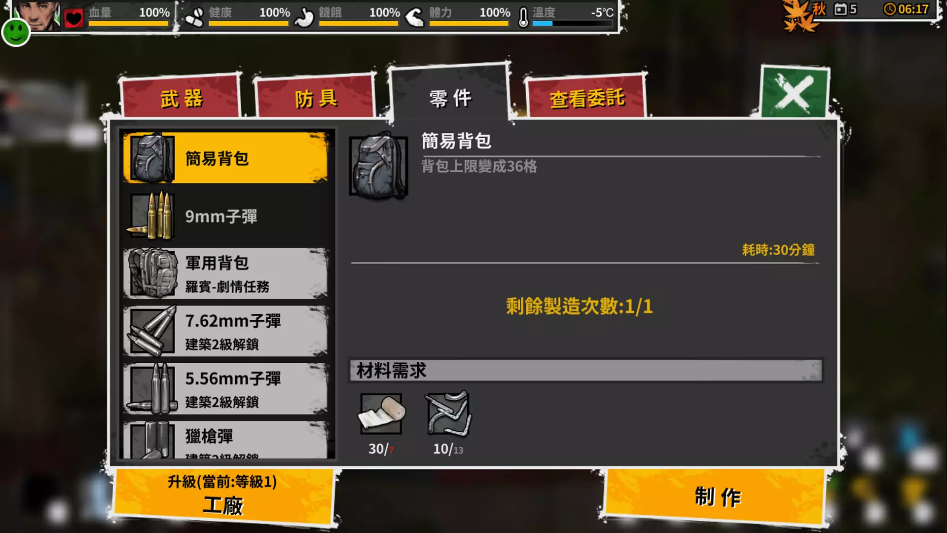 当然,无论是沉迷于消灭丧尸,还是为了恢复战斗消耗的血量,都会浪费大量时间。而时间非常紧迫,丧尸会随着时间的推移变得越来越强大,并且入侵营地的几率也会越来越高。因此,尽快收集资源、升级装备和营地才是正确的做法。如果前期沉迷于击杀丧尸,后期可能会在面对成群丧尸入侵时束手无策。 背包、仓库、围墙 在《迷城重生》中,你需要经常去收集各种物资,但初始背包容量较小,这会导致每次外出探索资源的时间都很短暂,必须匆忙返回营地处理收集到的物资。甚至可能在探索过程中,因为背包空间不足而无法拾取更多物资,这无疑会让你感到非常沮丧。这个时候你是否需要建好工房制造一个容器背包来提升你的探索容量呢?当然这交给你们自己去决定了