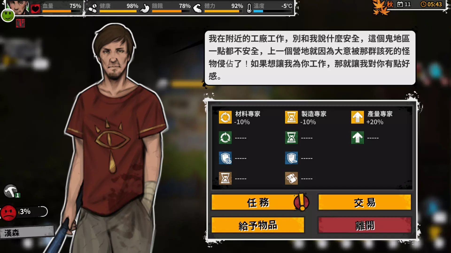 但其实招募幸存者是一次非常划算的投资行为。前期有了幸存者之后会方便很多,很多事情都可以委托幸存者去做,而后期幸存者更加重要,一些建筑甚至需要有幸存者的参与才能建成。甚至有些幸存者和其交易的时候你会发现他们有很多东西值得你去交换,尤其是在你缺少这些物资的时候。