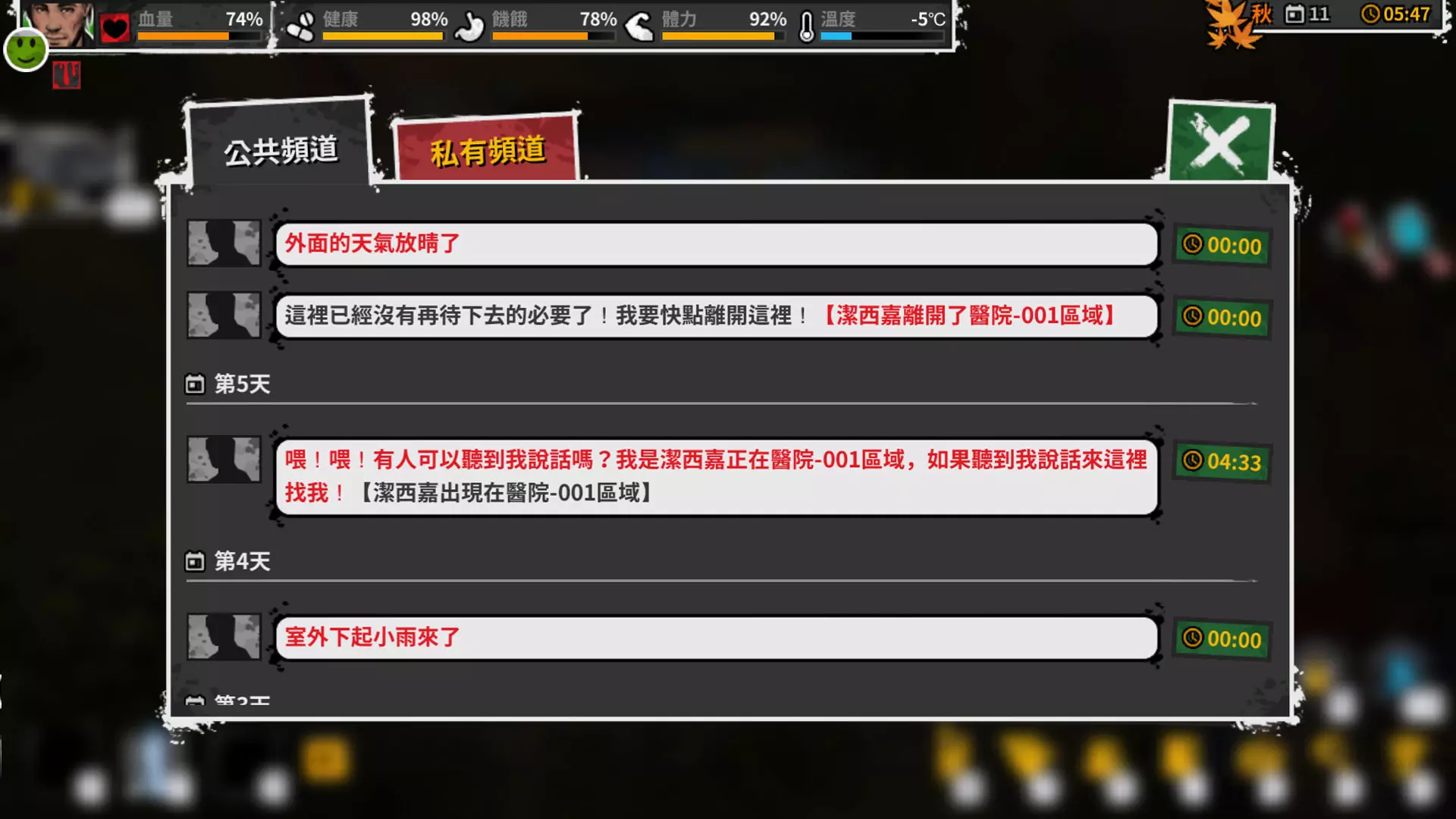 不要错过幸存者 那些所见到的末日幸存者 在探索世界地图的时候,你可能会发现很多带有人物头像的小地图区域,里面有幸存者正在向你呼救,这个信息可以从电台中获得(当然他们离开时,也会在电台中告诉你)。