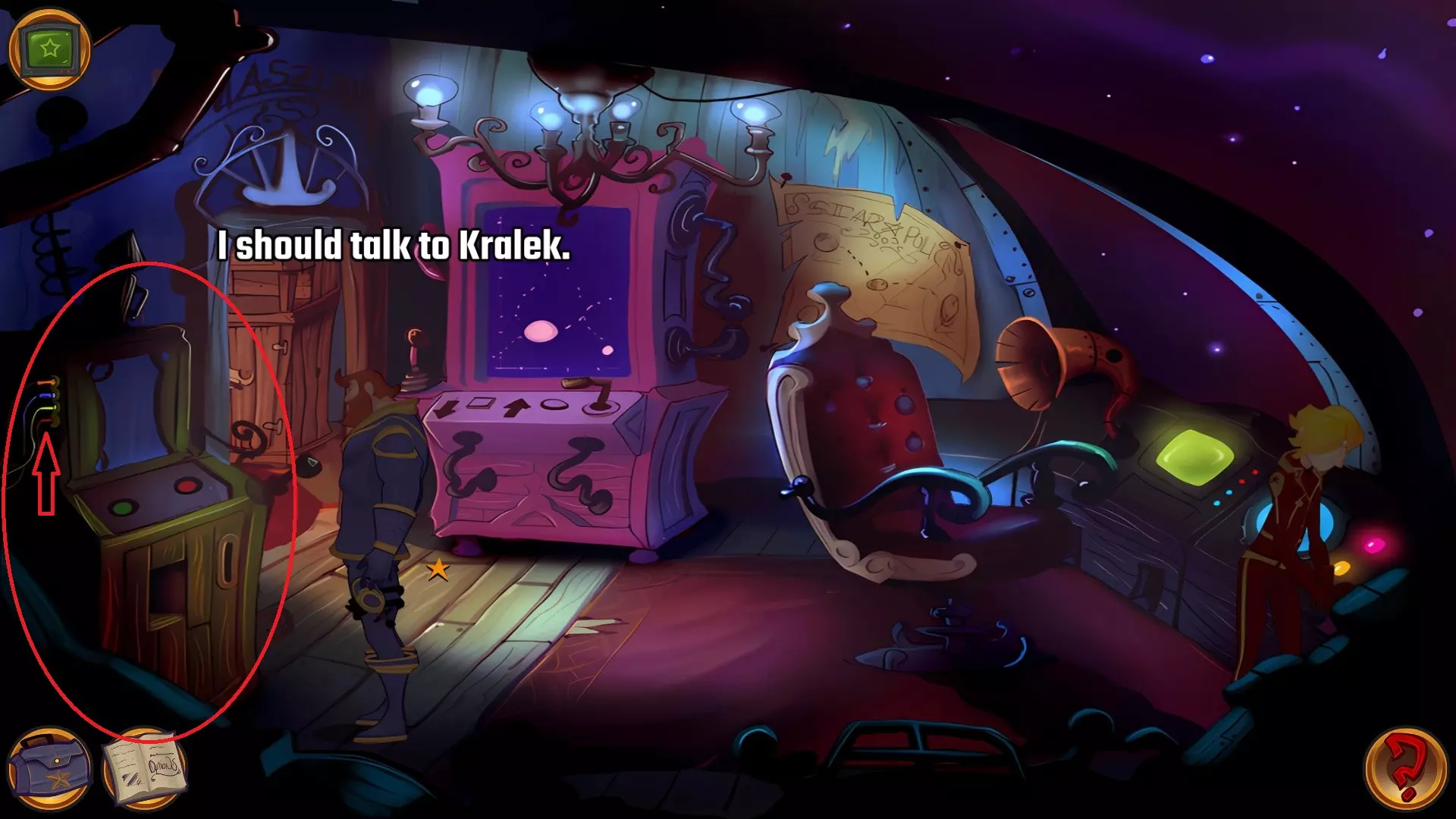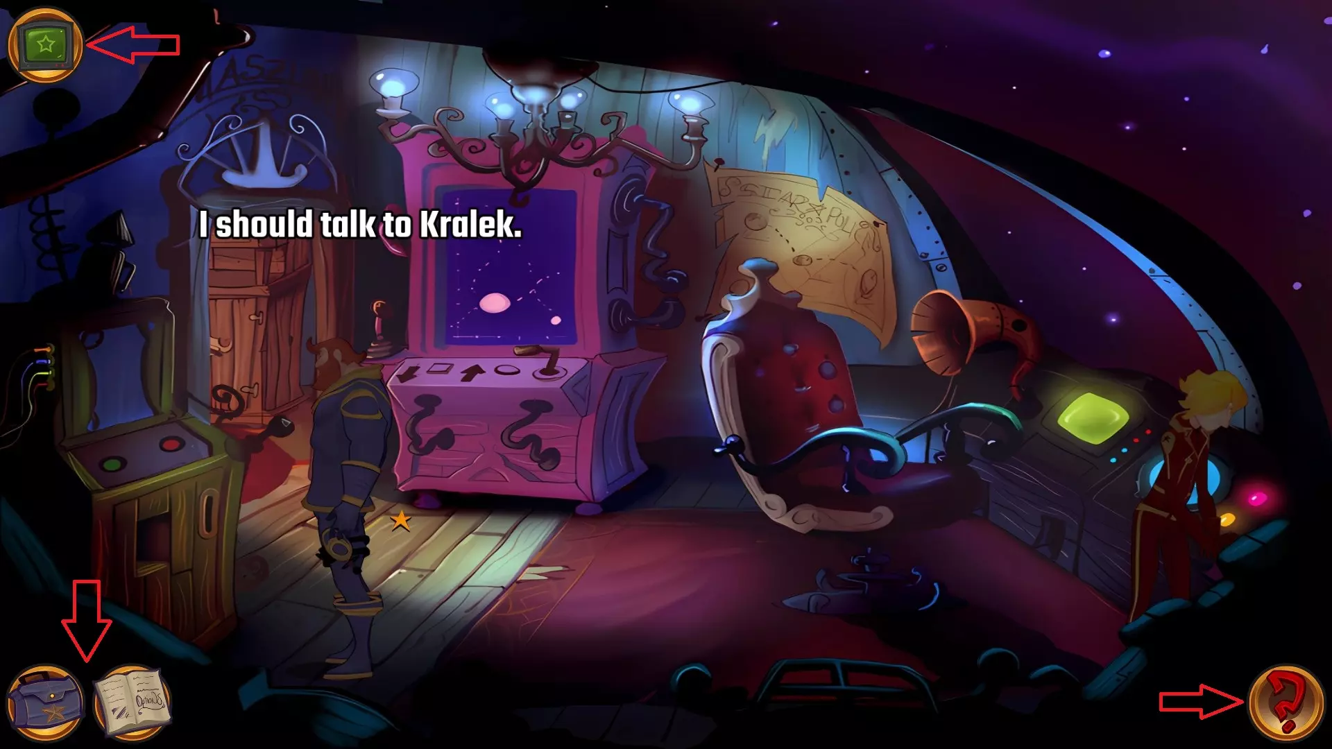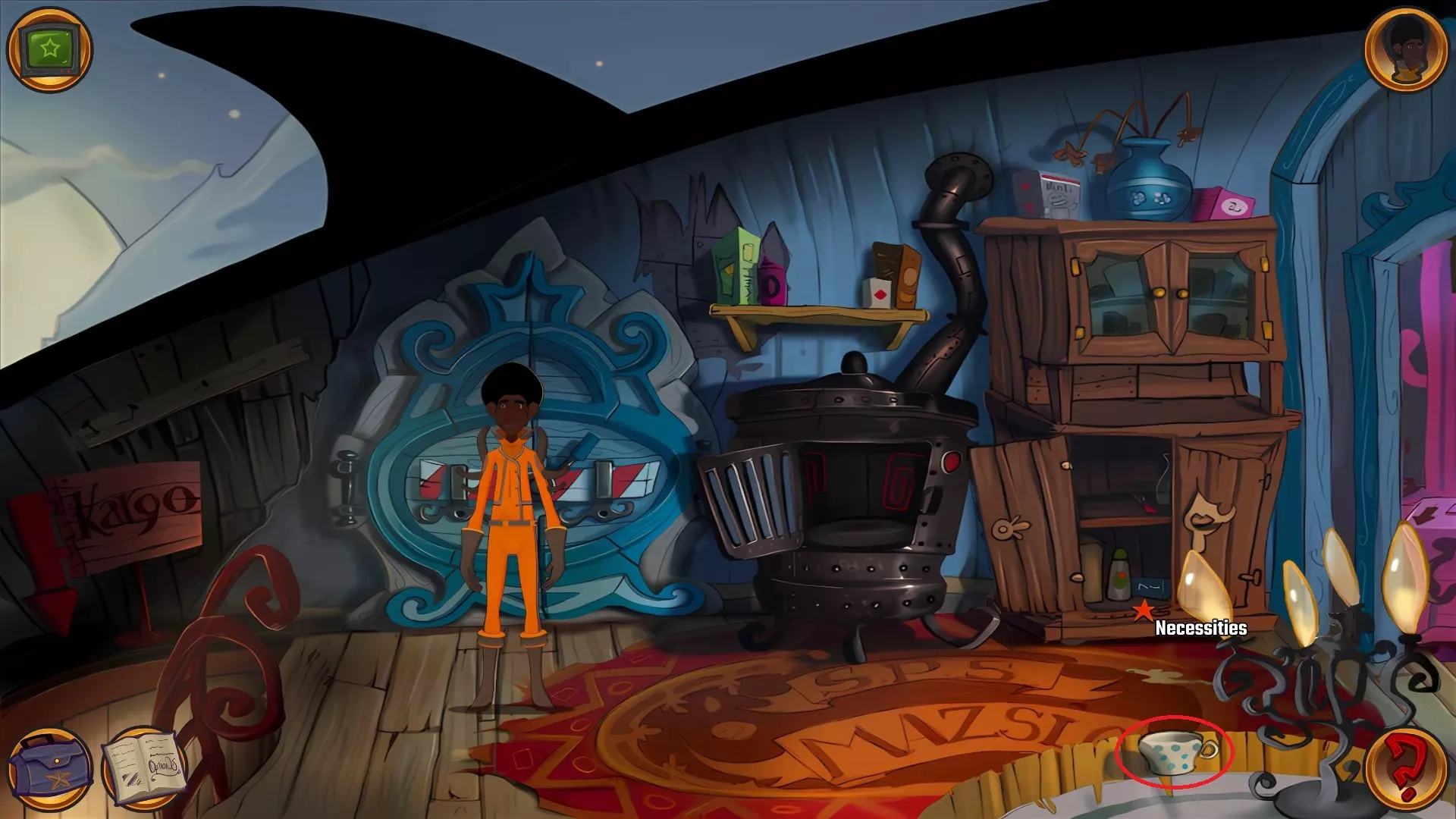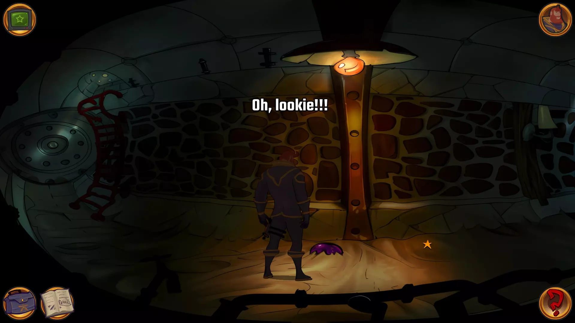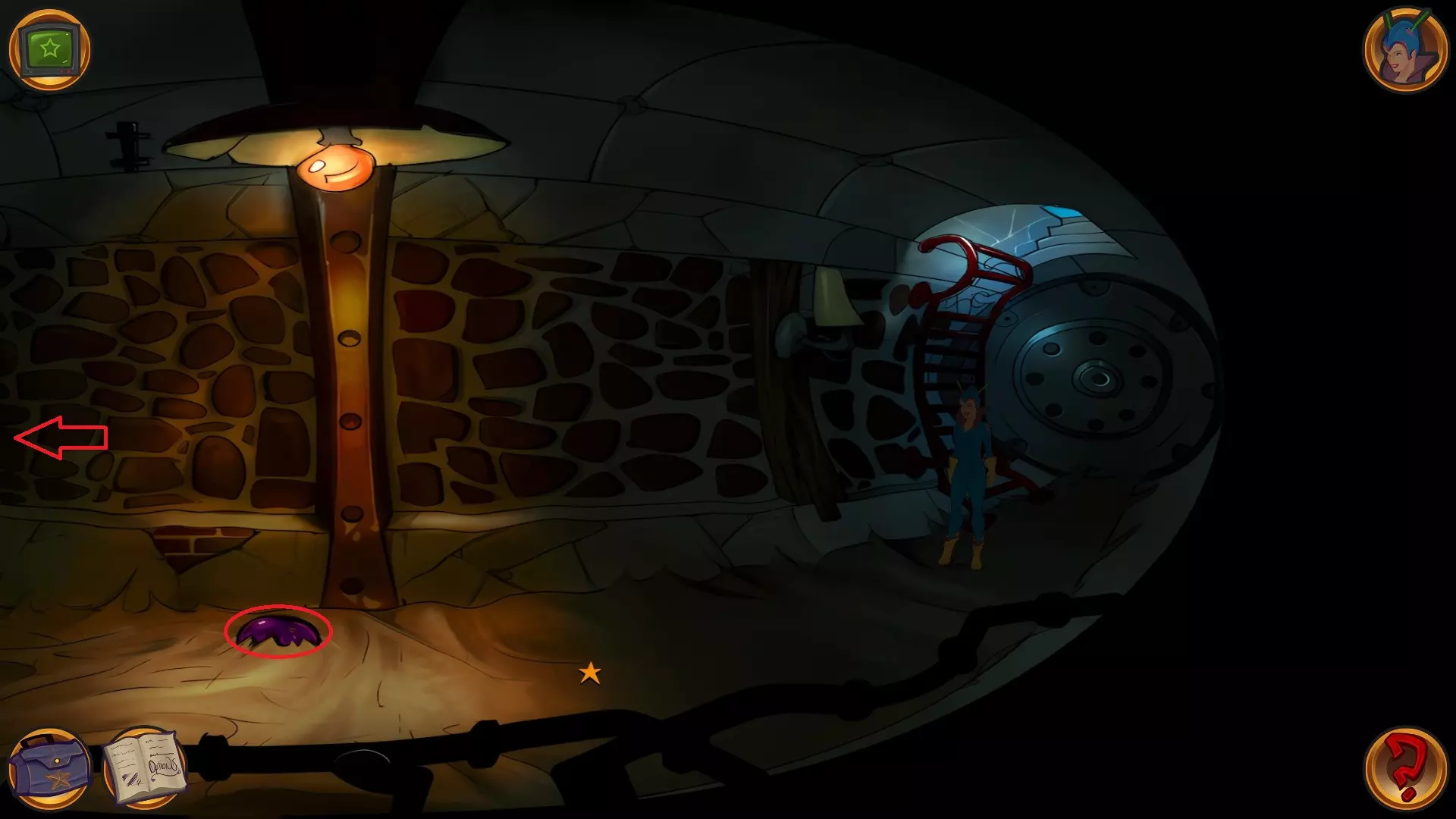 左上角的电视是菜单,内含保存、加载、更改设置或退出游戏的选项。 左下角有背包和笔记本,分别是你的物品栏和记录当前任务的地方。有时笔记本会显示绿色感叹号,为你提供一些游戏玩法提示。 右下角是问号图标,它会高亮显示所有可交互的物体和你可以走的路径。 提示:与物体、人物等互动时,有两个选项,你可能需要选择正确的选项来获得所需物品。这一机制也存在于物品栏中,与单纯点击物品不同。放大镜用于检查物品,它可以揭示世界中的信息——这些信息是角色在被指示抓取或使用物品时不会主动交互的内容,同时也能近距离查看物品栏中的物品。