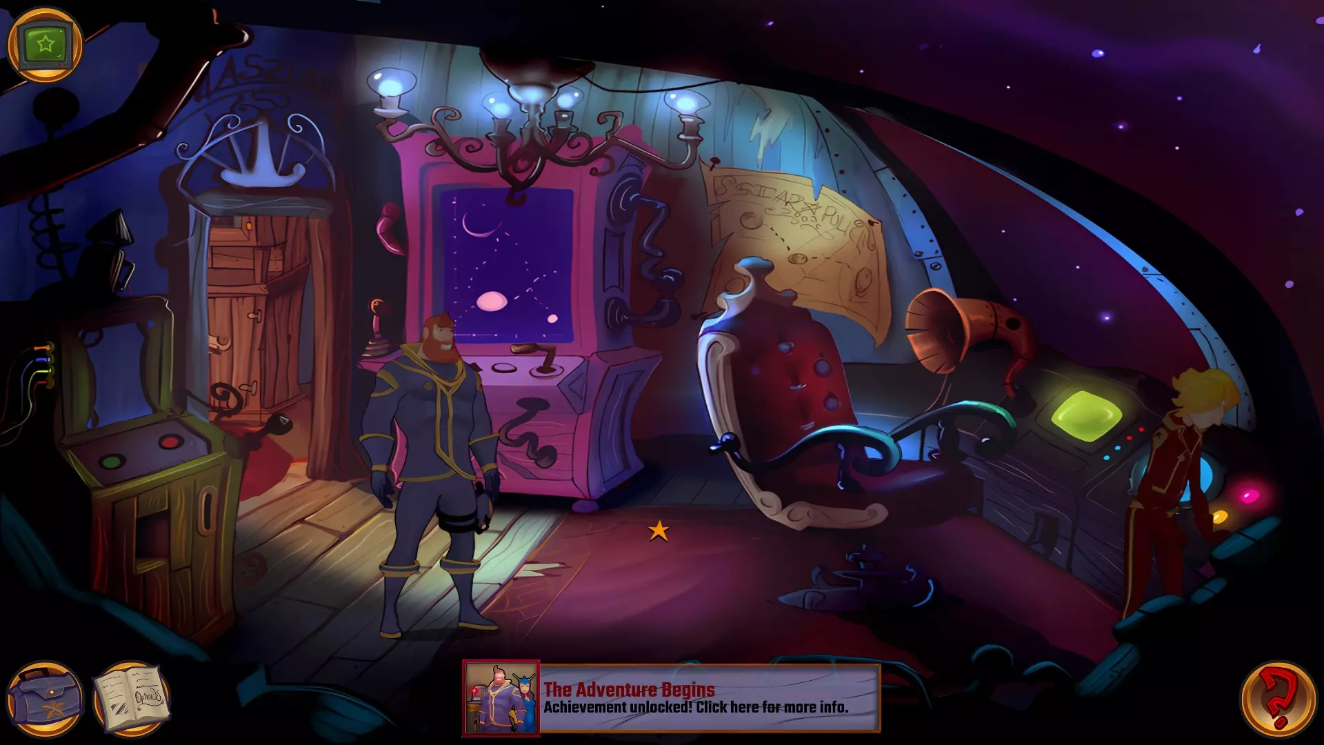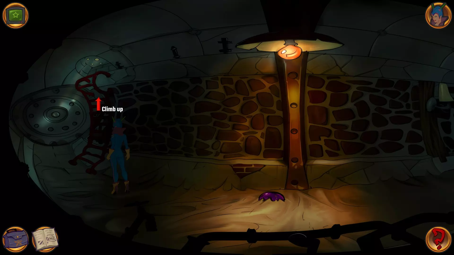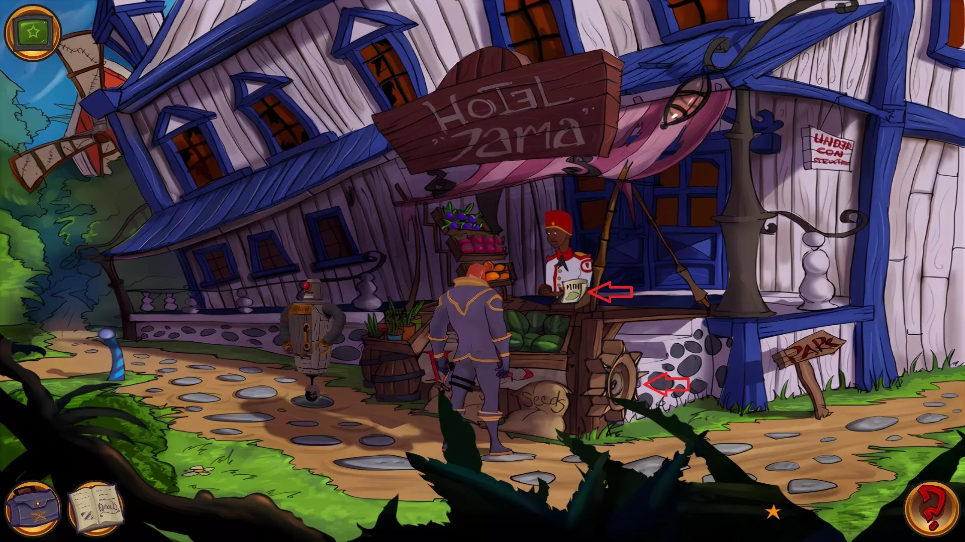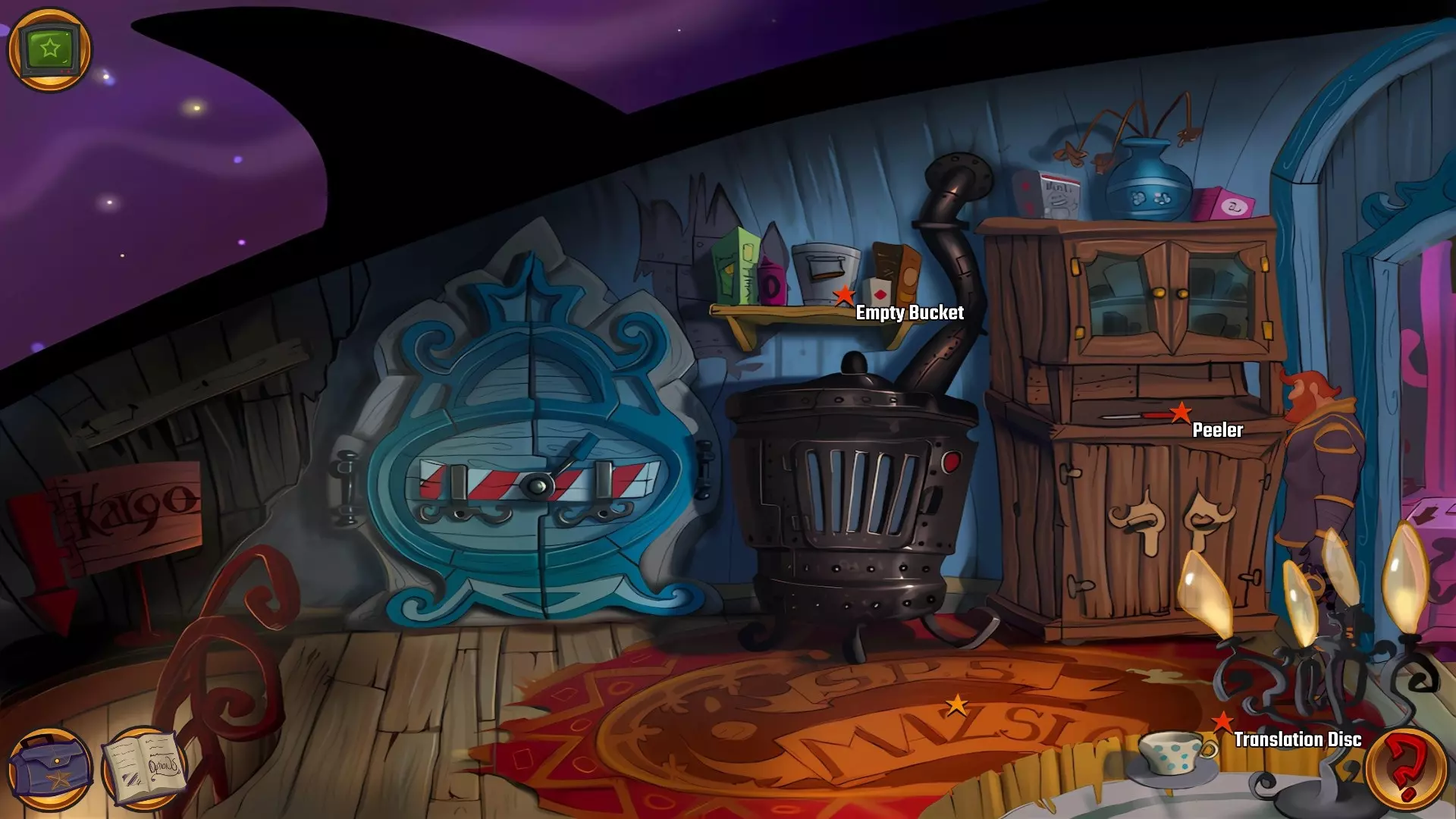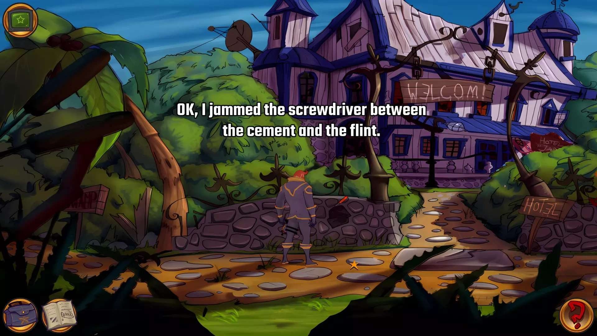 左上角的电视是菜单,内含保存、加载、更改设置或退出游戏的选项。 左下角有背包和笔记本,分别是你的物品栏和记录当前任务的地方。有时笔记本会显示绿色感叹号,为你提供一些游戏玩法提示。 右下角是问号图标,它会高亮显示所有可交互的物体和你可以走的路径。 提示:与物体、人物等互动时,有两个选项,你可能需要选择正确的选项来获得所需物品。这一机制也存在于物品栏中,与单纯点击物品不同。放大镜用于检查物品,它可以揭示世界中的信息——这些信息是角色在被指示抓取或使用物品时不会主动交互的内容,同时也能近距离查看物品栏中的物品。