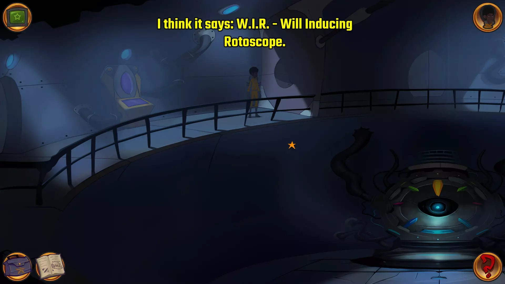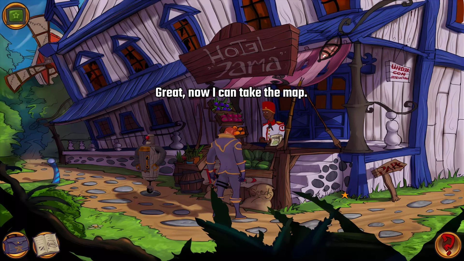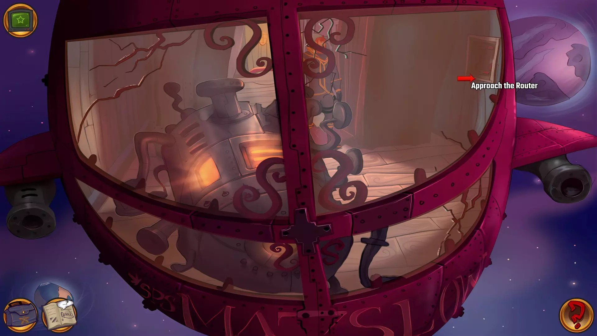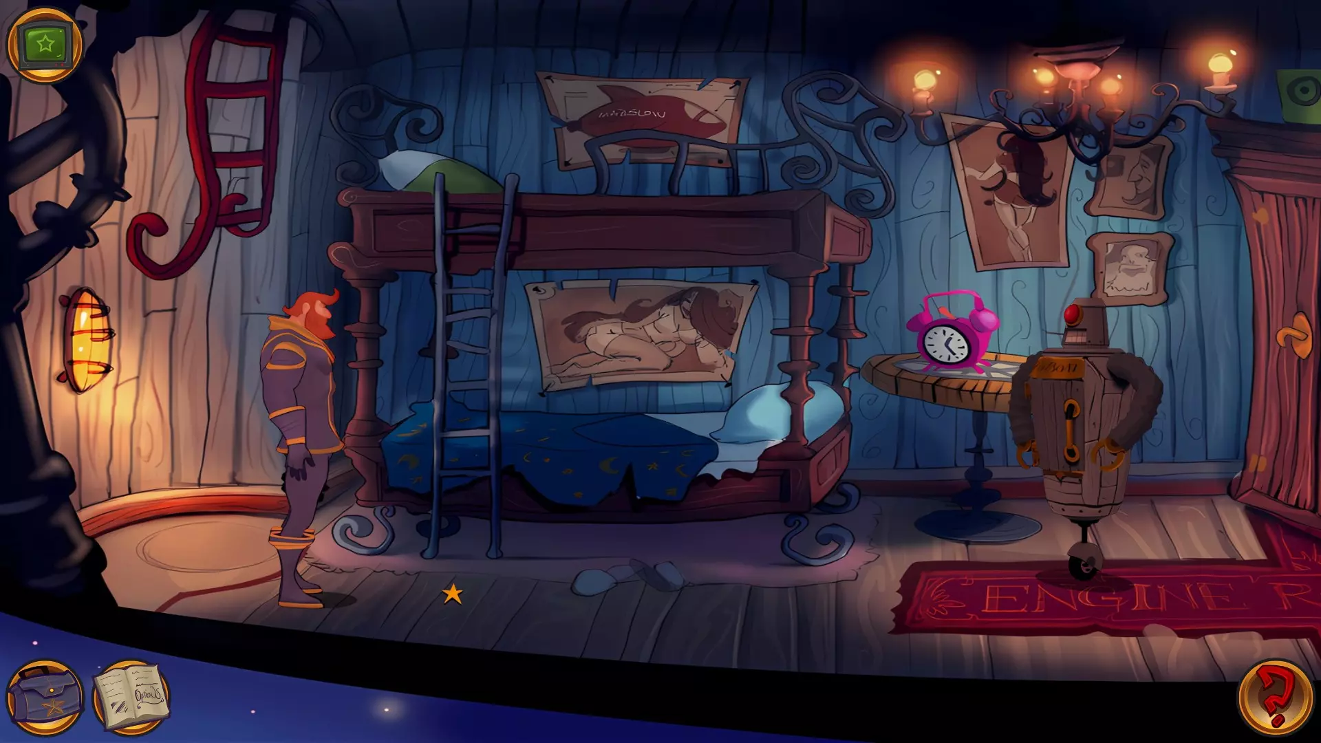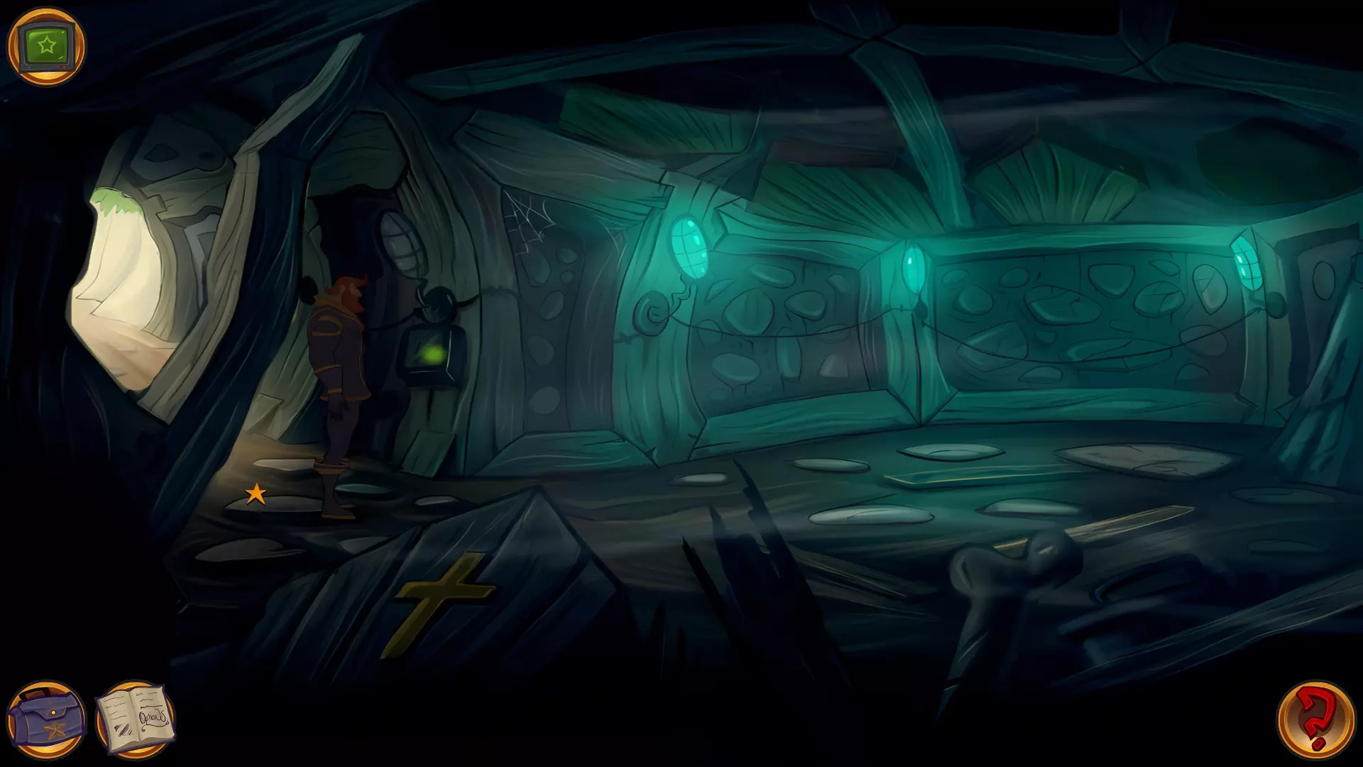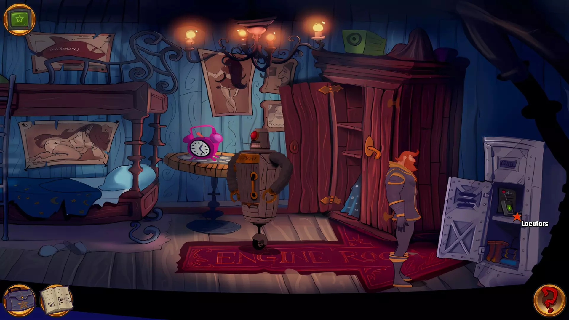 左上角的电视是菜单,内含保存、加载、更改设置或退出游戏的选项。 左下角有背包和笔记本,分别是你的物品栏和记录当前任务的地方。有时笔记本会显示绿色感叹号,为你提供一些游戏玩法提示。 右下角是问号图标,它会高亮显示所有可交互的物体和你可以走的路径。 提示:与物体、人物等互动时,有两个选项,你可能需要选择正确的选项来获得所需物品。这一机制也存在于物品栏中,与单纯点击物品不同。放大镜用于检查物品,它可以揭示世界中的信息——这些信息是角色在被指示抓取或使用物品时不会主动交互的内容,同时也能近距离查看物品栏中的物品。