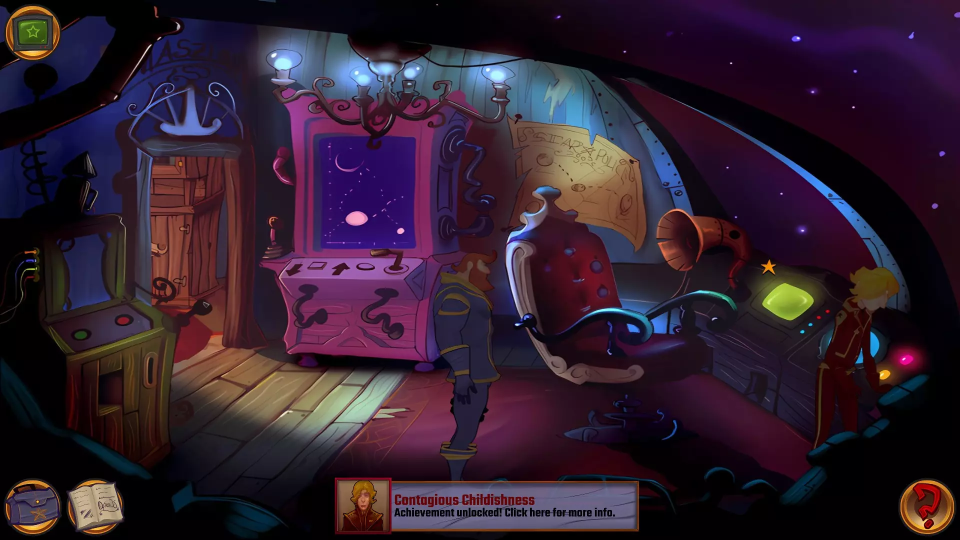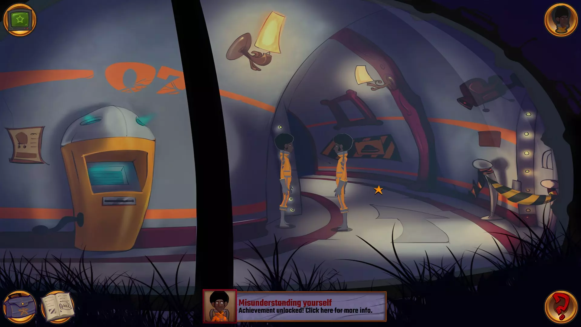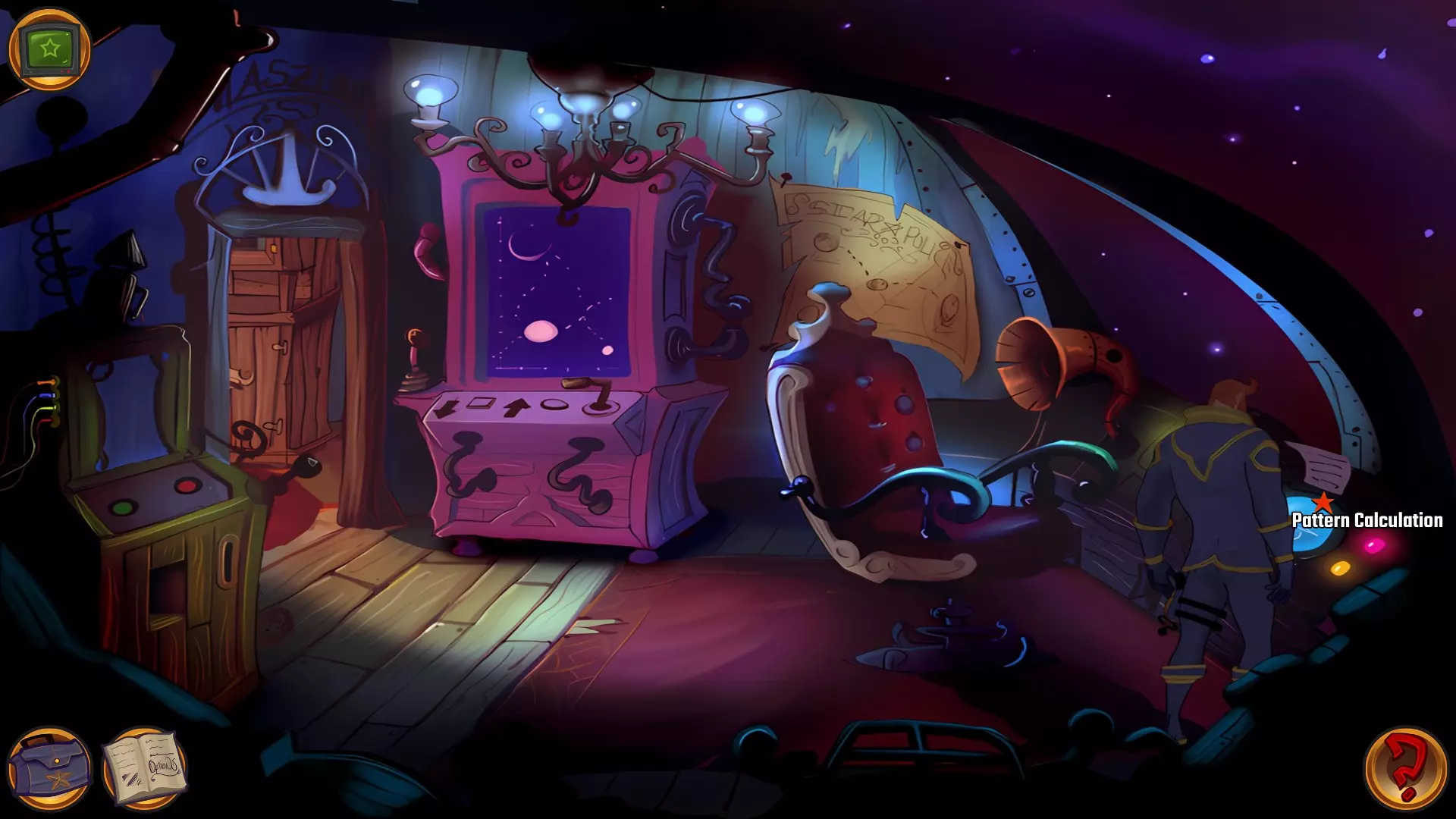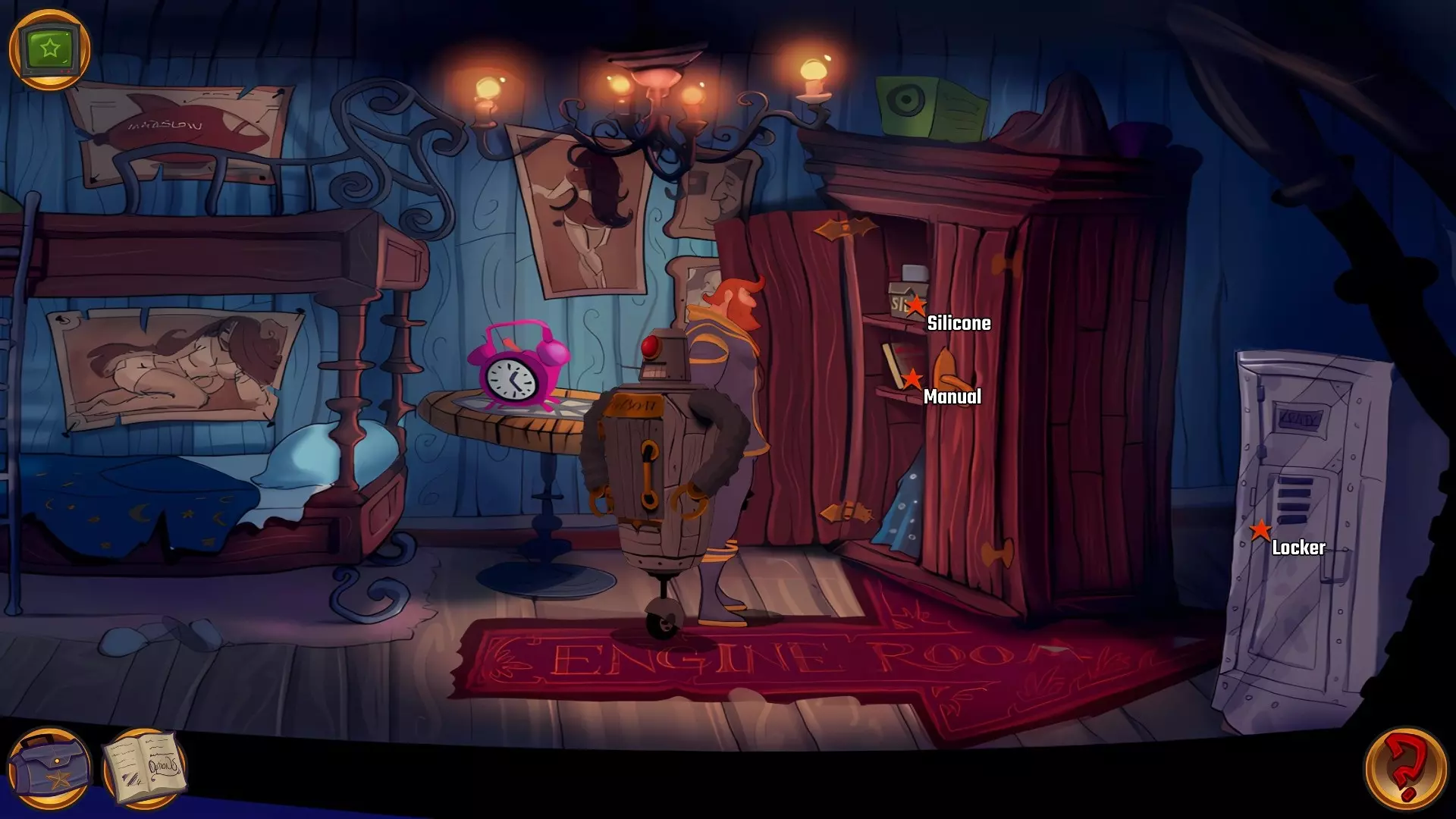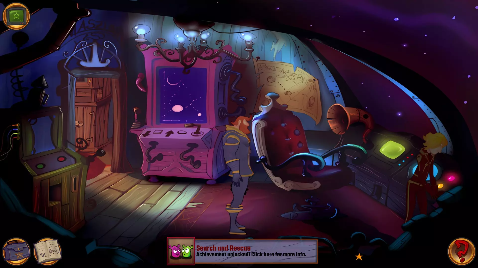 左上角的电视是菜单,内含保存、加载、更改设置或退出游戏的选项。 左下角有背包和笔记本,分别是你的物品栏和记录当前任务的地方。有时笔记本会显示绿色感叹号,为你提供一些游戏玩法提示。 右下角是问号图标,它会高亮显示所有可交互的物体和你可以走的路径。 提示:与物体、人物等互动时,有两个选项,你可能需要选择正确的选项来获得所需物品。这一机制也存在于物品栏中,与单纯点击物品不同。放大镜用于检查物品,它可以揭示世界中的信息——这些信息是角色在被指示抓取或使用物品时不会主动交互的内容,同时也能近距离查看物品栏中的物品。