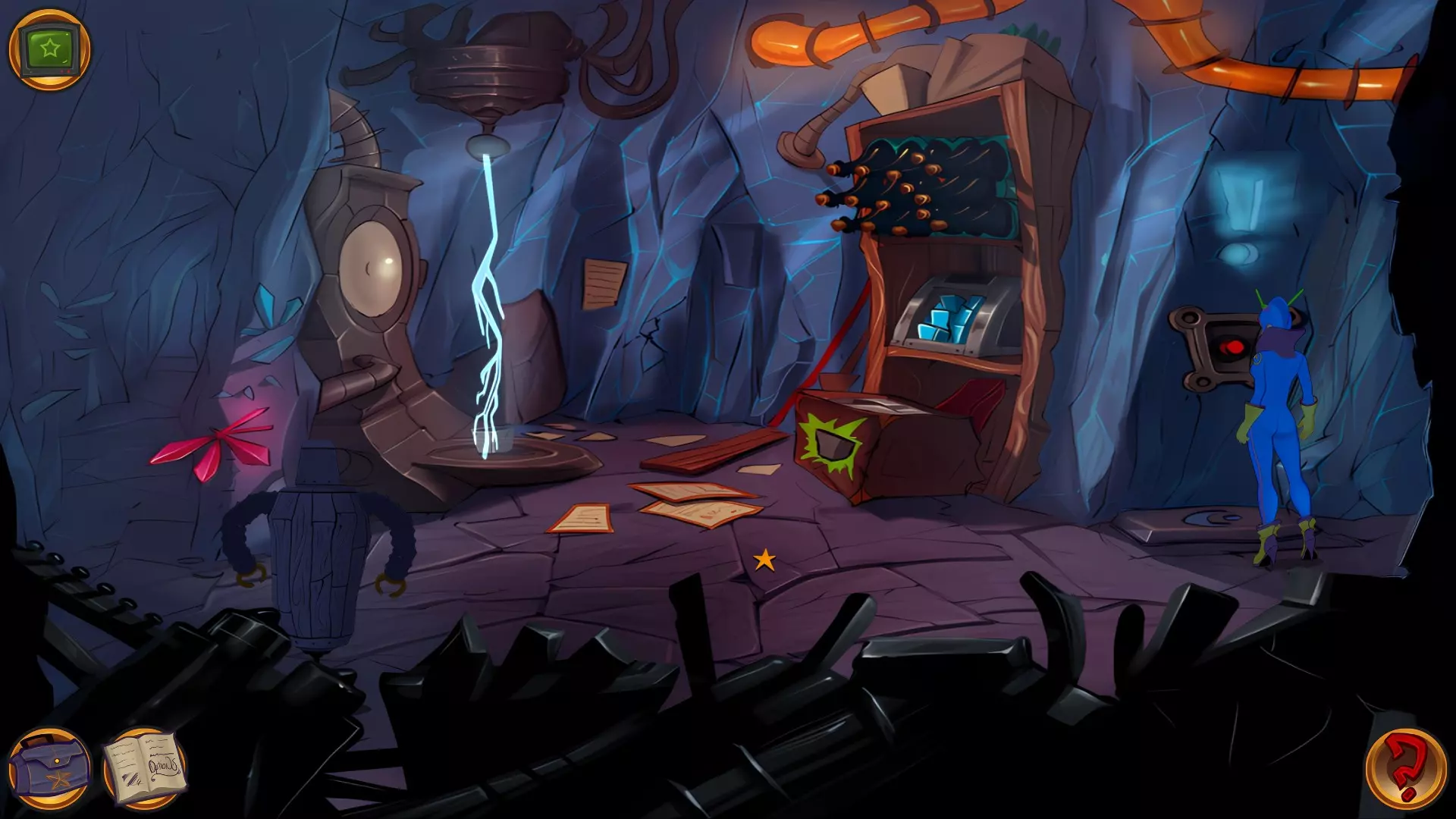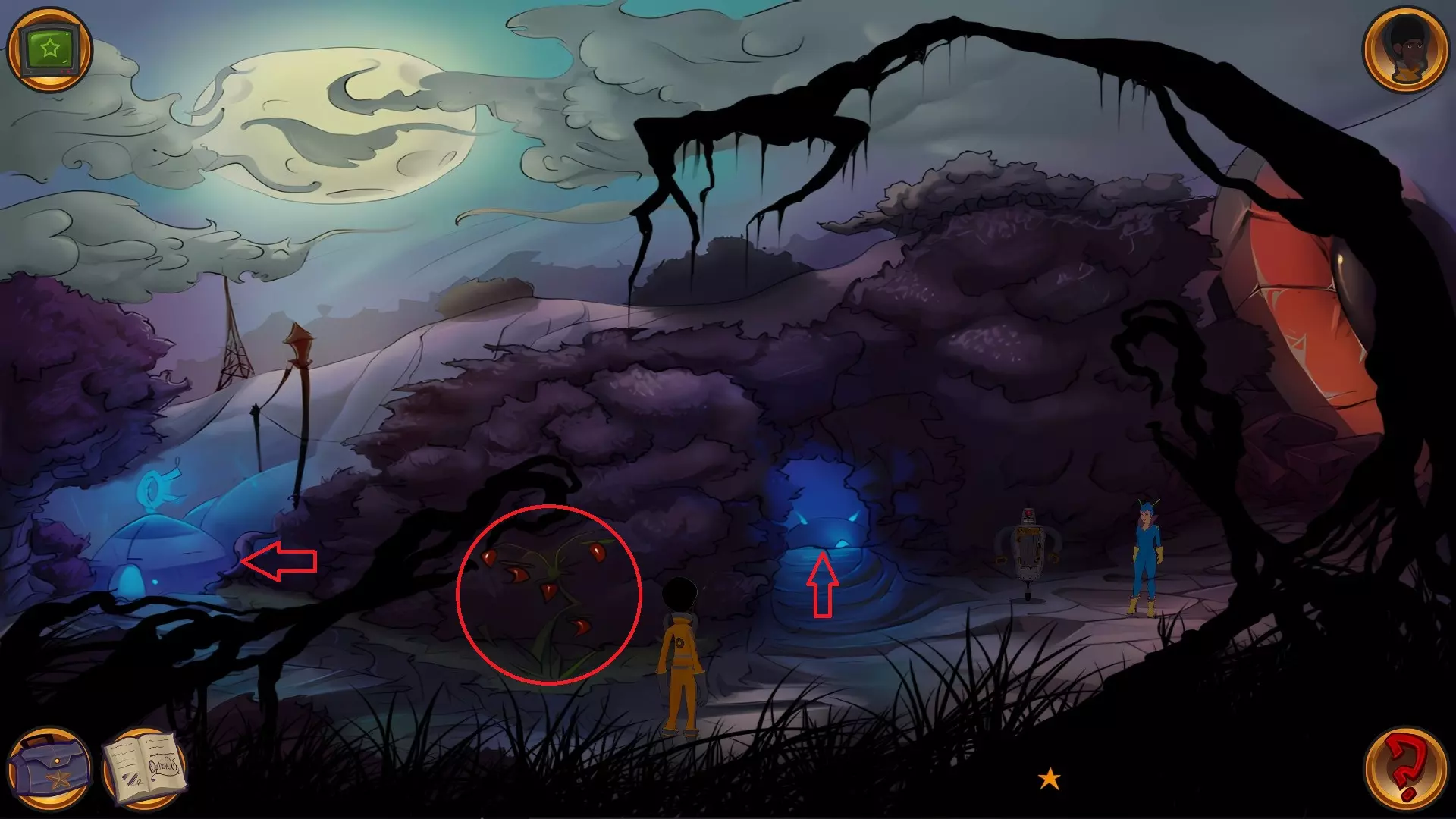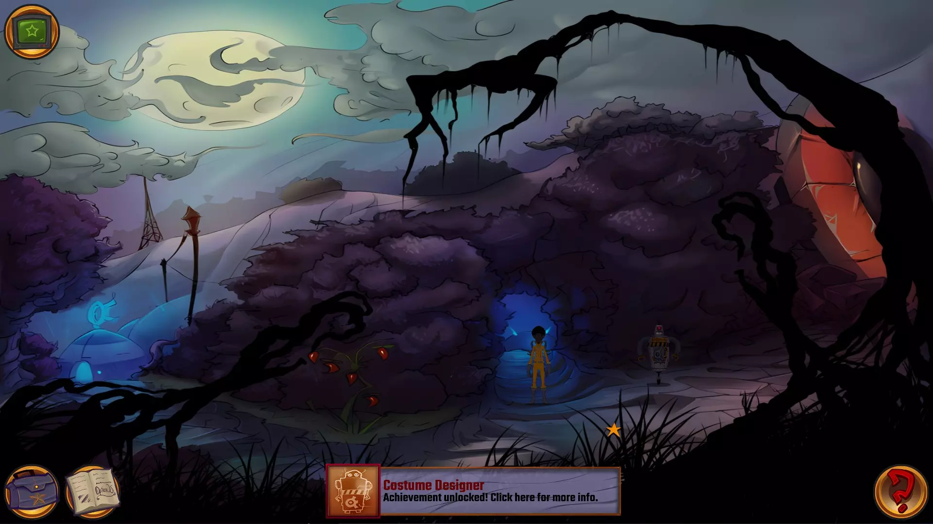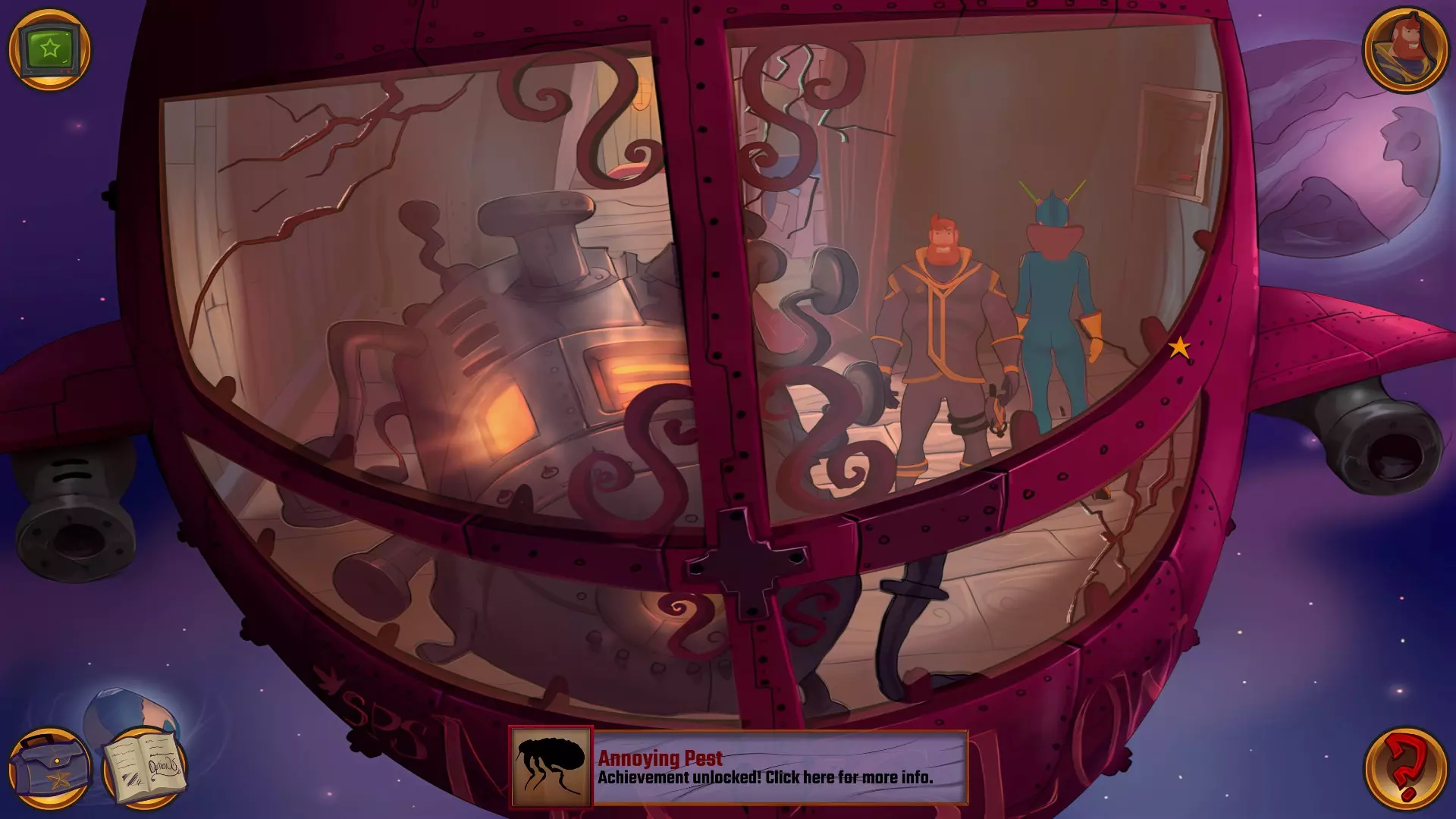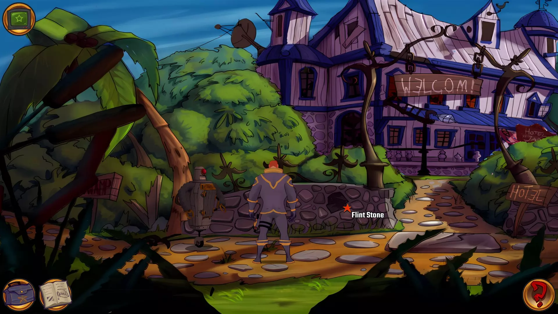 左上角的电视是菜单,内含保存、加载、更改设置或退出游戏的选项。 左下角有背包和笔记本,分别是你的物品栏和记录当前任务的地方。有时笔记本会显示绿色感叹号,为你提供一些游戏玩法提示。 右下角是问号图标,它会高亮显示所有可交互的物体和你可以走的路径。 提示:与物体、人物等互动时,有两个选项,你可能需要选择正确的选项来获得所需物品。这一机制也存在于物品栏中,与单纯点击物品不同。放大镜用于检查物品,它可以揭示世界中的信息——这些信息是角色在被指示抓取或使用物品时不会主动交互的内容,同时也能近距离查看物品栏中的物品。