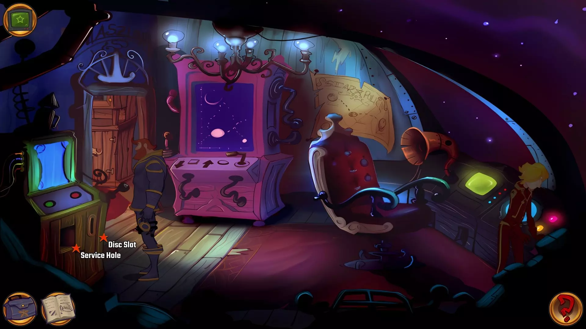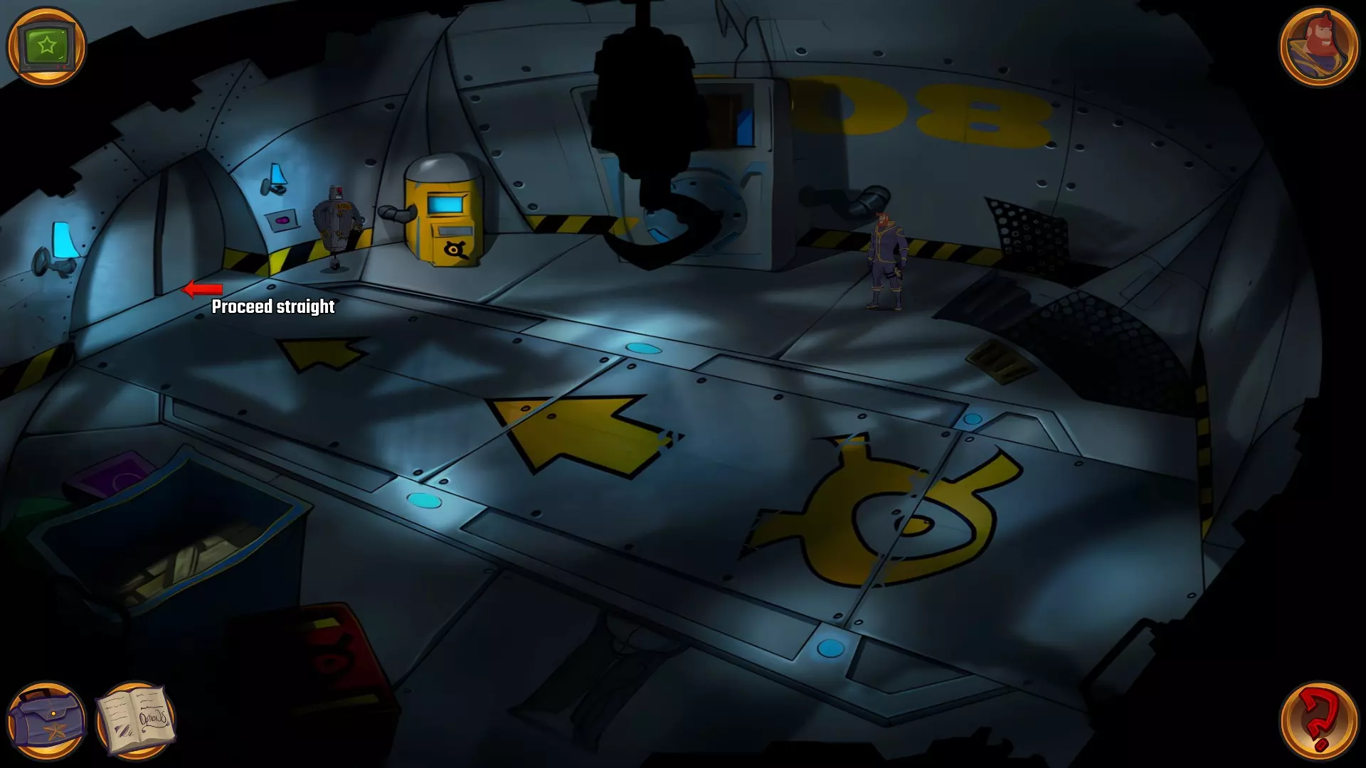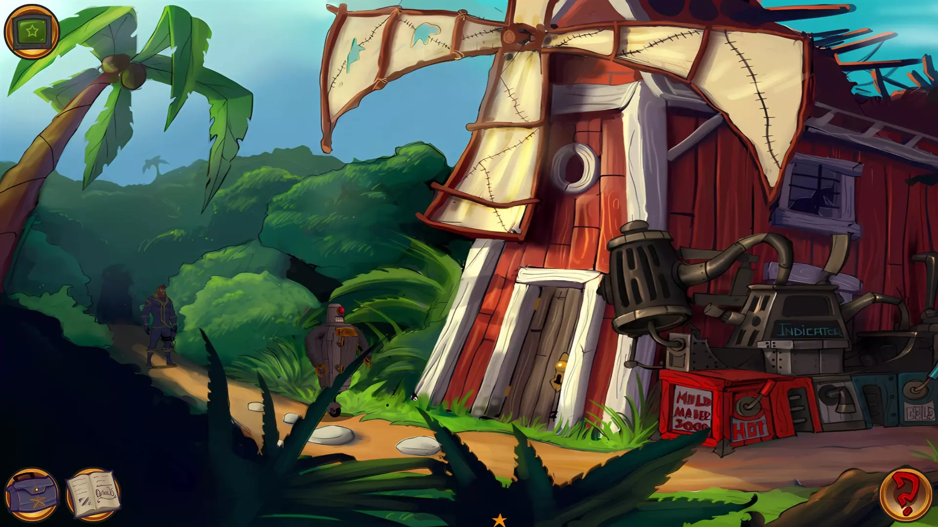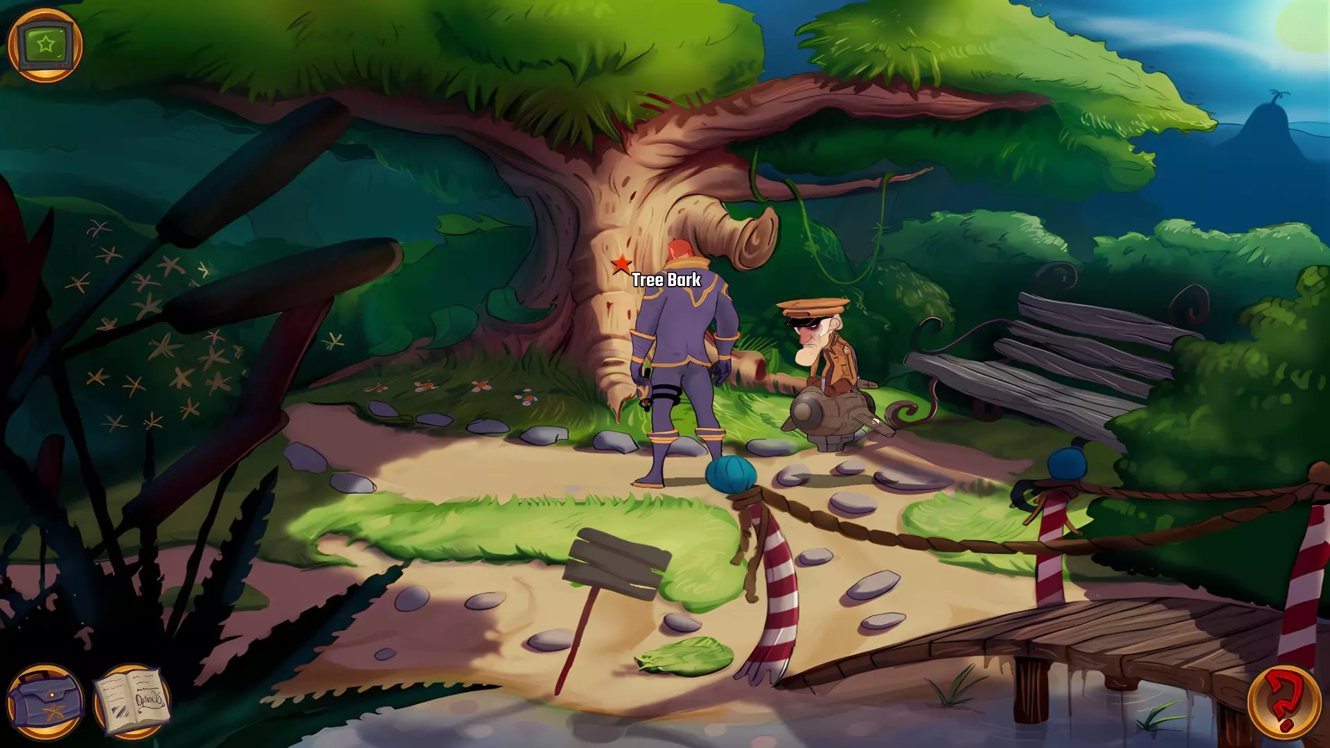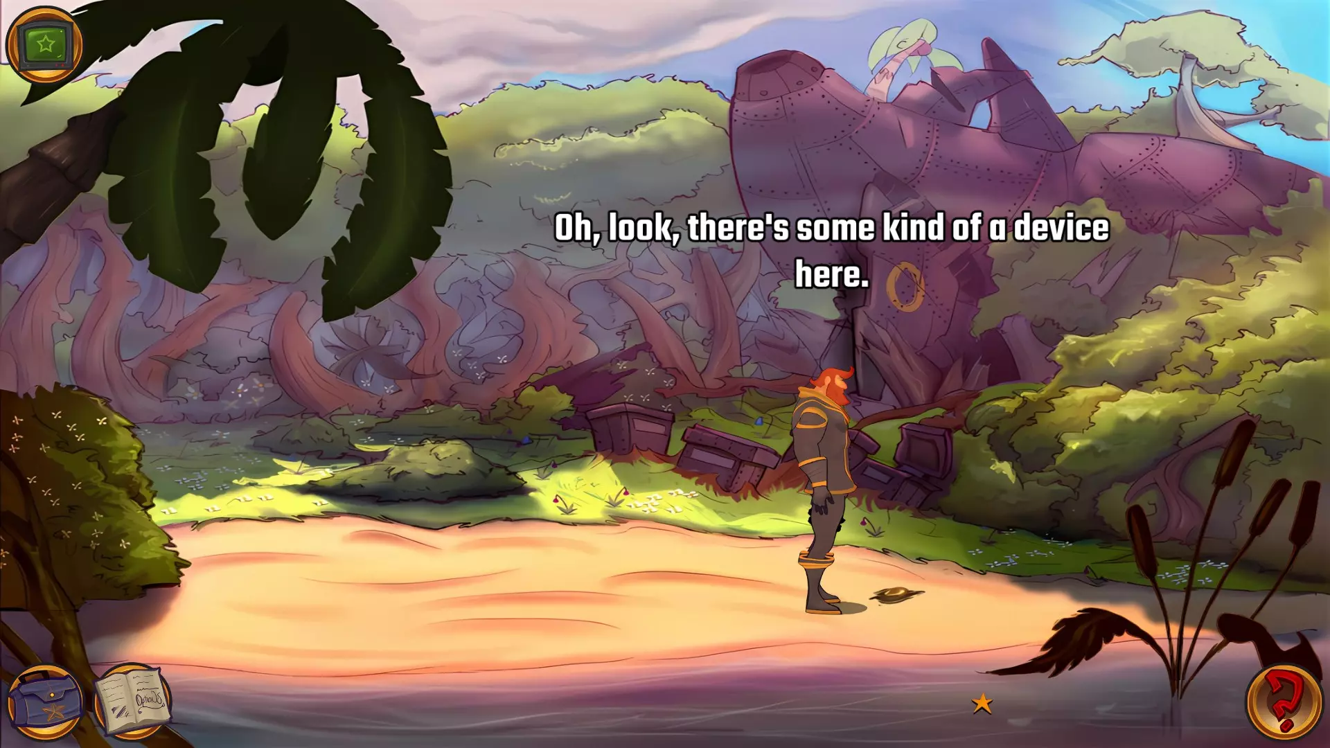 左上角的电视是菜单,内含保存、加载、更改设置或退出游戏的选项。 左下角有背包和笔记本,分别是你的物品栏和记录当前任务的地方。有时笔记本会显示绿色感叹号,为你提供一些游戏玩法提示。 右下角是问号图标,它会高亮显示所有可交互的物体和你可以走的路径。 提示:与物体、人物等互动时,有两个选项,你可能需要选择正确的选项来获得所需物品。这一机制也存在于物品栏中,与单纯点击物品不同。放大镜用于检查物品,它可以揭示世界中的信息——这些信息是角色在被指示抓取或使用物品时不会主动交互的内容,同时也能近距离查看物品栏中的物品。