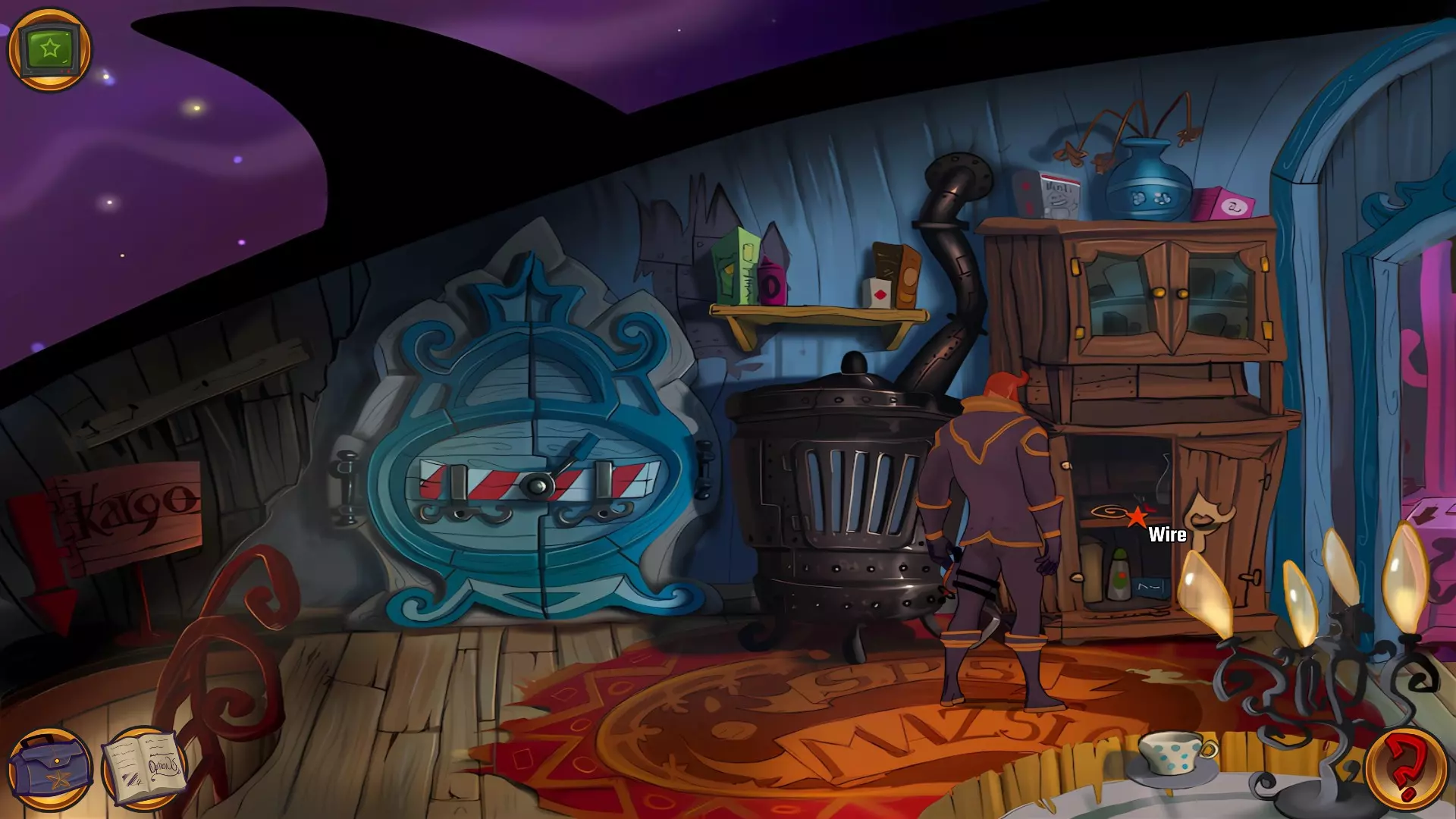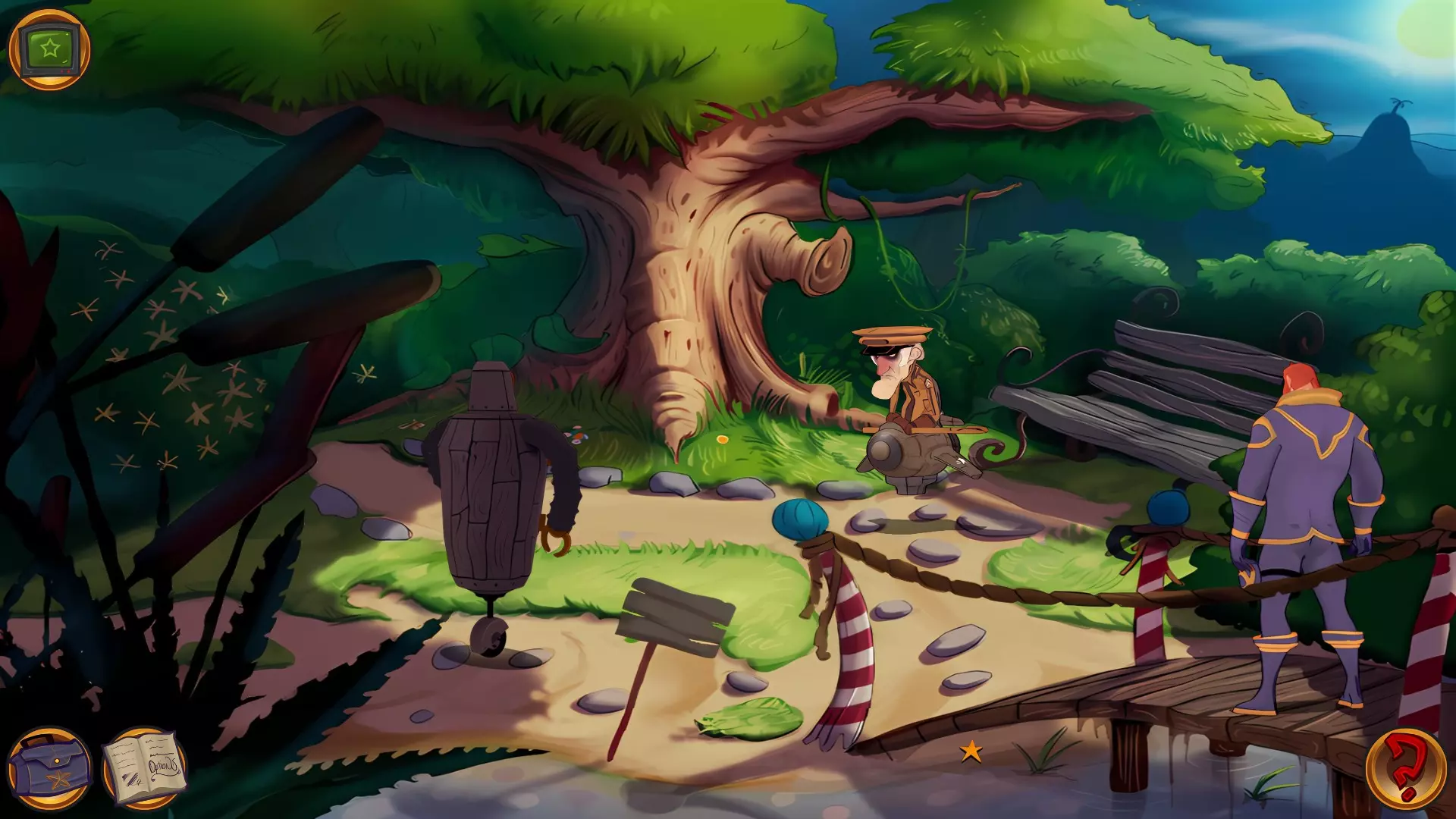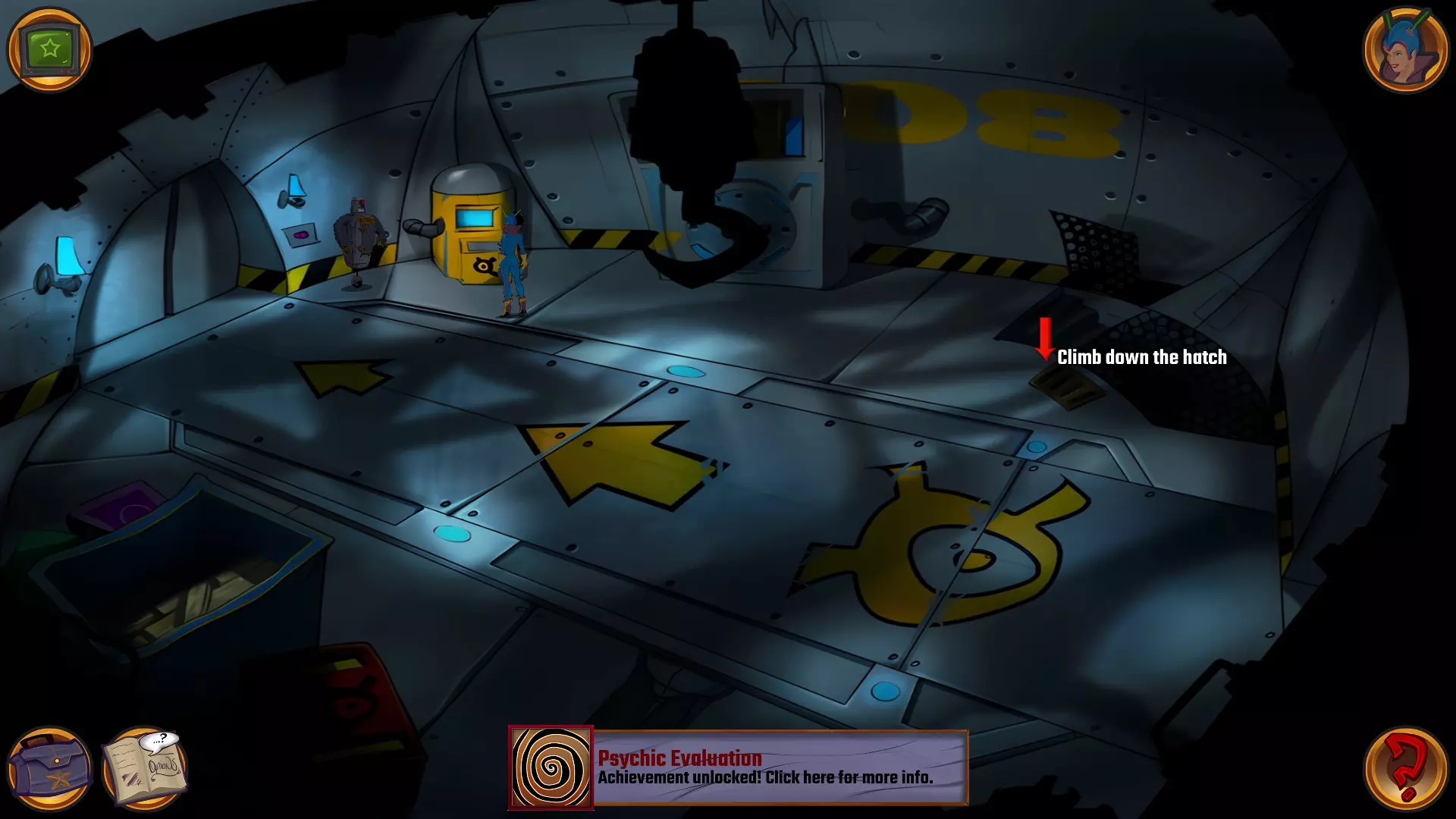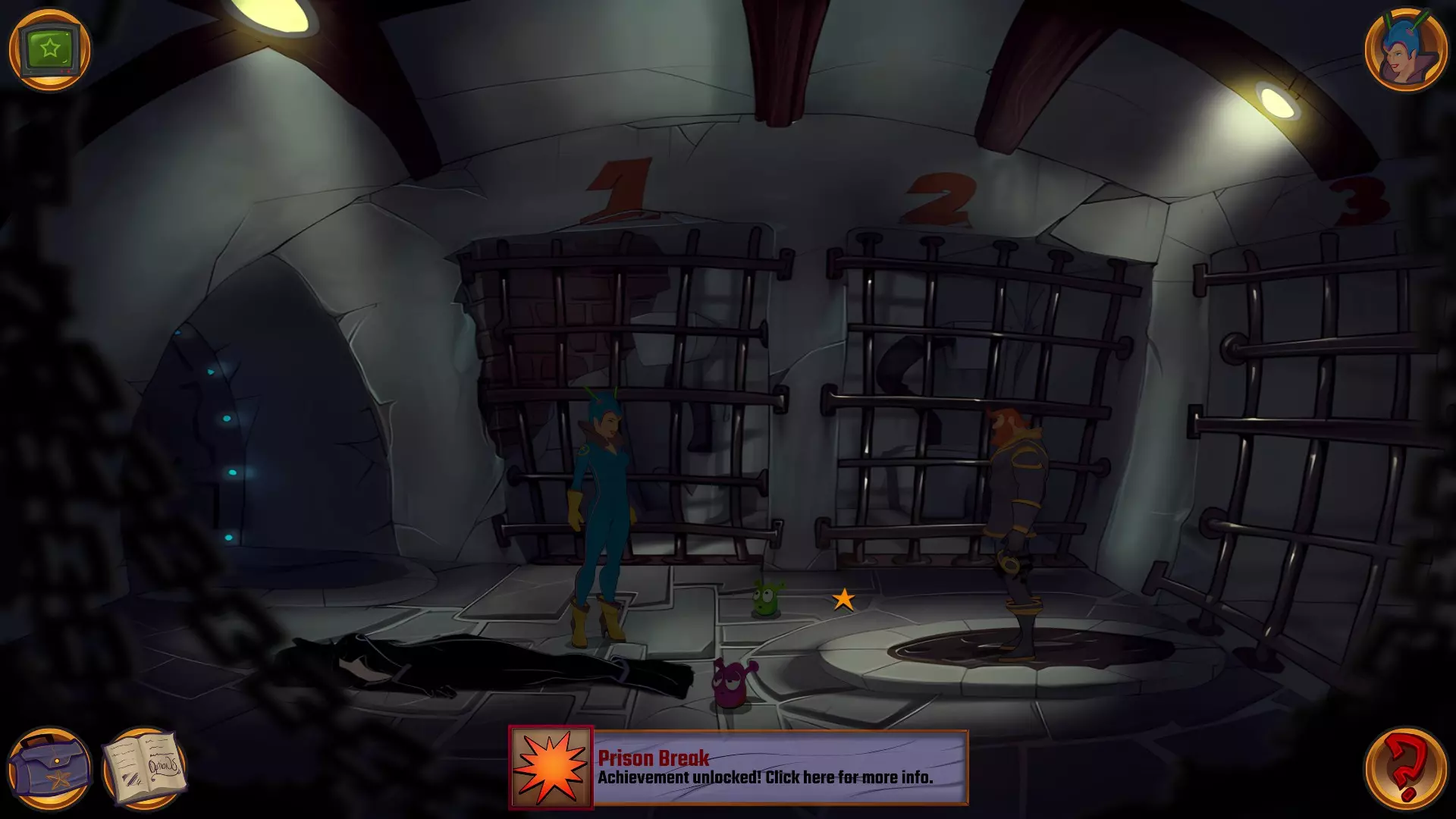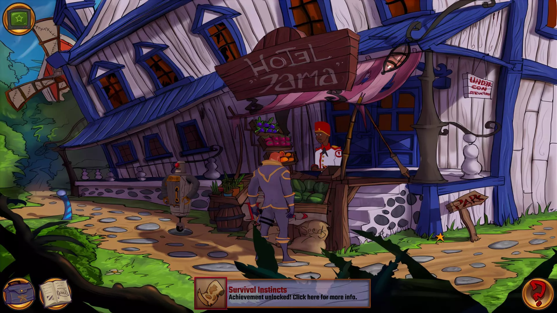左上角的电视是菜单,内含保存、加载、更改设置或退出游戏的选项。 左下角有背包和笔记本,分别是你的物品栏和记录当前任务的地方。有时笔记本会显示绿色感叹号,为你提供一些游戏玩法提示。 右下角是问号图标,它会高亮显示所有可交互的物体和你可以走的路径。 提示:与物体、人物等互动时,有两个选项,你可能需要选择正确的选项来获得所需物品。这一机制也存在于物品栏中,与单纯点击物品不同。放大镜用于检查物品,它可以揭示世界中的信息——这些信息是角色在被指示抓取或使用物品时不会主动交互的内容,同时也能近距离查看物品栏中的物品。