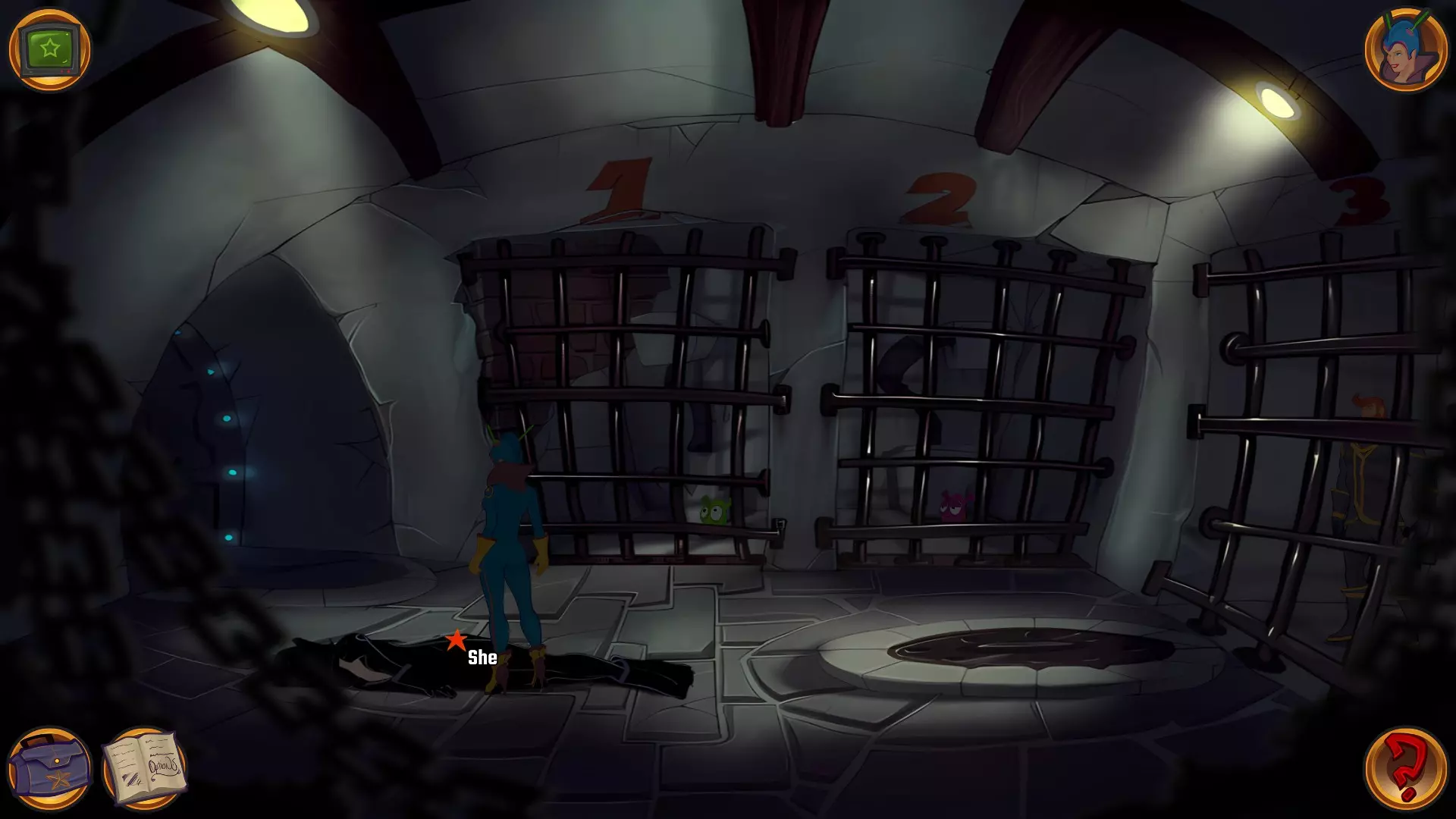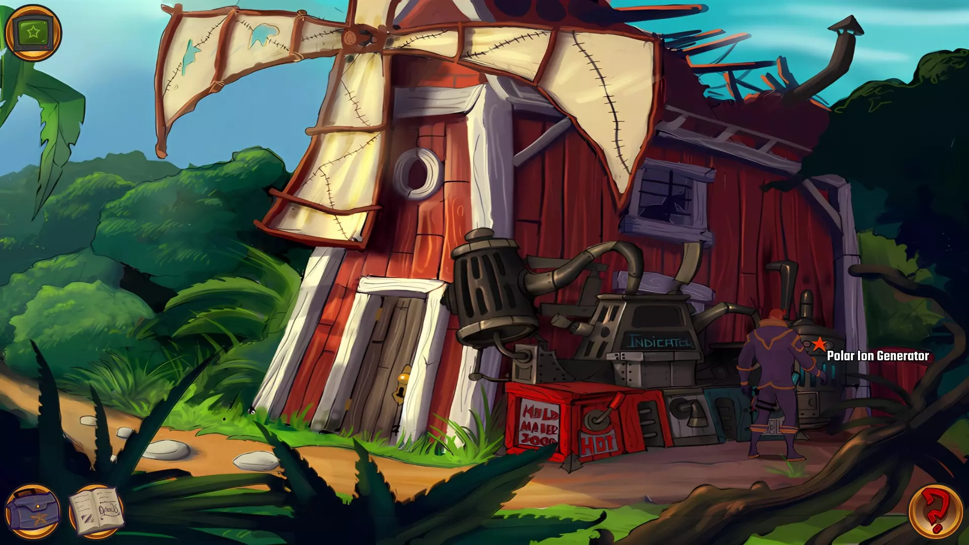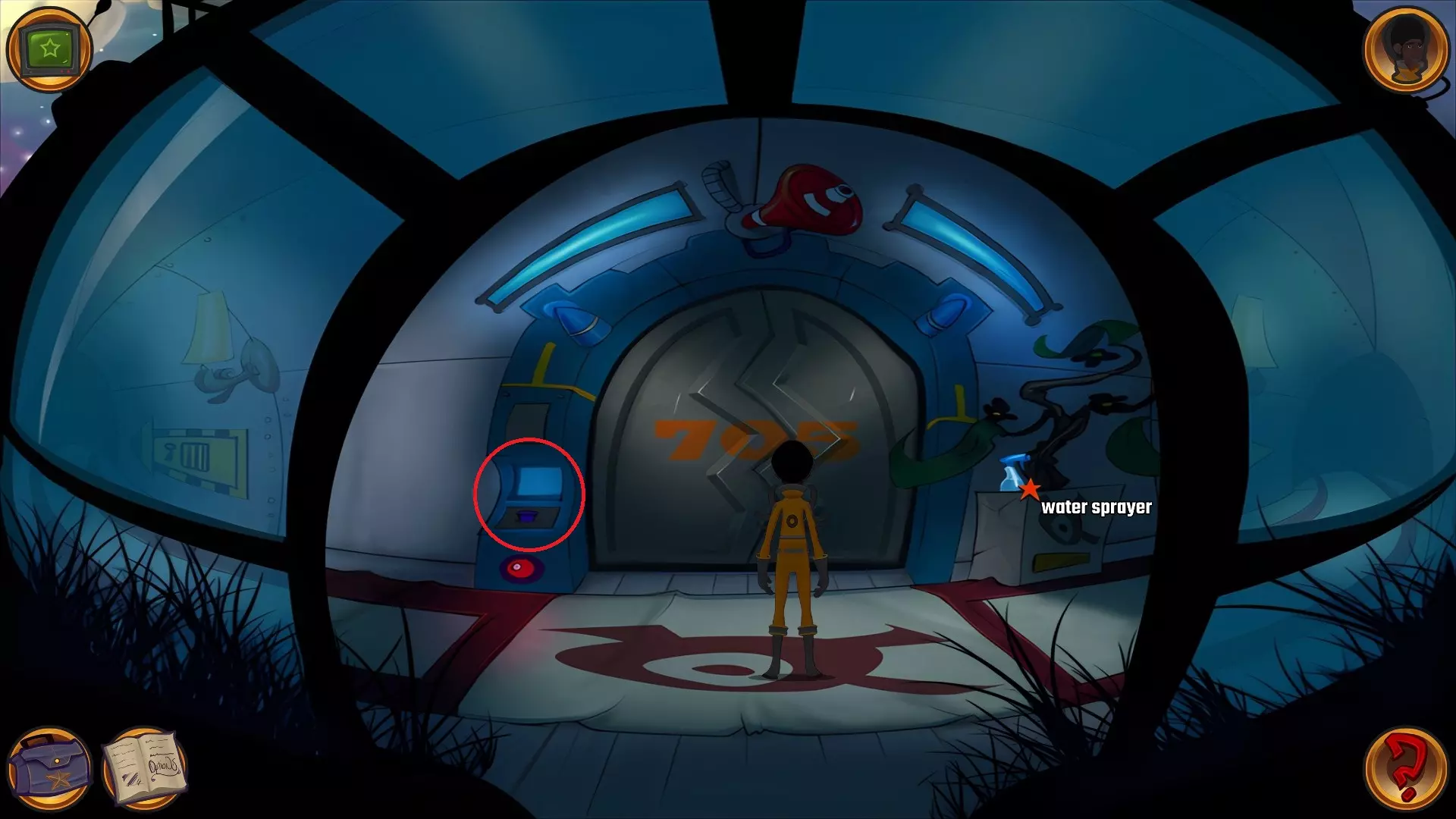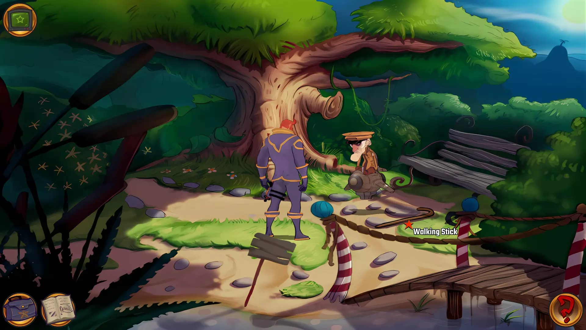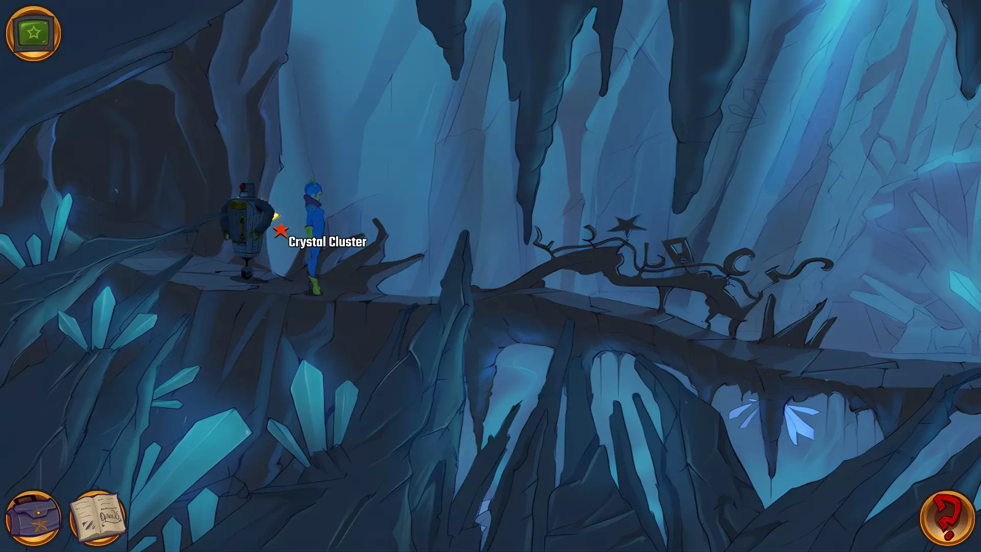 左上角的电视是菜单,内含保存、加载、更改设置或退出游戏的选项。 左下角有背包和笔记本,分别是你的物品栏和记录当前任务的地方。有时笔记本会显示绿色感叹号,为你提供一些游戏玩法提示。 右下角是问号图标,它会高亮显示所有可交互的物体和你可以走的路径。 提示:与物体、人物等互动时,有两个选项,你可能需要选择正确的选项来获得所需物品。这一机制也存在于物品栏中,与单纯点击物品不同。放大镜用于检查物品,它可以揭示世界中的信息——这些信息是角色在被指示抓取或使用物品时不会主动交互的内容,同时也能近距离查看物品栏中的物品。