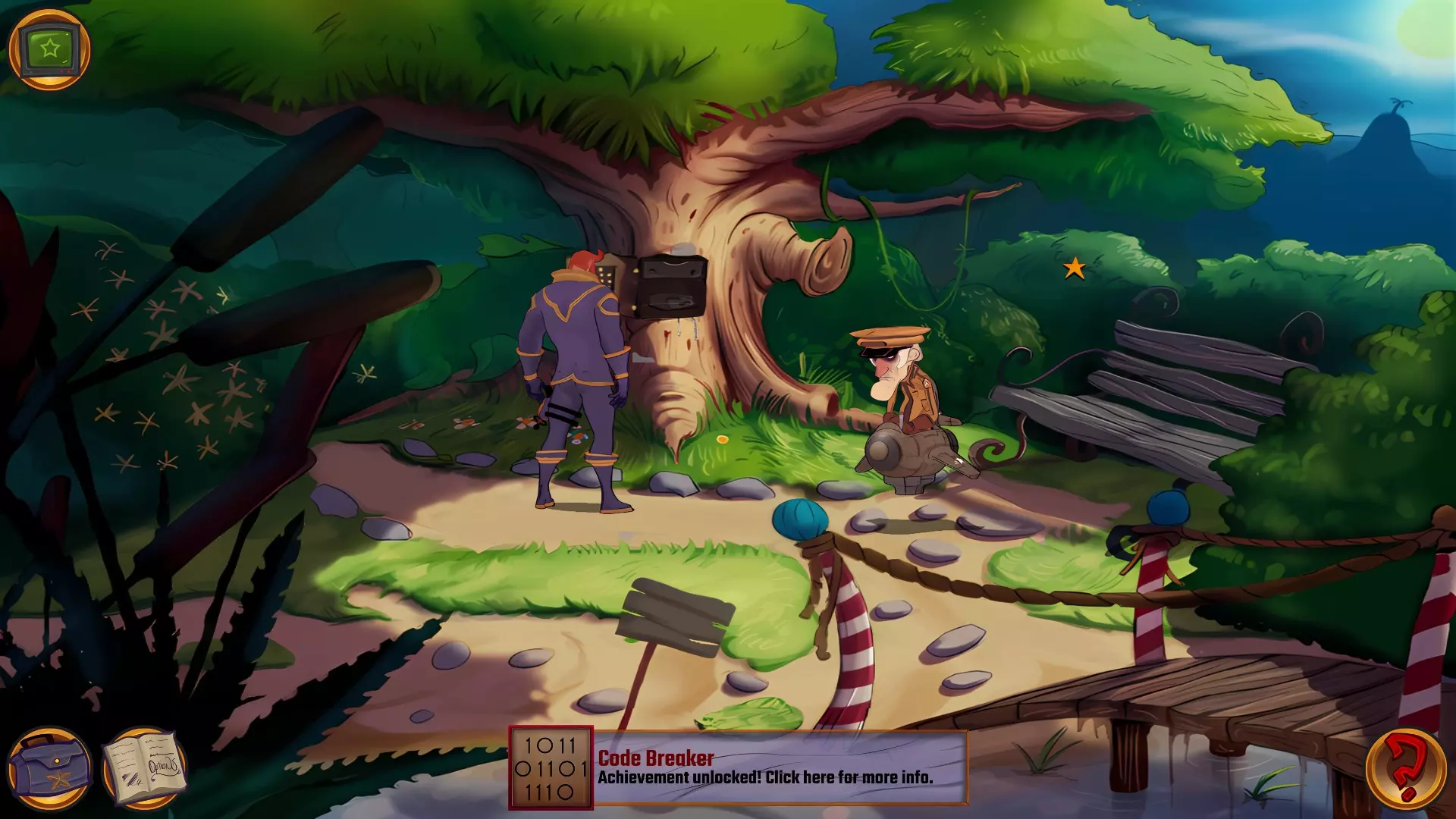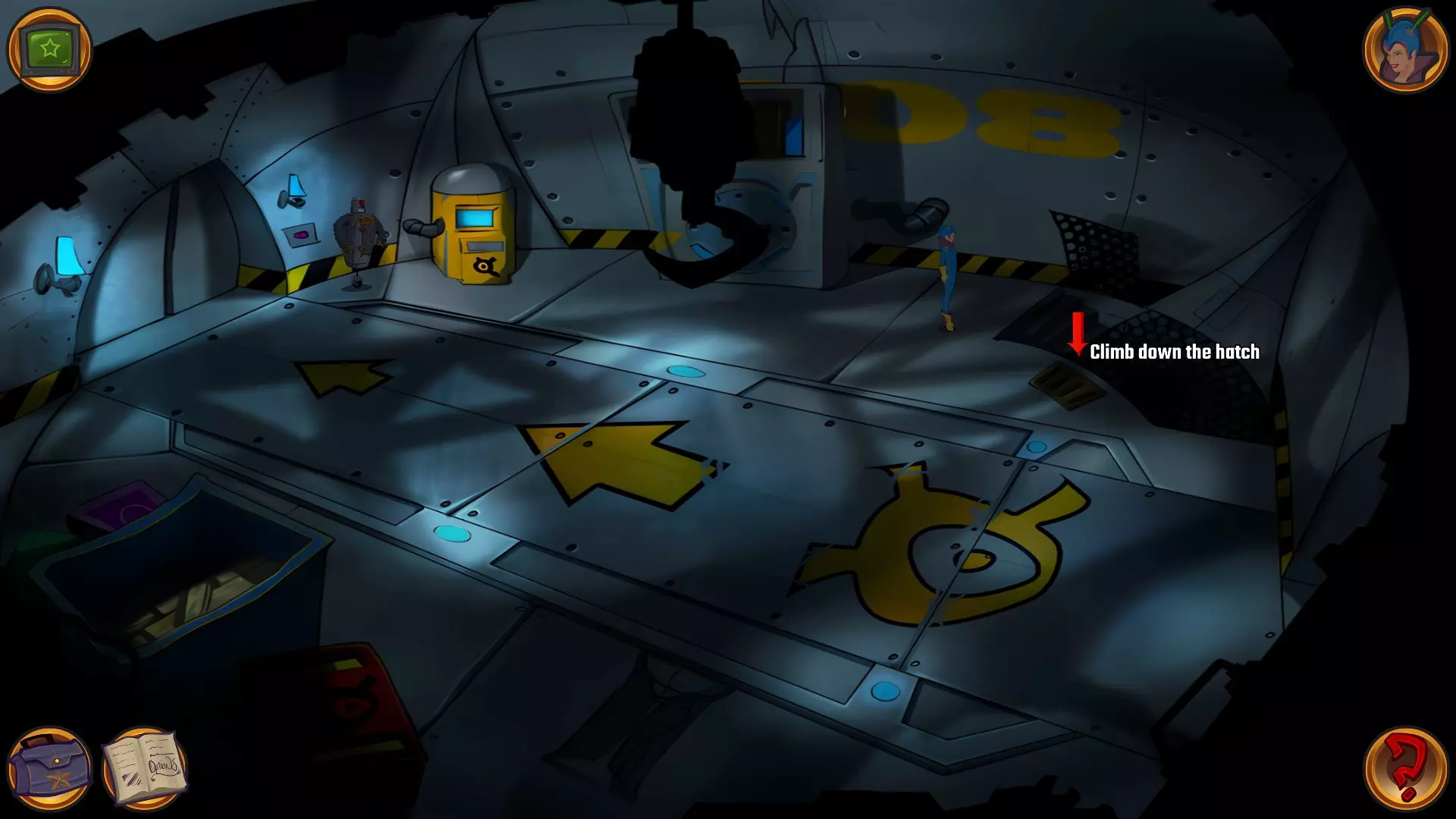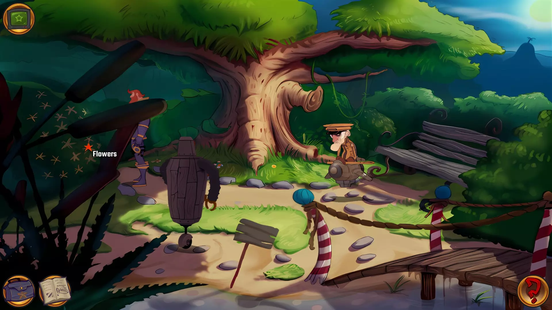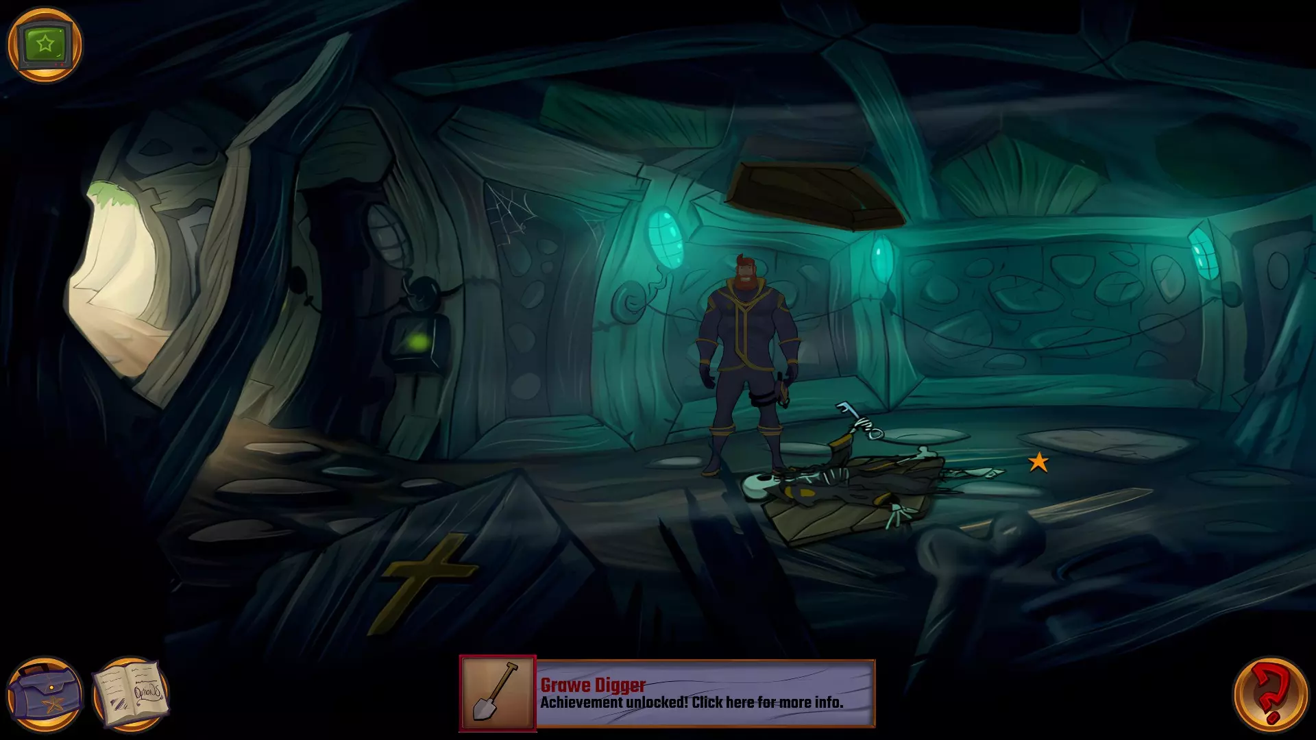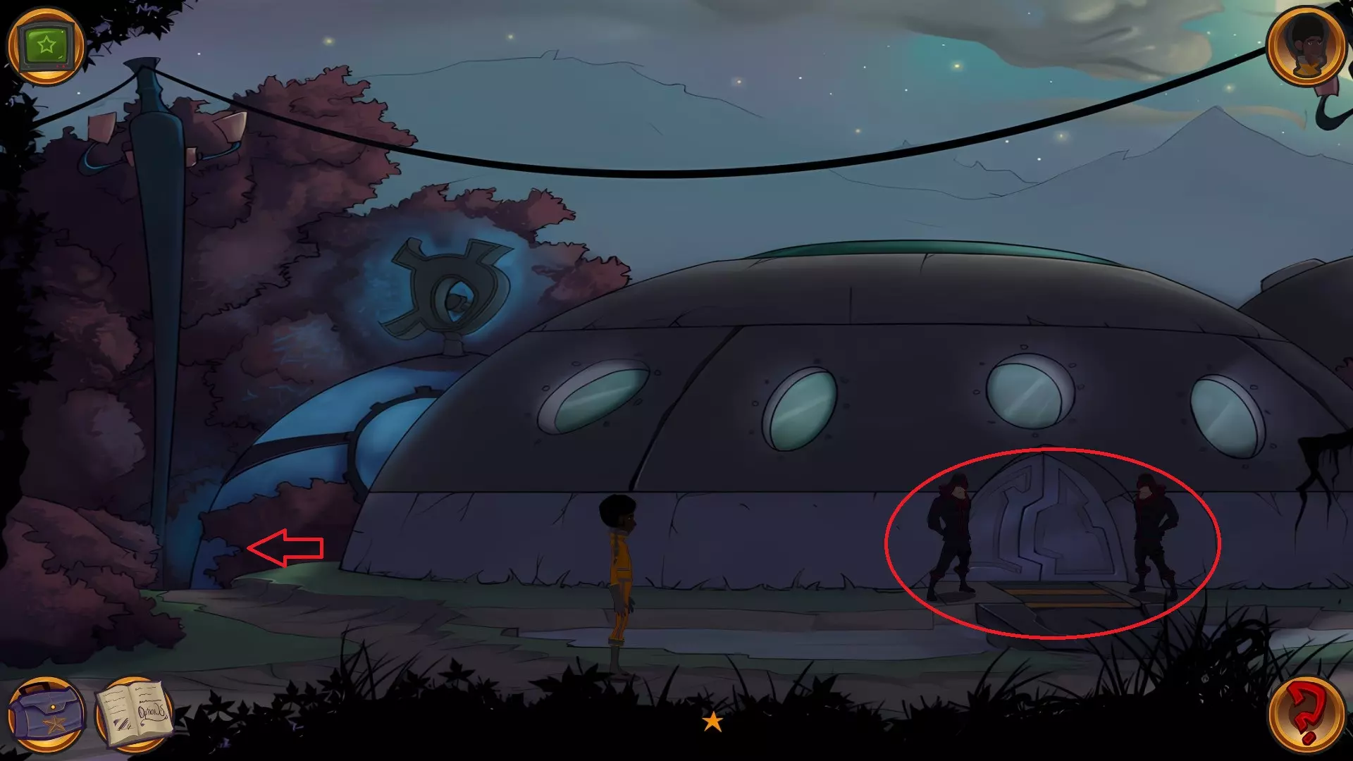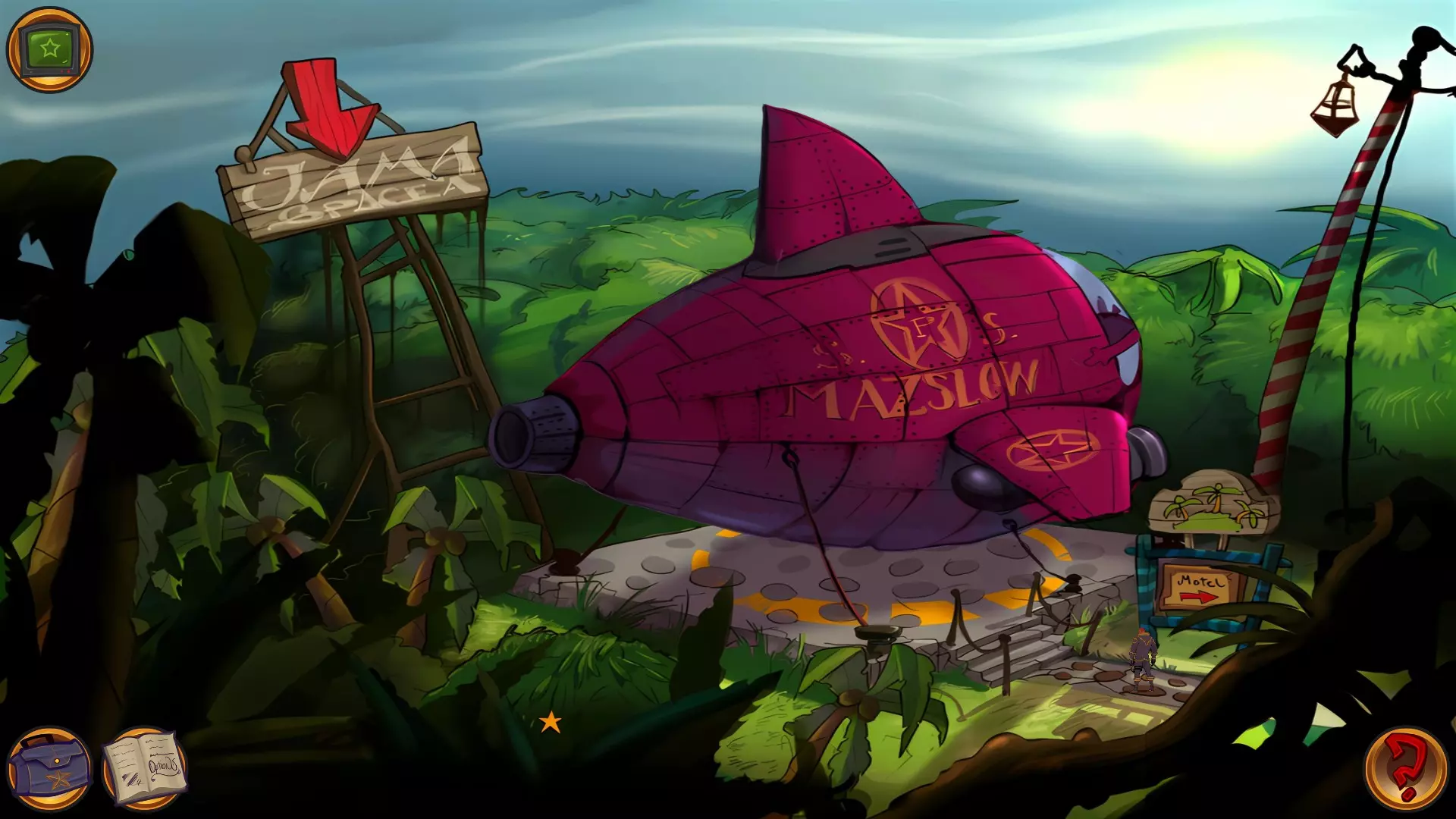 左上角的电视是菜单,内含保存、加载、更改设置或退出游戏的选项。 左下角有背包和笔记本,分别是你的物品栏和记录当前任务的地方。有时笔记本会显示绿色感叹号,为你提供一些游戏玩法提示。 右下角是问号图标,它会高亮显示所有可交互的物体和你可以走的路径。 提示:与物体、人物等互动时,有两个选项,你可能需要选择正确的选项来获得所需物品。这一机制也存在于物品栏中,与单纯点击物品不同。放大镜用于检查物品,它可以揭示世界中的信息——这些信息是角色在被指示抓取或使用物品时不会主动交互的内容,同时也能近距离查看物品栏中的物品。