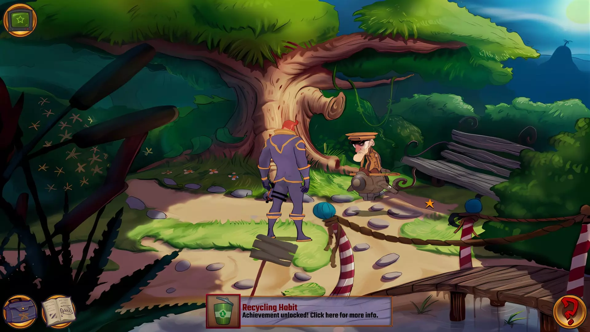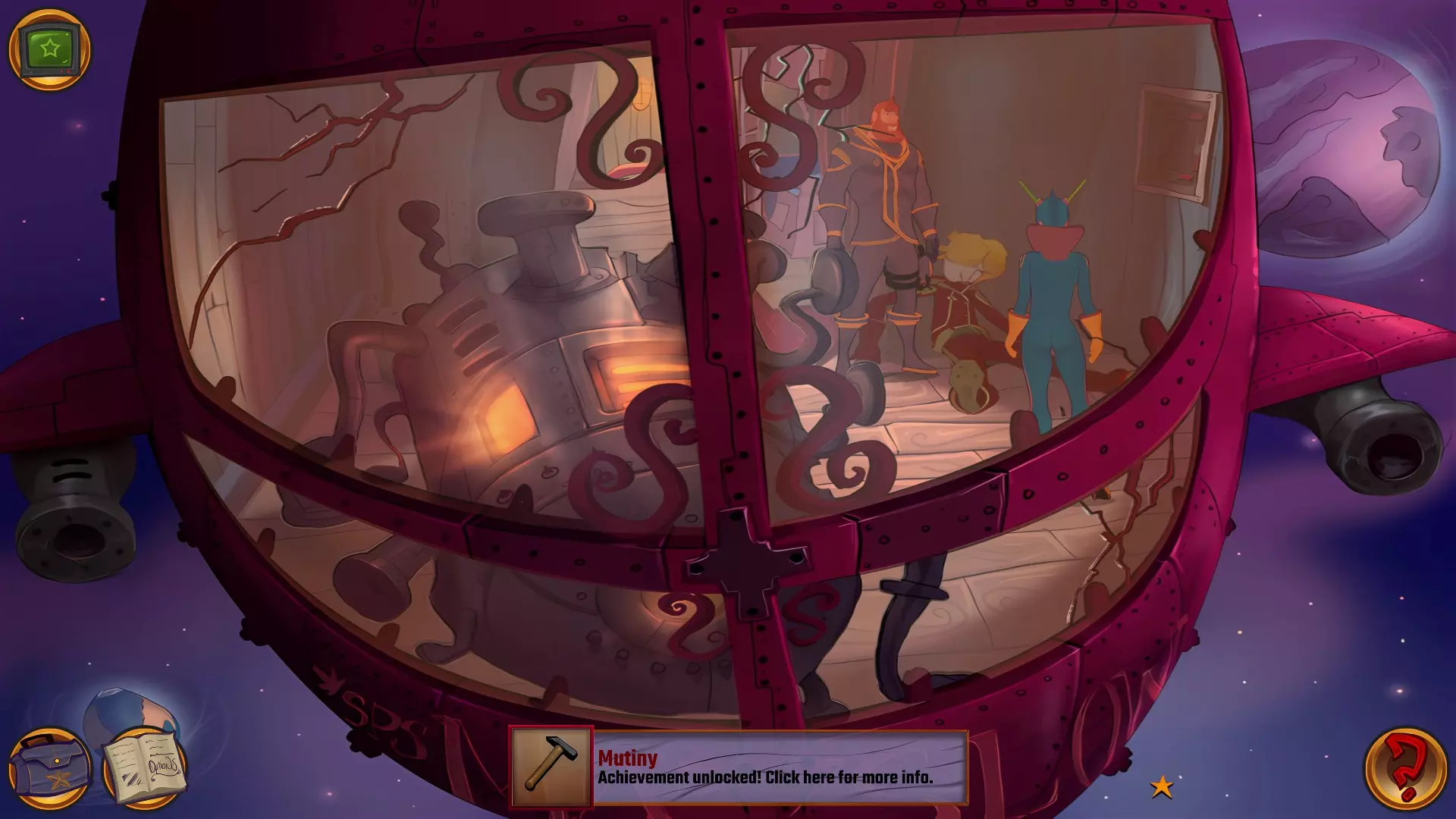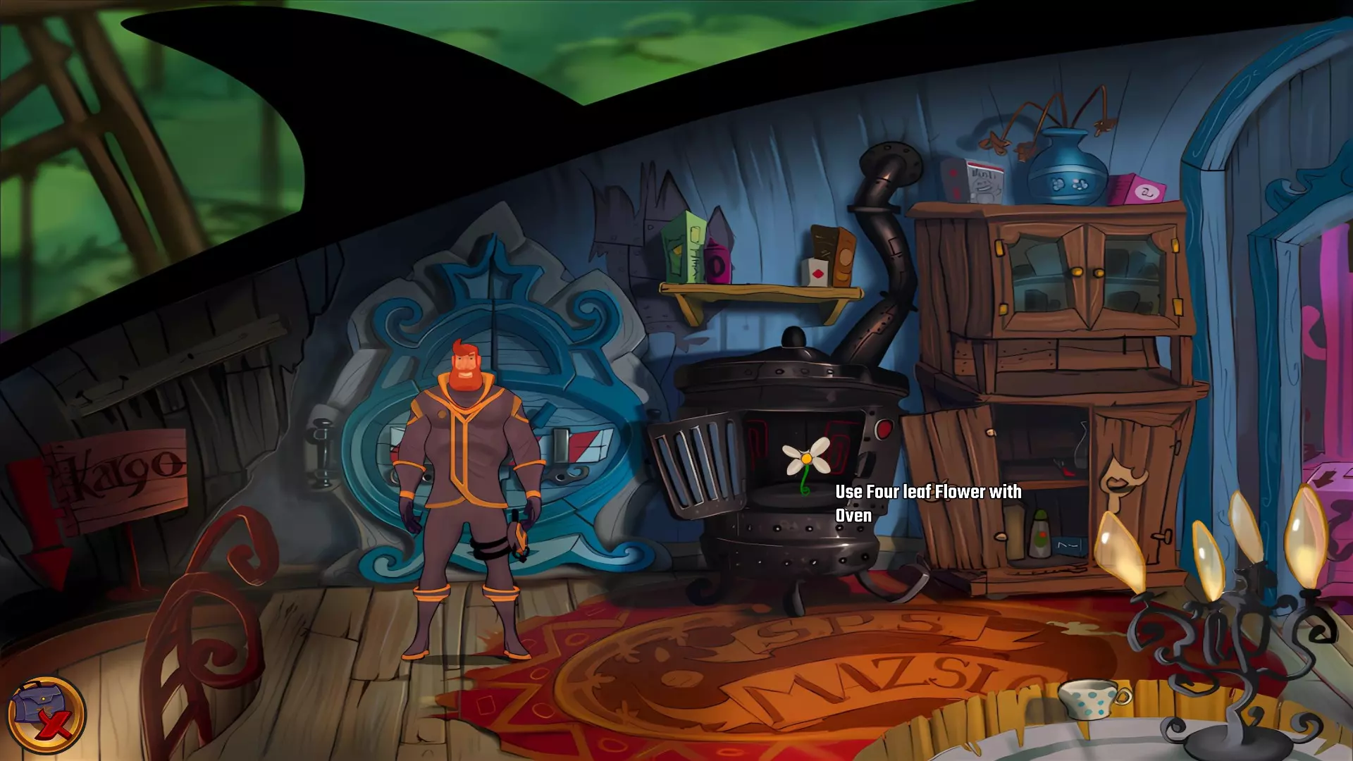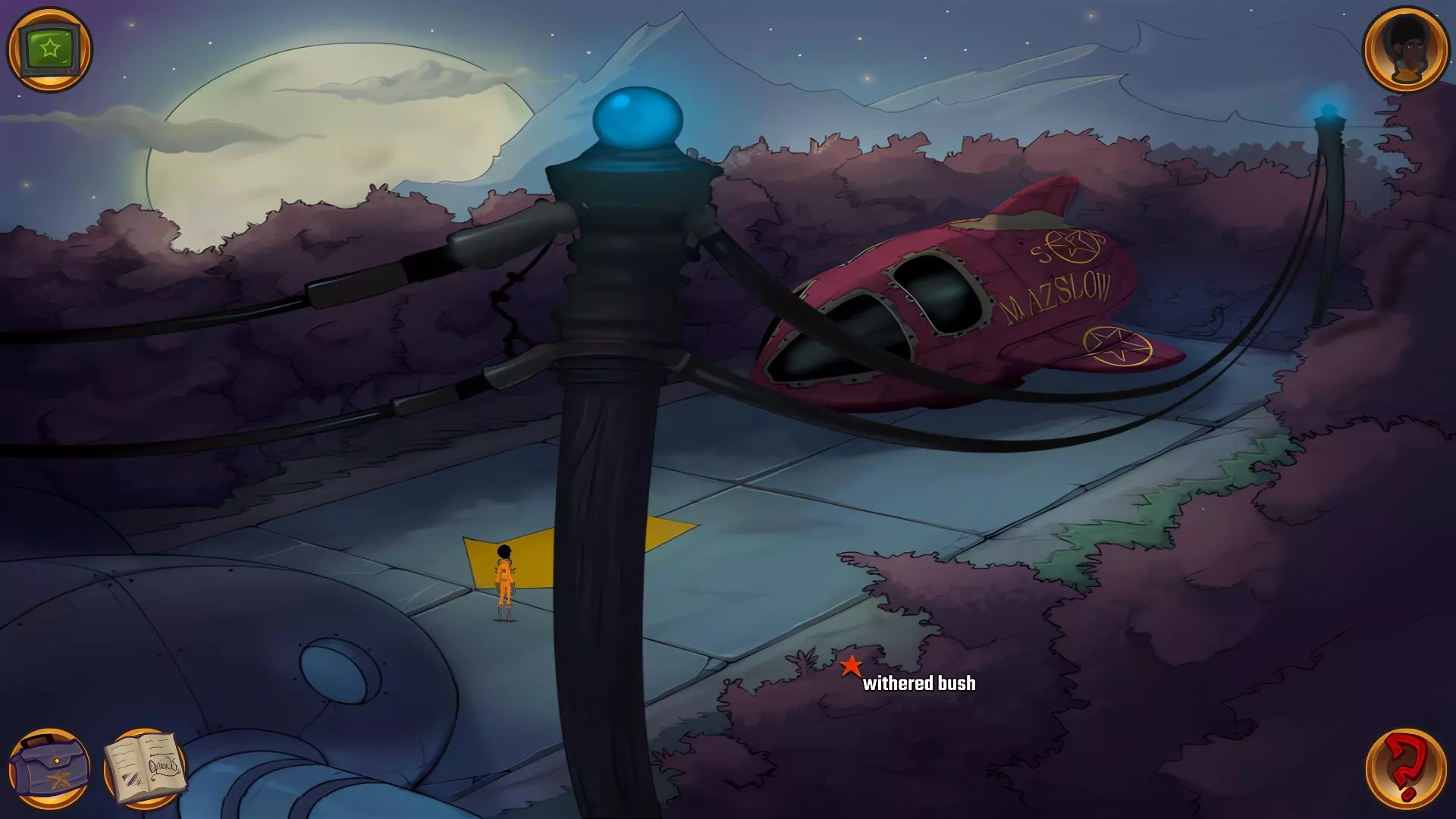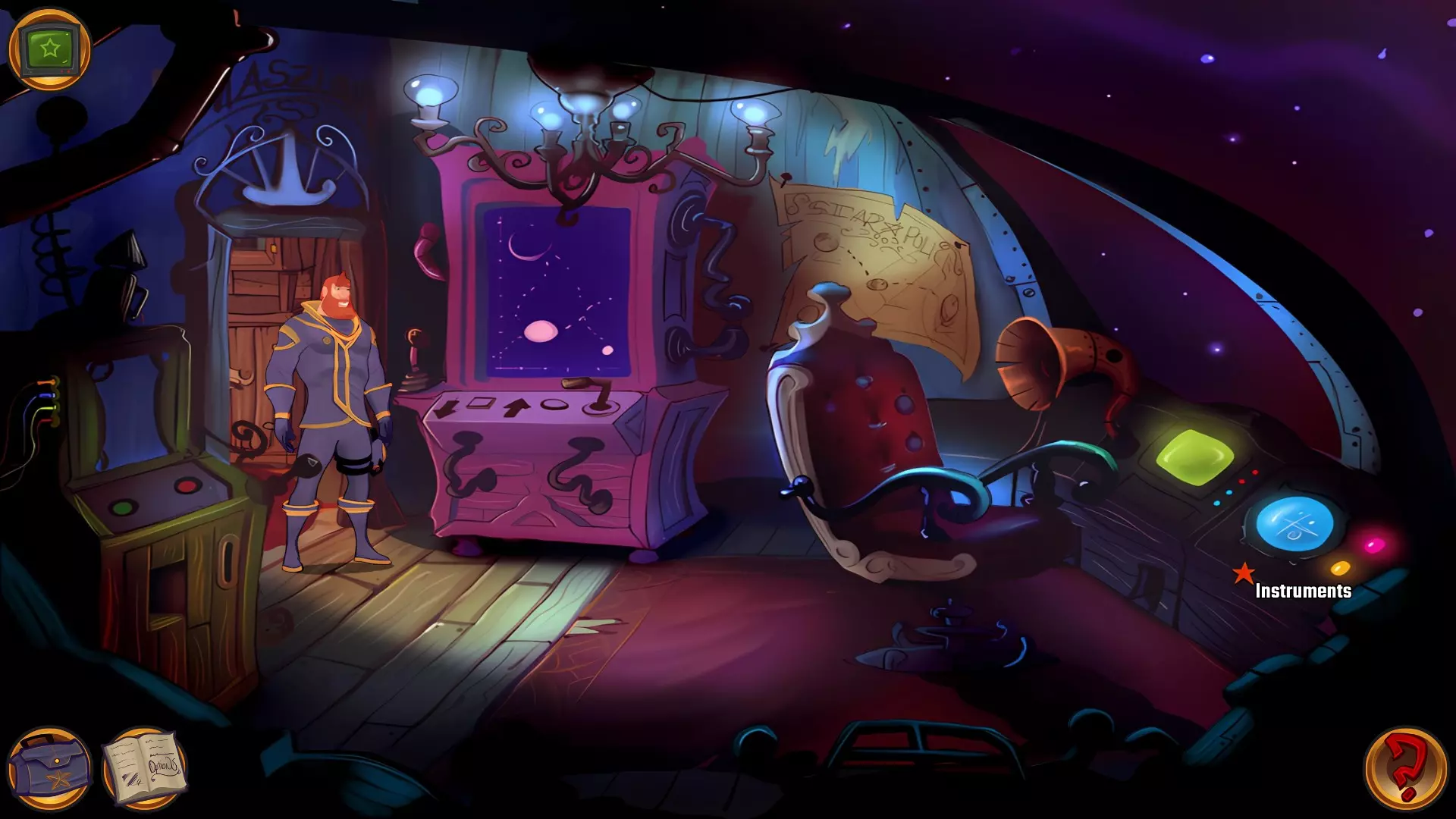 左上角的电视是菜单,内含保存、加载、更改设置或退出游戏的选项。 左下角有背包和笔记本,分别是你的物品栏和记录当前任务的地方。有时笔记本会显示绿色感叹号,为你提供一些游戏玩法提示。 右下角是问号图标,它会高亮显示所有可交互的物体和你可以走的路径。 提示:与物体、人物等互动时,有两个选项,你可能需要选择正确的选项来获得所需物品。这一机制也存在于物品栏中,与单纯点击物品不同。放大镜用于检查物品,它可以揭示世界中的信息——这些信息是角色在被指示抓取或使用物品时不会主动交互的内容,同时也能近距离查看物品栏中的物品。