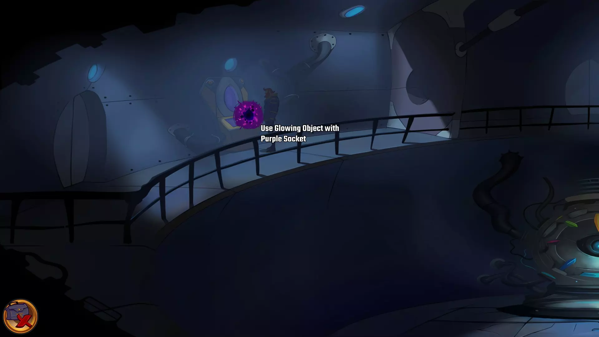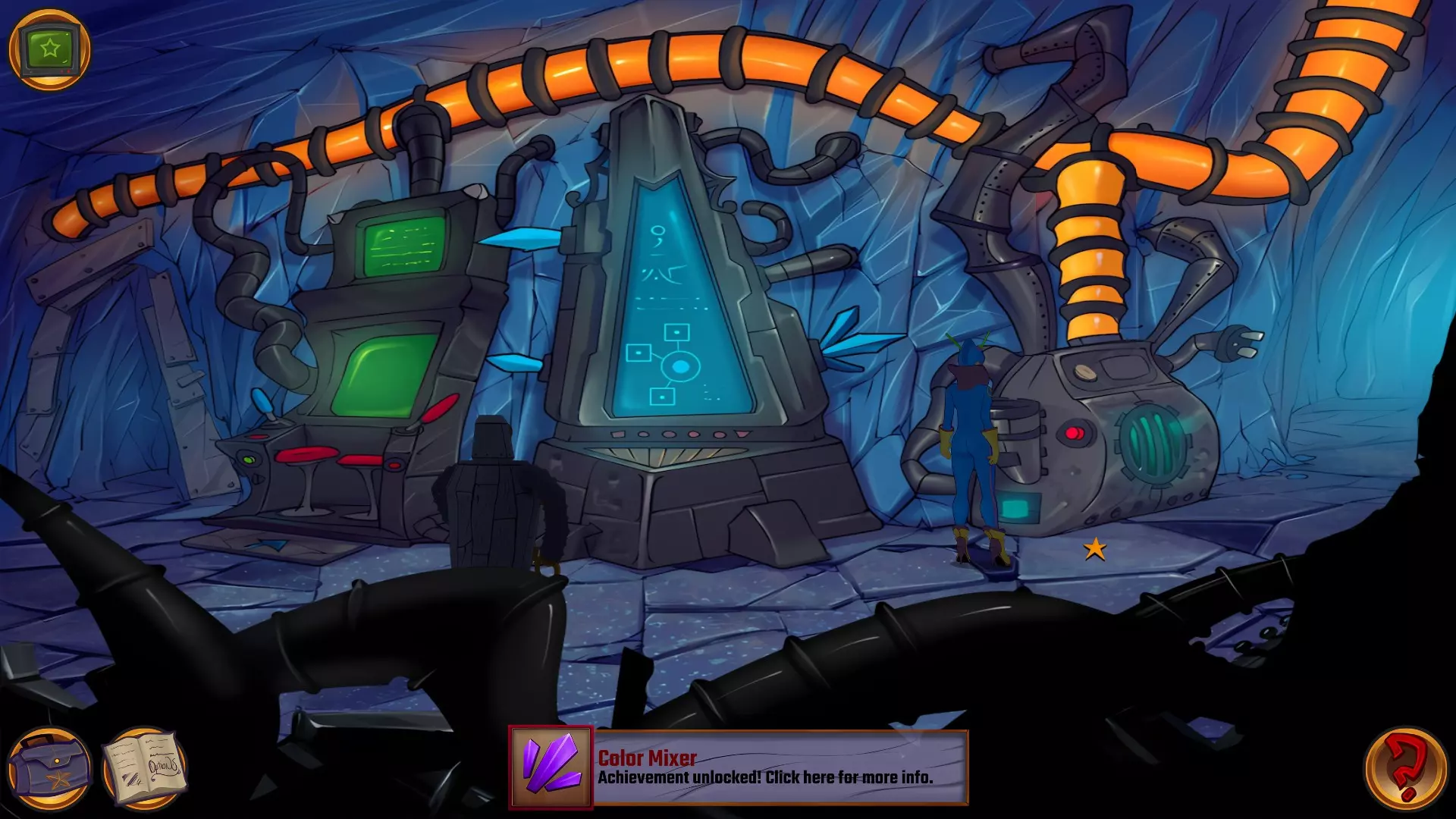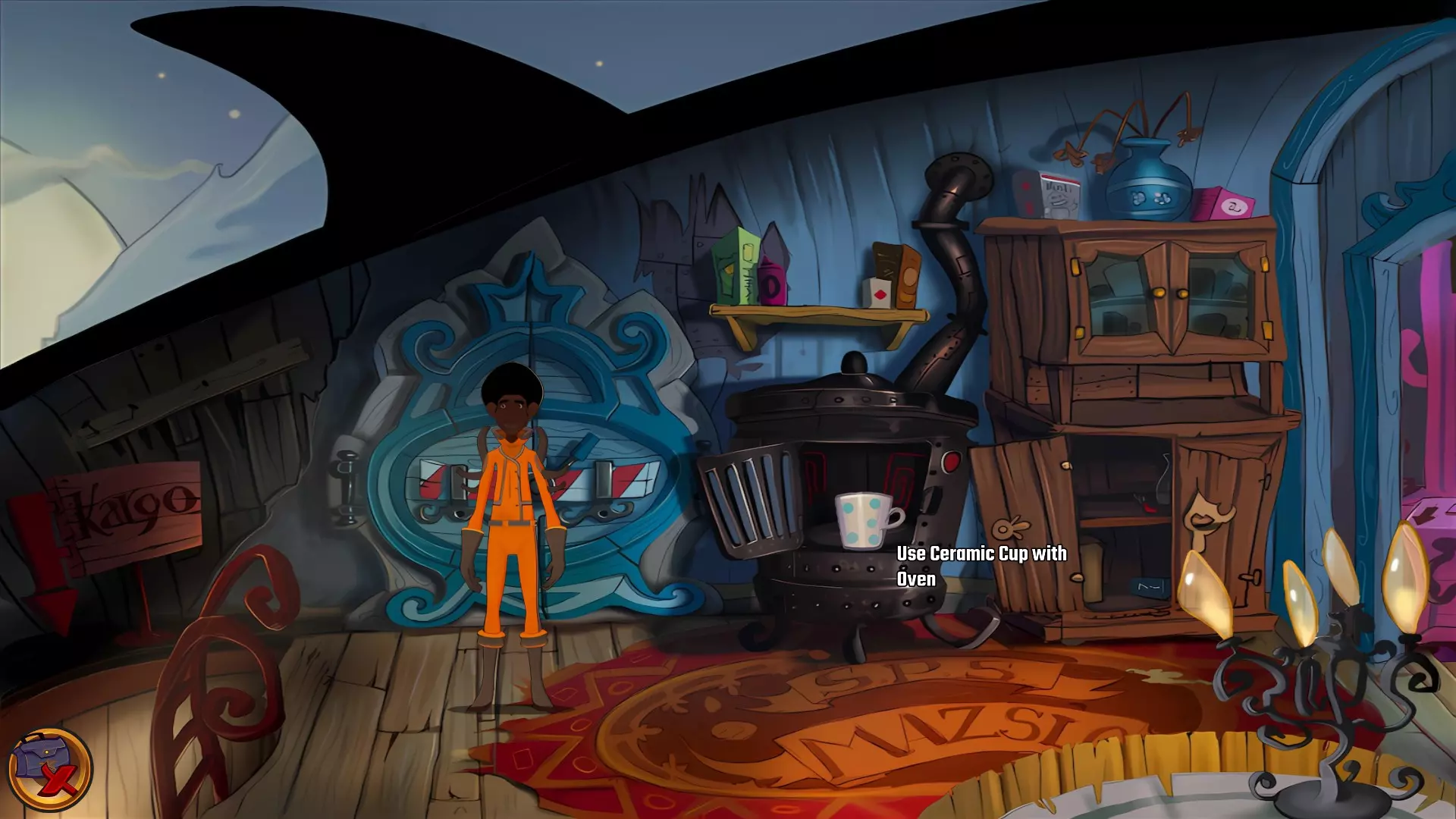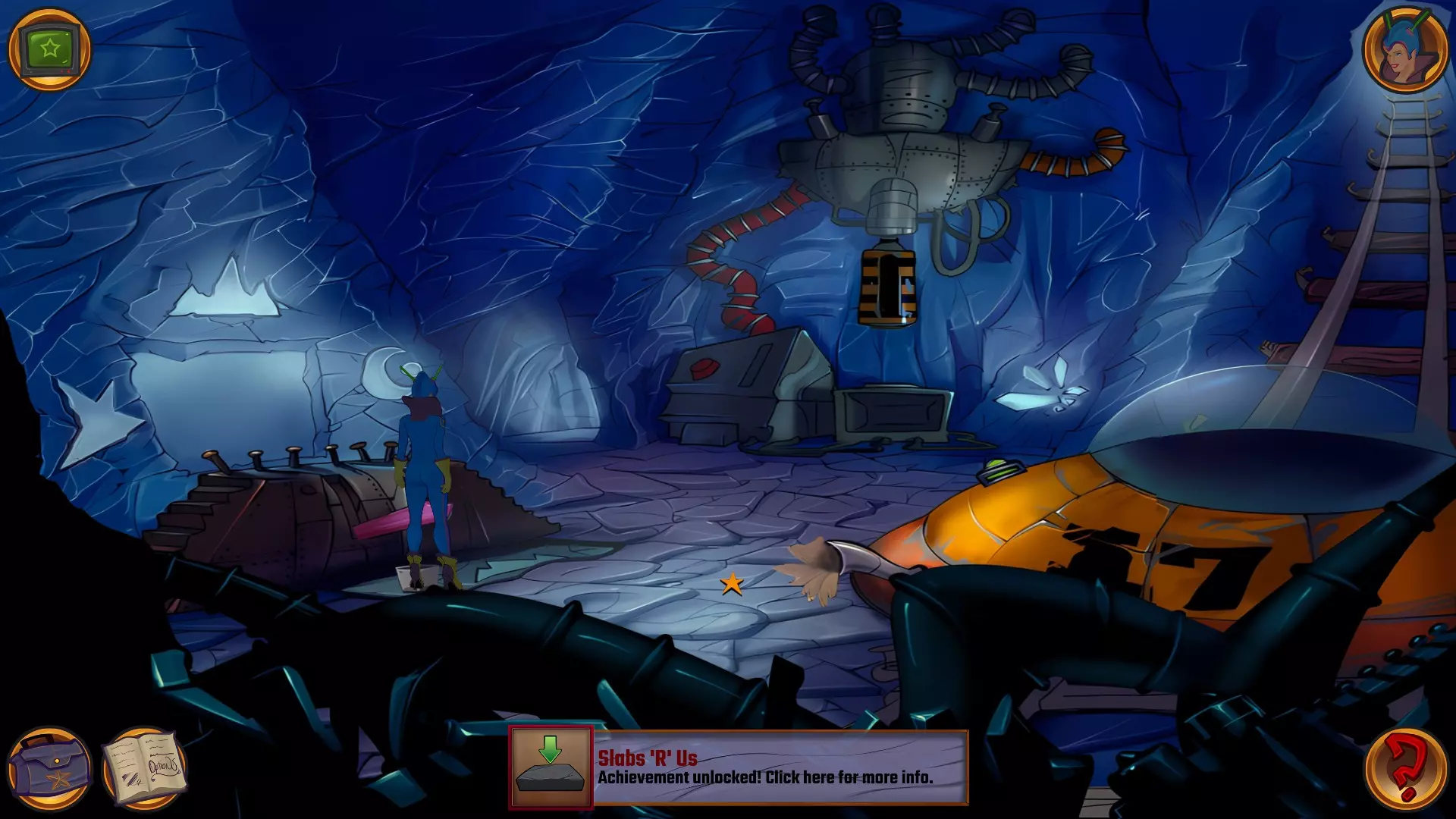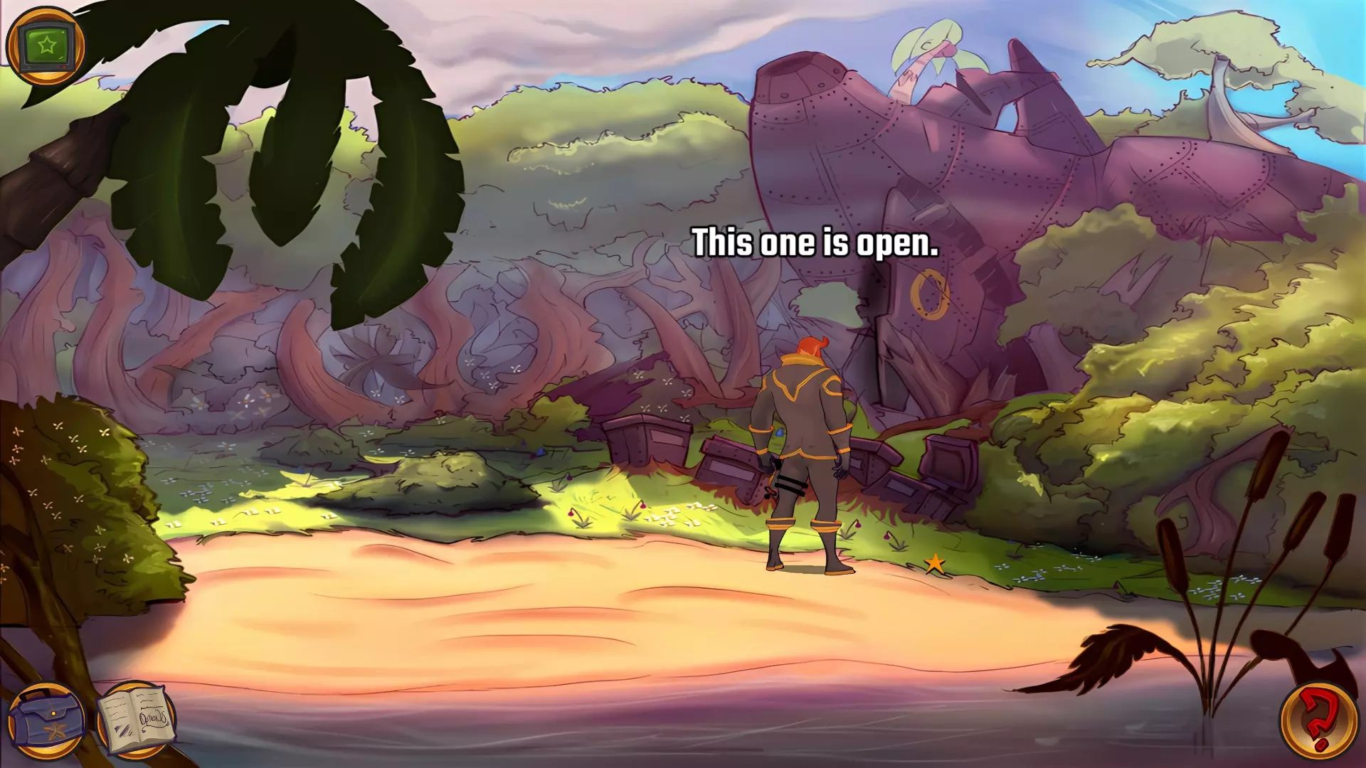 左上角的电视是菜单,内含保存、加载、更改设置或退出游戏的选项。 左下角有背包和笔记本,分别是你的物品栏和记录当前任务的地方。有时笔记本会显示绿色感叹号,为你提供一些游戏玩法提示。 右下角是问号图标,它会高亮显示所有可交互的物体和你可以走的路径。 提示:与物体、人物等互动时,有两个选项,你可能需要选择正确的选项来获得所需物品。这一机制也存在于物品栏中,与单纯点击物品不同。放大镜用于检查物品,它可以揭示世界中的信息——这些信息是角色在被指示抓取或使用物品时不会主动交互的内容,同时也能近距离查看物品栏中的物品。