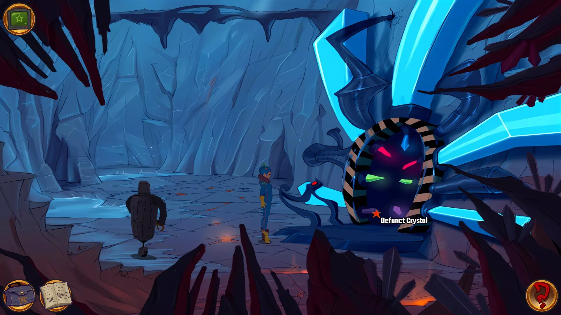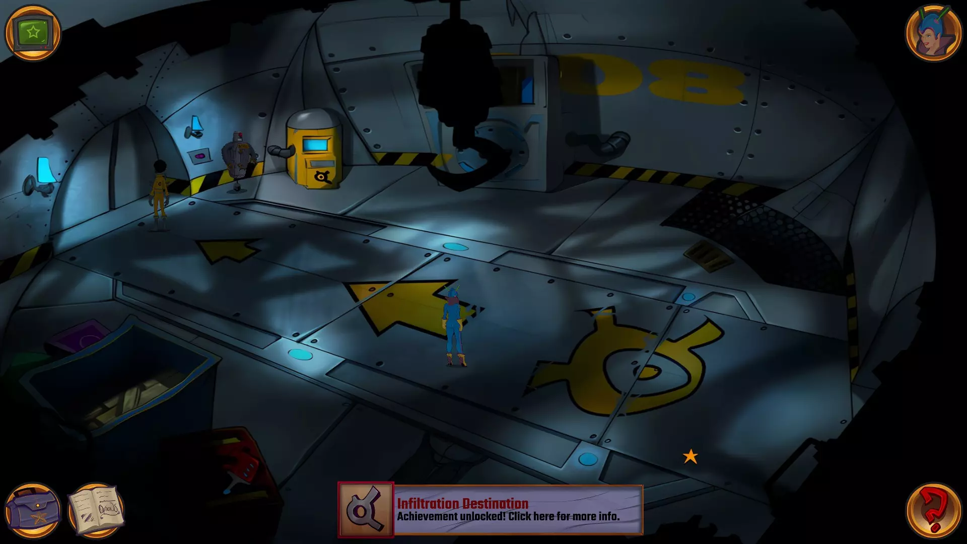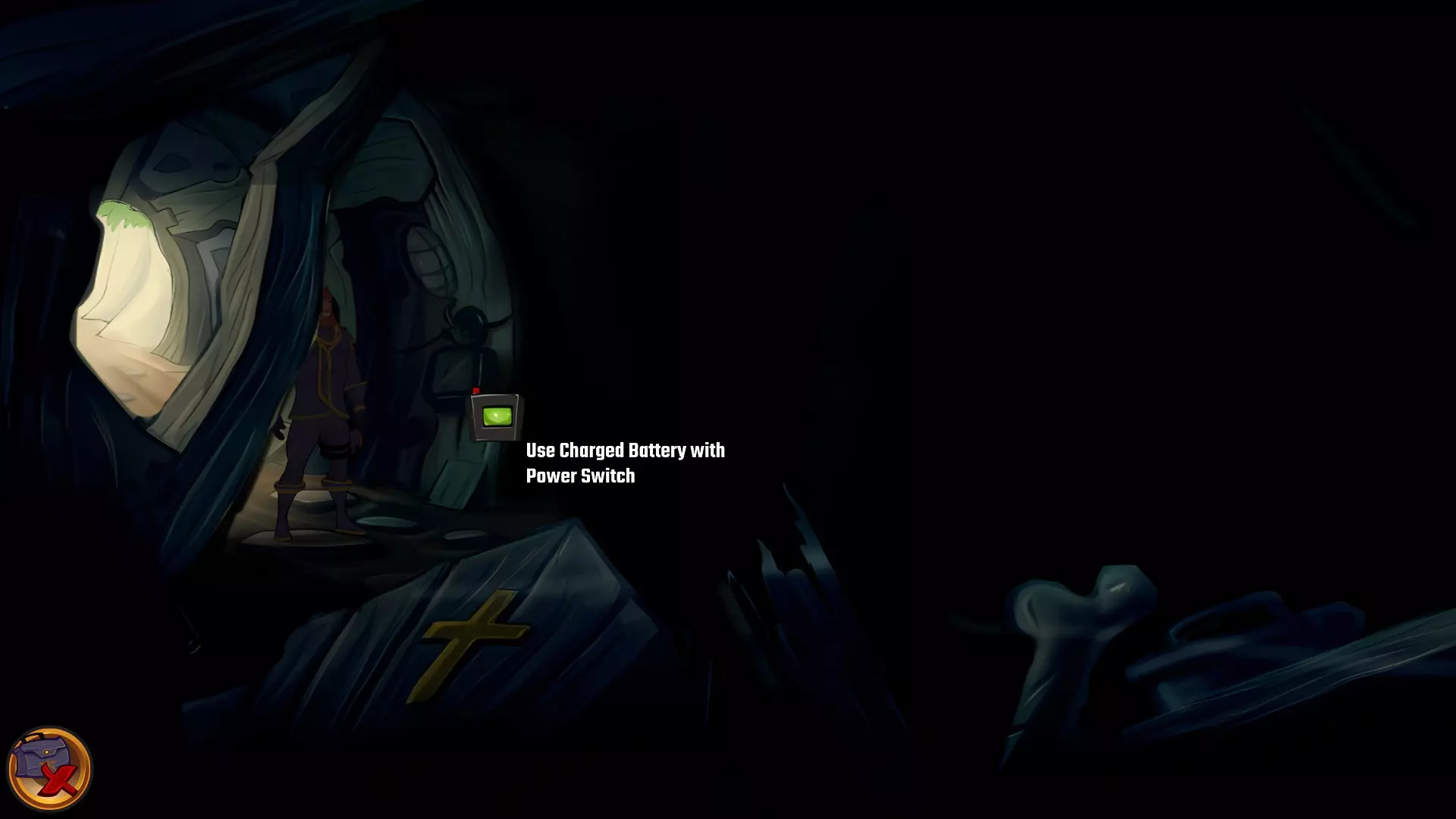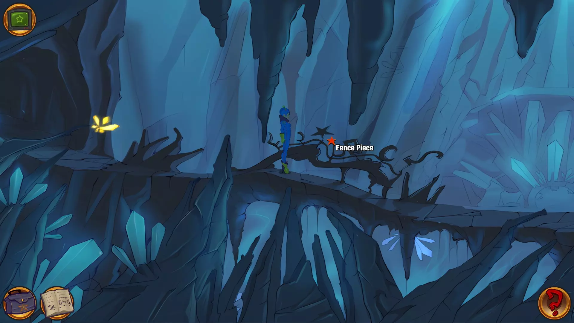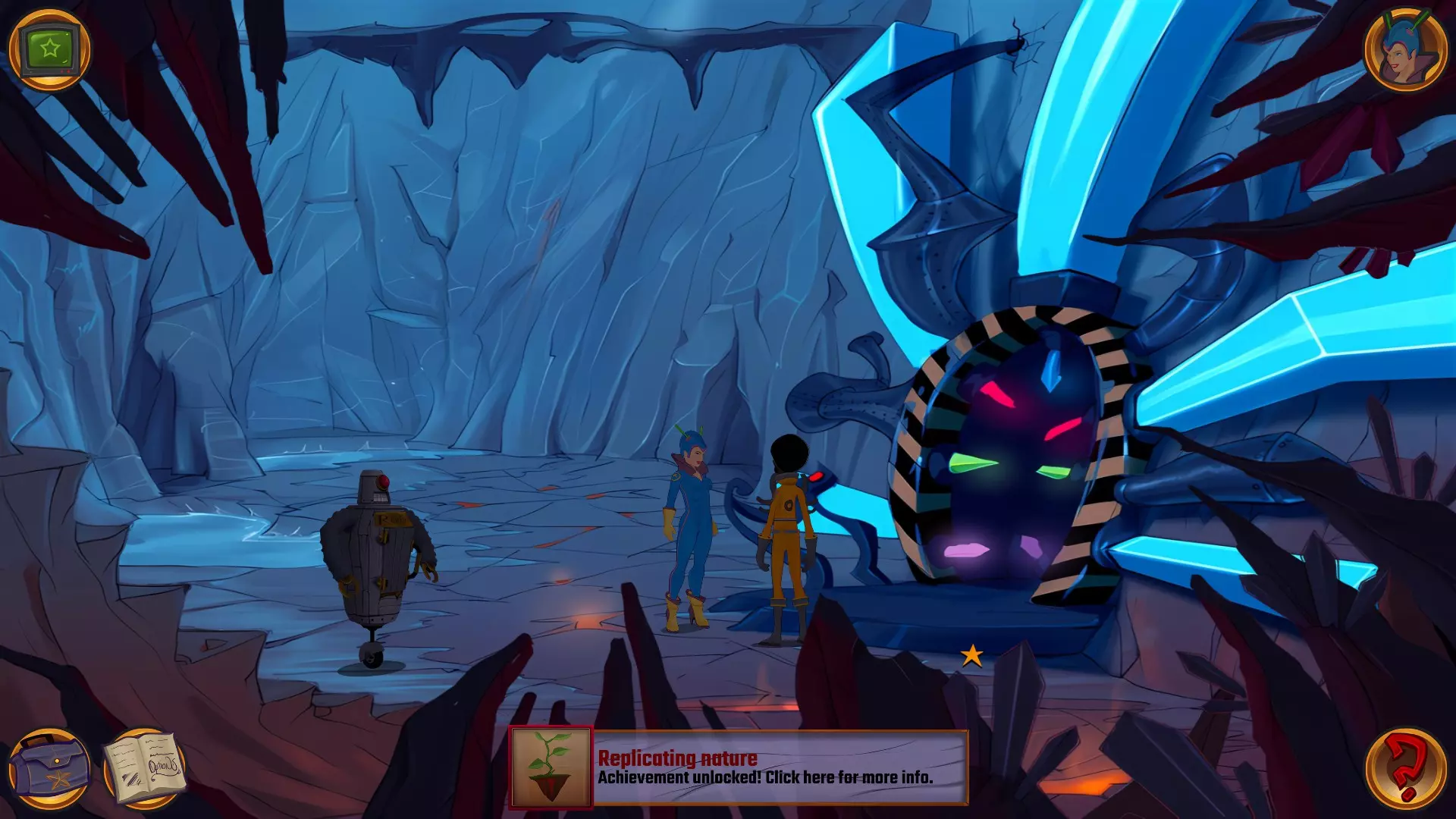 左上角的电视是菜单,内含保存、加载、更改设置或退出游戏的选项。 左下角有背包和笔记本,分别是你的物品栏和记录当前任务的地方。有时笔记本会显示绿色感叹号,为你提供一些游戏玩法提示。 右下角是问号图标,它会高亮显示所有可交互的物体和你可以走的路径。 提示:与物体、人物等互动时,有两个选项,你可能需要选择正确的选项来获得所需物品。这一机制也存在于物品栏中,与单纯点击物品不同。放大镜用于检查物品,它可以揭示世界中的信息——这些信息是角色在被指示抓取或使用物品时不会主动交互的内容,同时也能近距离查看物品栏中的物品。
