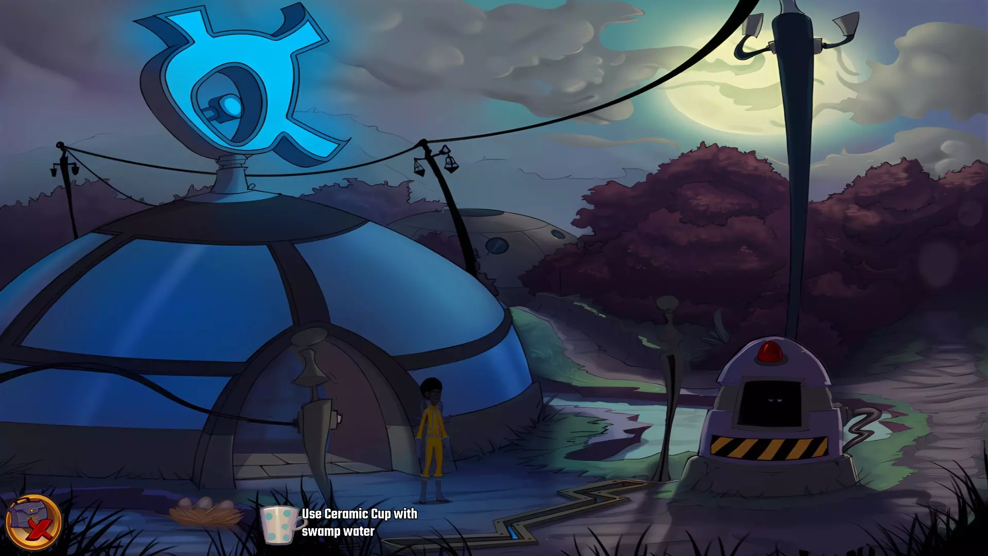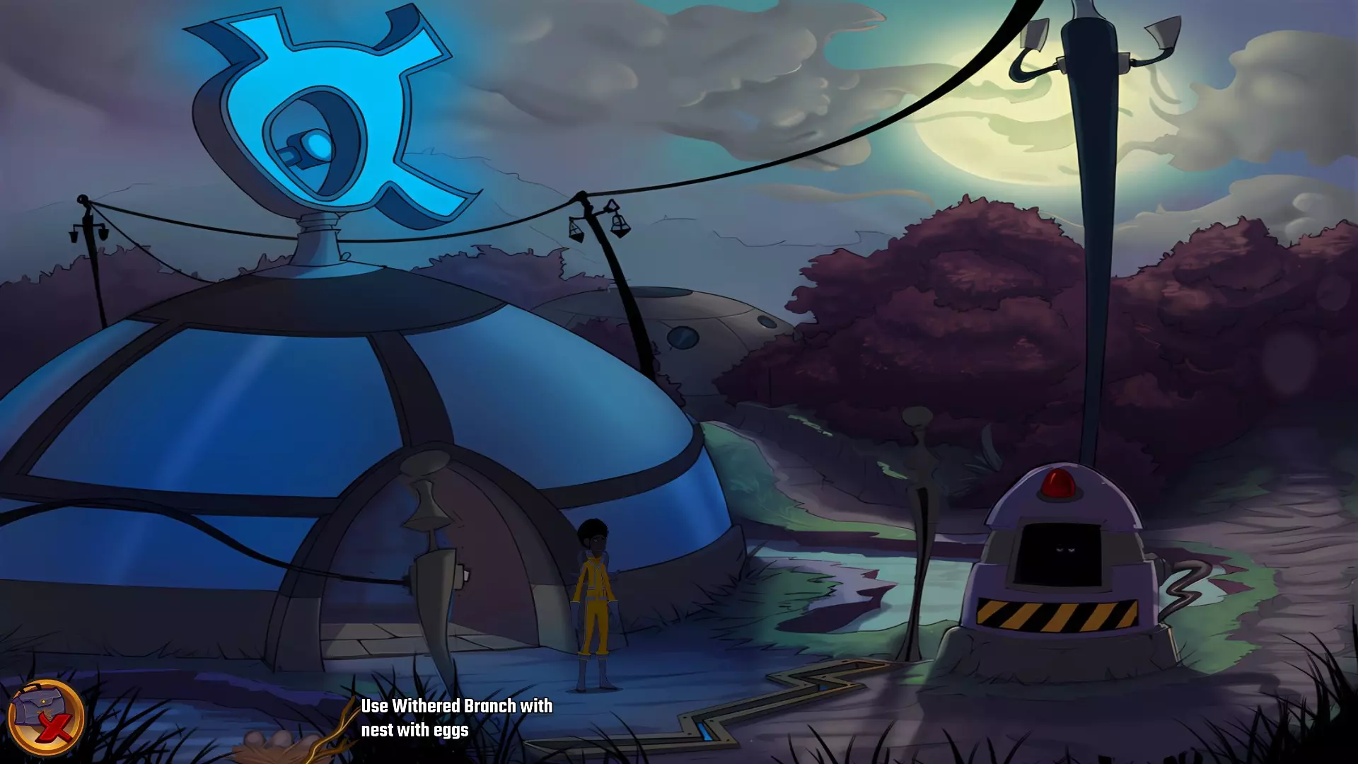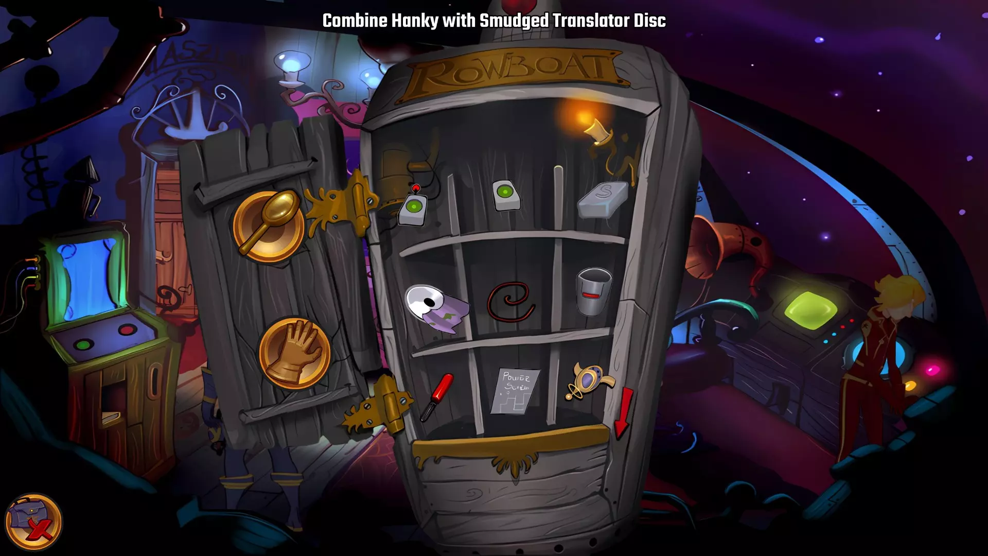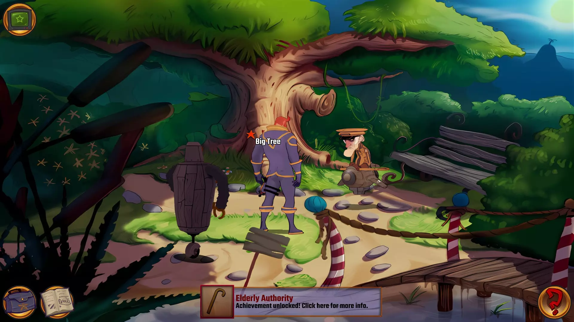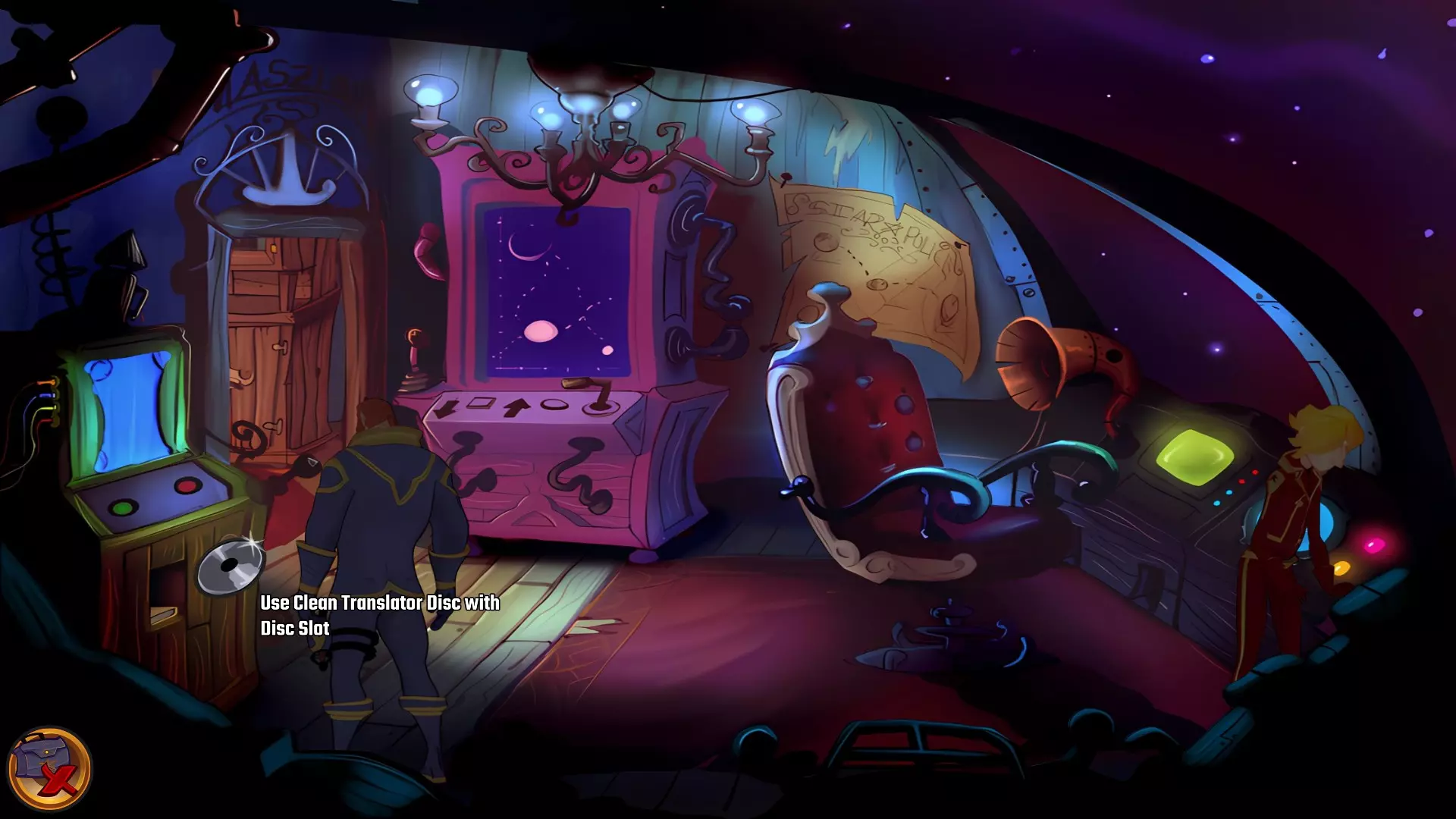 左上角的电视是菜单,内含保存、加载、更改设置或退出游戏的选项。 左下角有背包和笔记本,分别是你的物品栏和记录当前任务的地方。有时笔记本会显示绿色感叹号,为你提供一些游戏玩法提示。 右下角是问号图标,它会高亮显示所有可交互的物体和你可以走的路径。 提示:与物体、人物等互动时,有两个选项,你可能需要选择正确的选项来获得所需物品。这一机制也存在于物品栏中,与单纯点击物品不同。放大镜用于检查物品,它可以揭示世界中的信息——这些信息是角色在被指示抓取或使用物品时不会主动交互的内容,同时也能近距离查看物品栏中的物品。