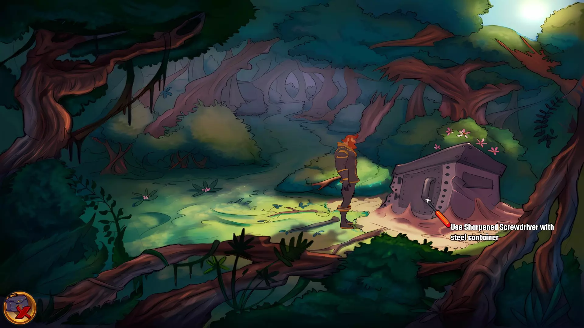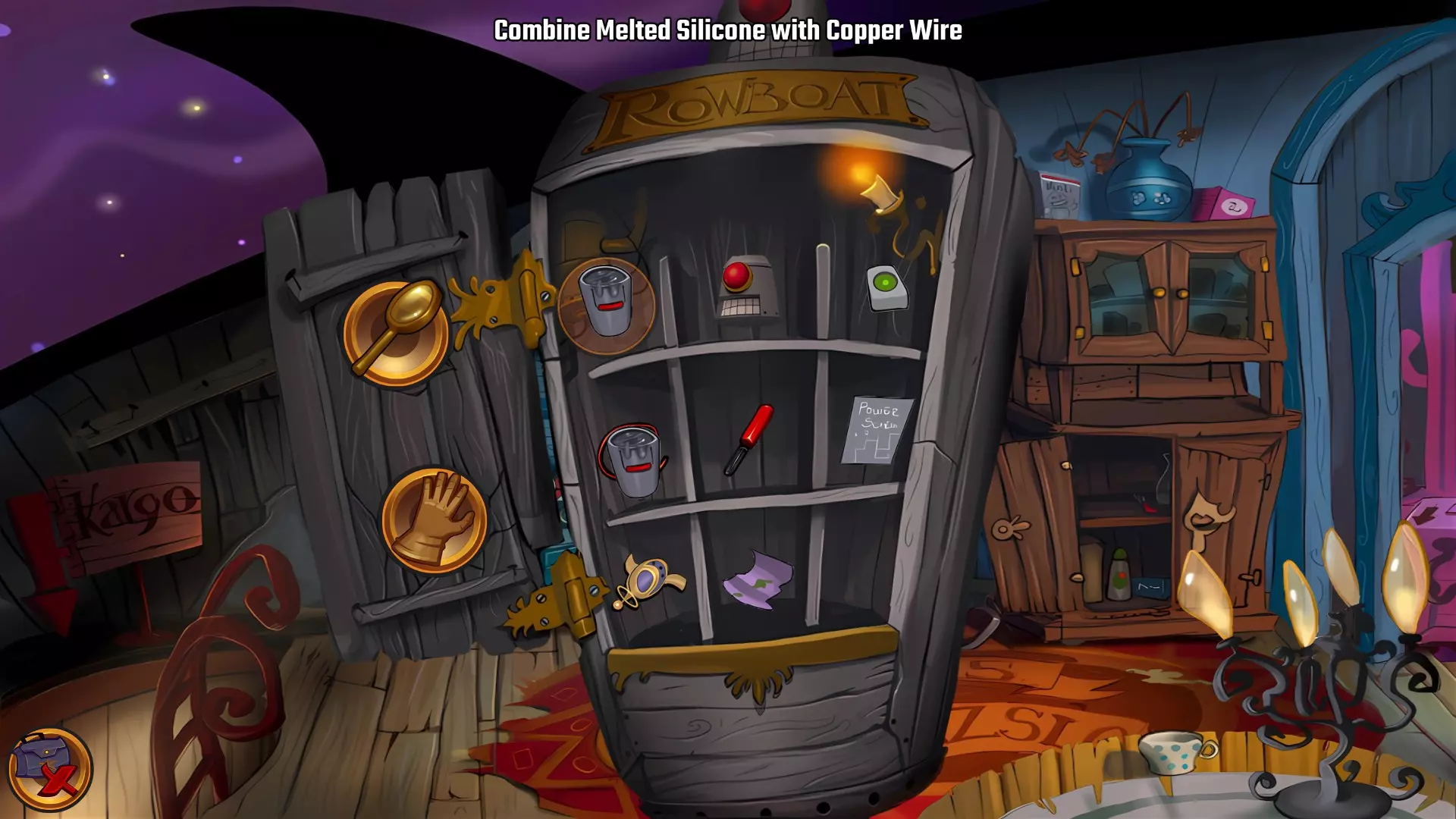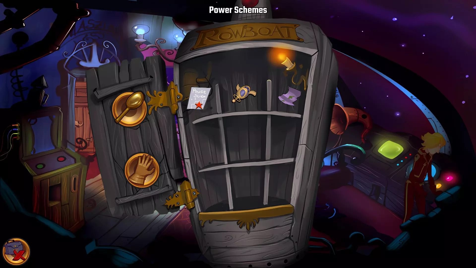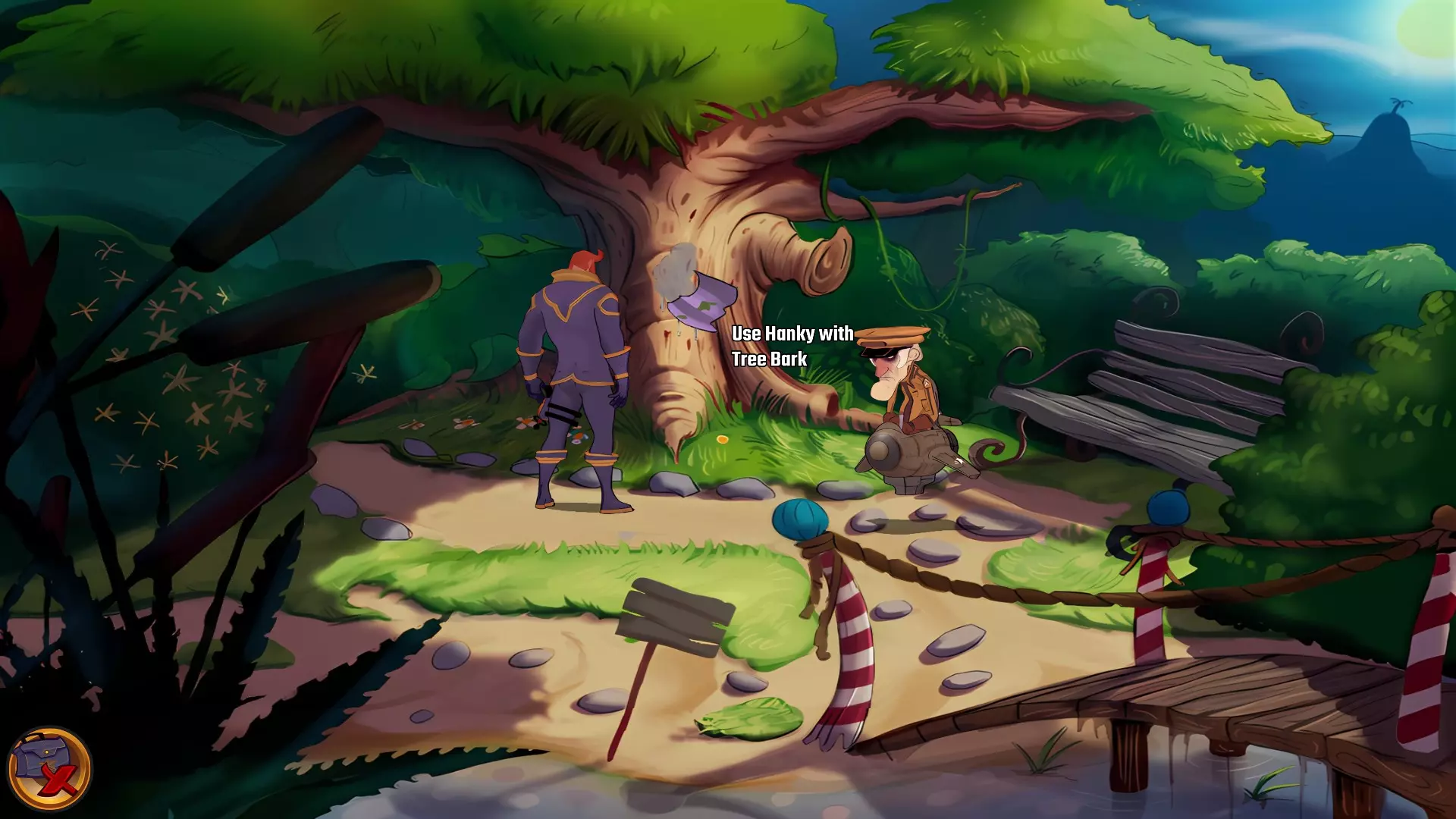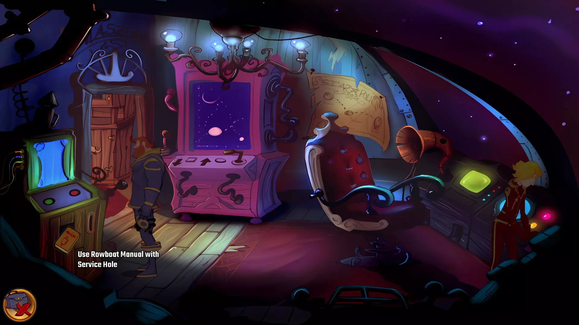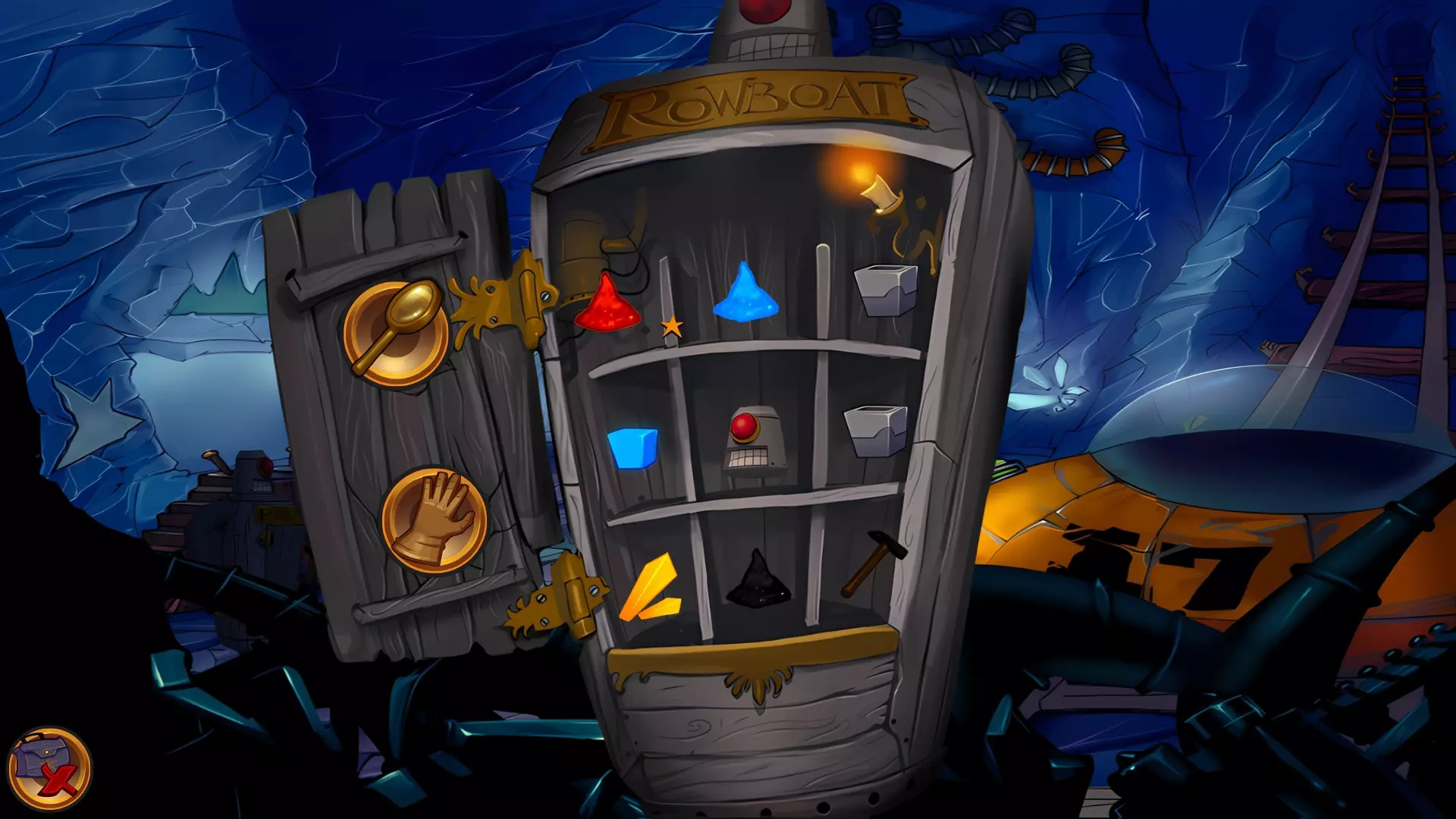 左上角的电视是菜单,内含保存、加载、更改设置或退出游戏的选项。 左下角有背包和笔记本,分别是你的物品栏和记录当前任务的地方。有时笔记本会显示绿色感叹号,为你提供一些游戏玩法提示。 右下角是问号图标,它会高亮显示所有可交互的物体和你可以走的路径。 提示:与物体、人物等互动时,有两个选项,你可能需要选择正确的选项来获得所需物品。这一机制也存在于物品栏中,与单纯点击物品不同。放大镜用于检查物品,它可以揭示世界中的信息——这些信息是角色在被指示抓取或使用物品时不会主动交互的内容,同时也能近距离查看物品栏中的物品。
