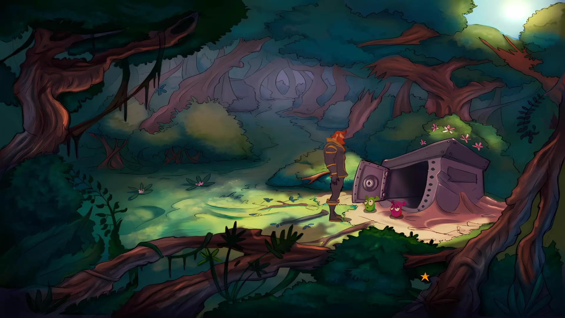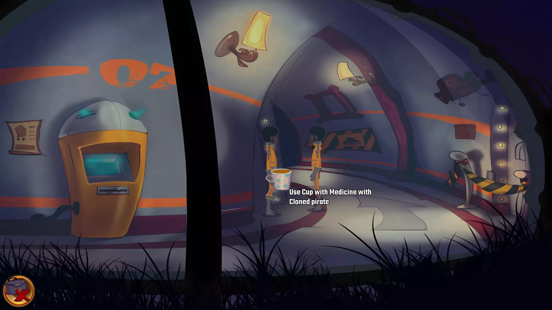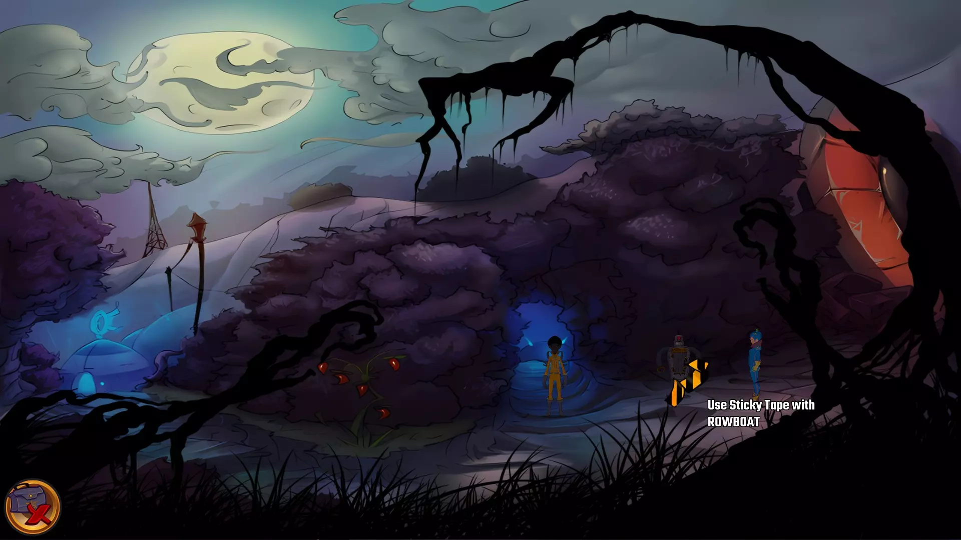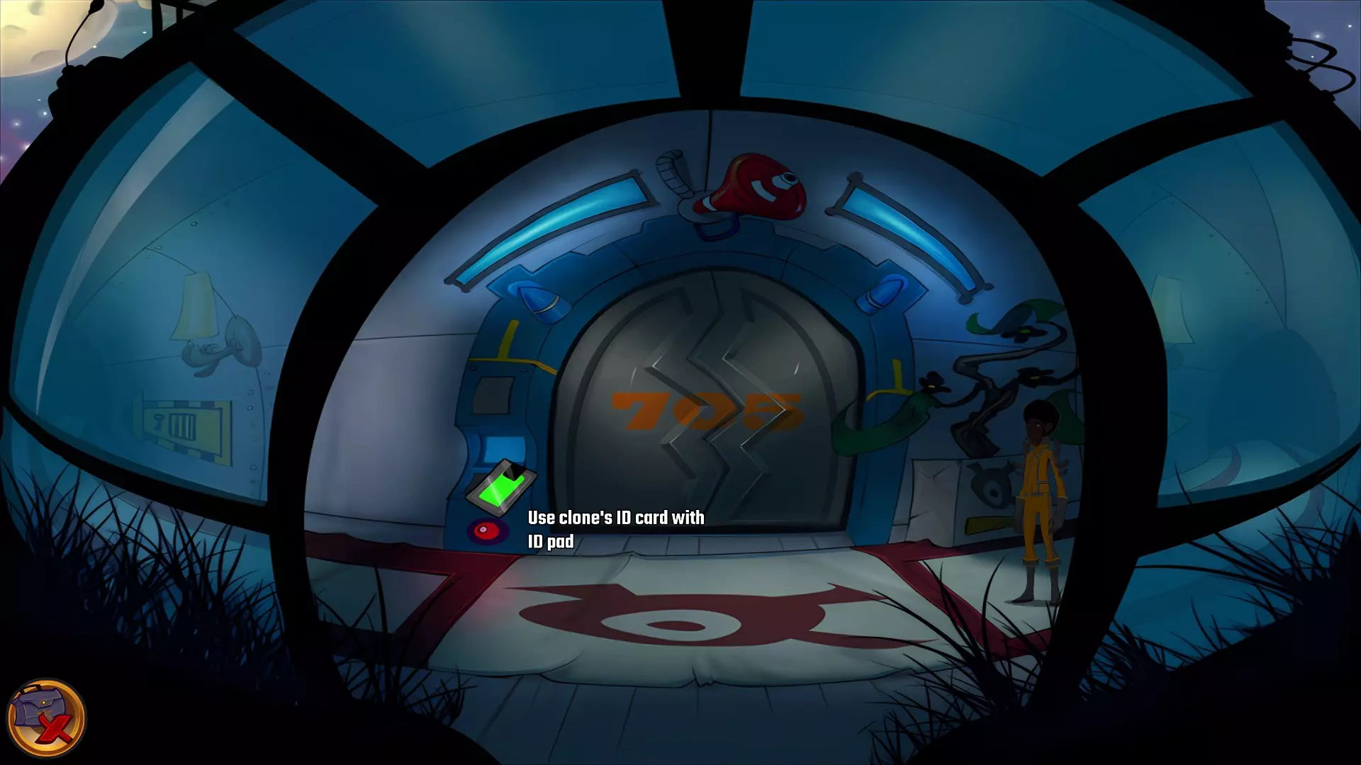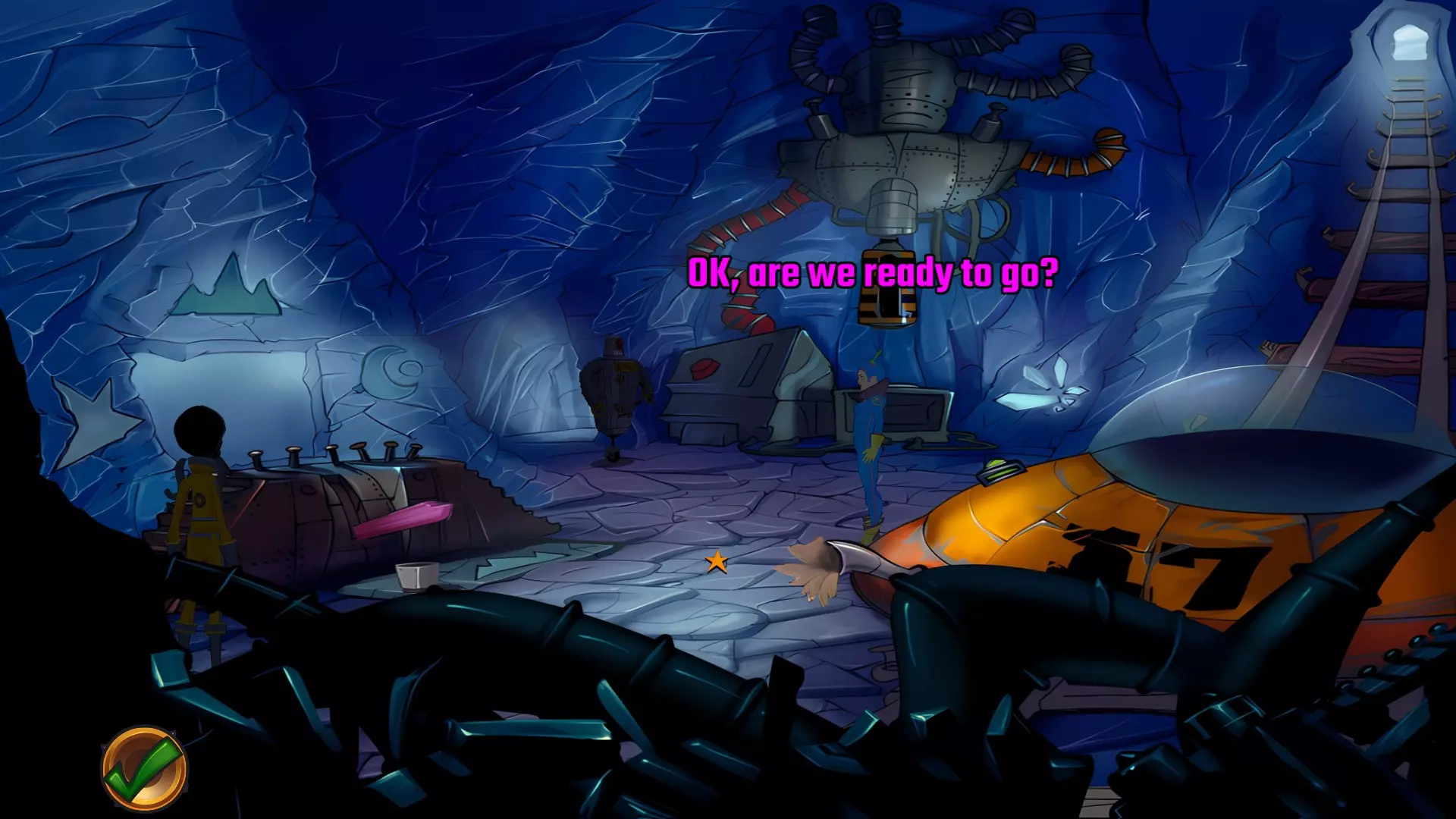 左上角的电视是菜单,内含保存、加载、更改设置或退出游戏的选项。 左下角有背包和笔记本,分别是你的物品栏和记录当前任务的地方。有时笔记本会显示绿色感叹号,为你提供一些游戏玩法提示。 右下角是问号图标,它会高亮显示所有可交互的物体和你可以走的路径。 提示:与物体、人物等互动时,有两个选项,你可能需要选择正确的选项来获得所需物品。这一机制也存在于物品栏中,与单纯点击物品不同。放大镜用于检查物品,它可以揭示世界中的信息——这些信息是角色在被指示抓取或使用物品时不会主动交互的内容,同时也能近距离查看物品栏中的物品。