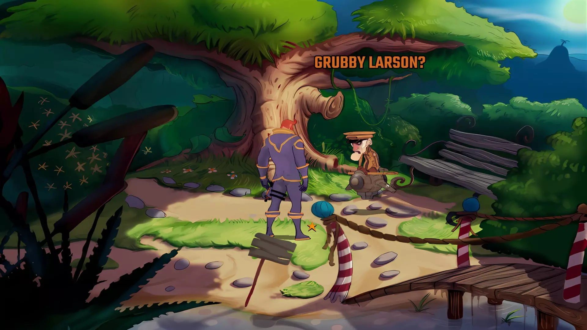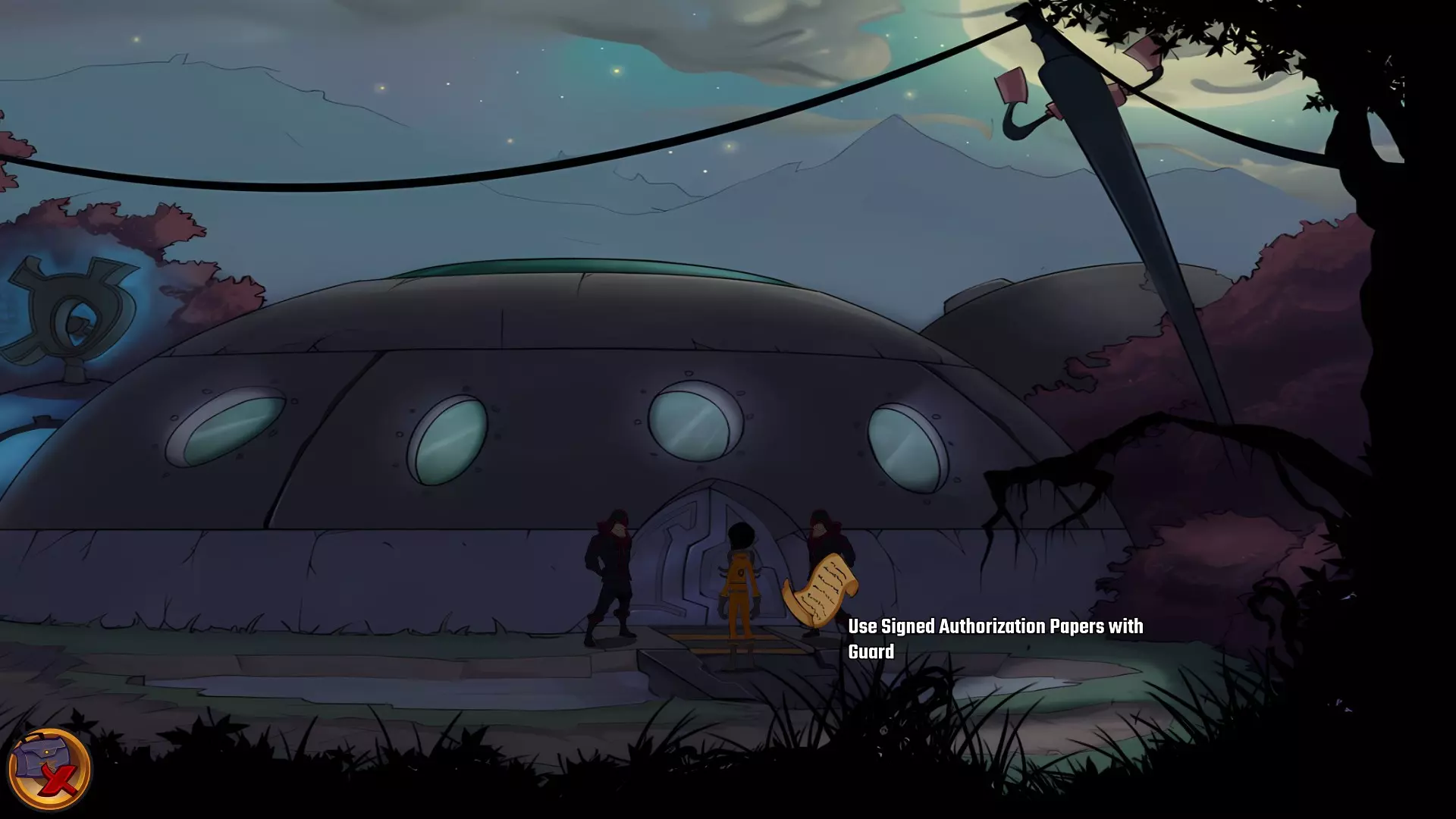 检查那株吓人的植物并拿走致命辣椒。 前往划艇附近的开口处,由此可到达克里布仓库外部。 与站在门边的守卫交谈。没有合适的文件你无法进入仓库。