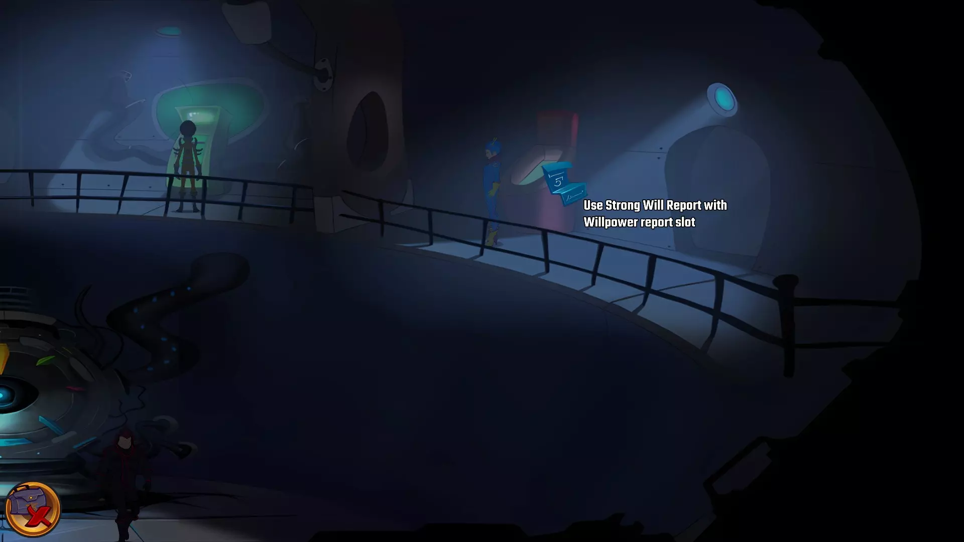 切换至露娜,穿过下水道,从左侧的门离开监狱。穿过守卫,有另一扇门通往DNA复制器,里面有一台不同的机器。将坚定意志报告放入意志力机器的意志力报告插槽中。