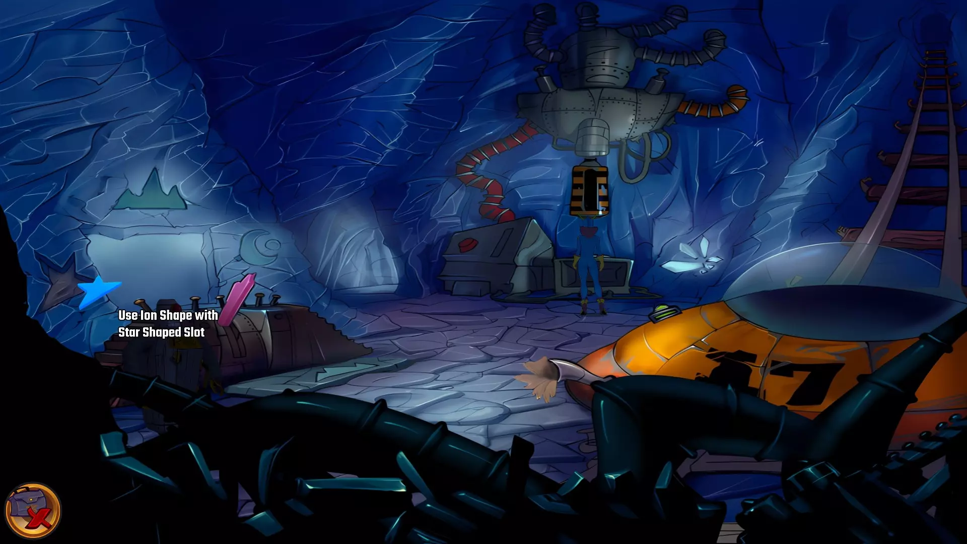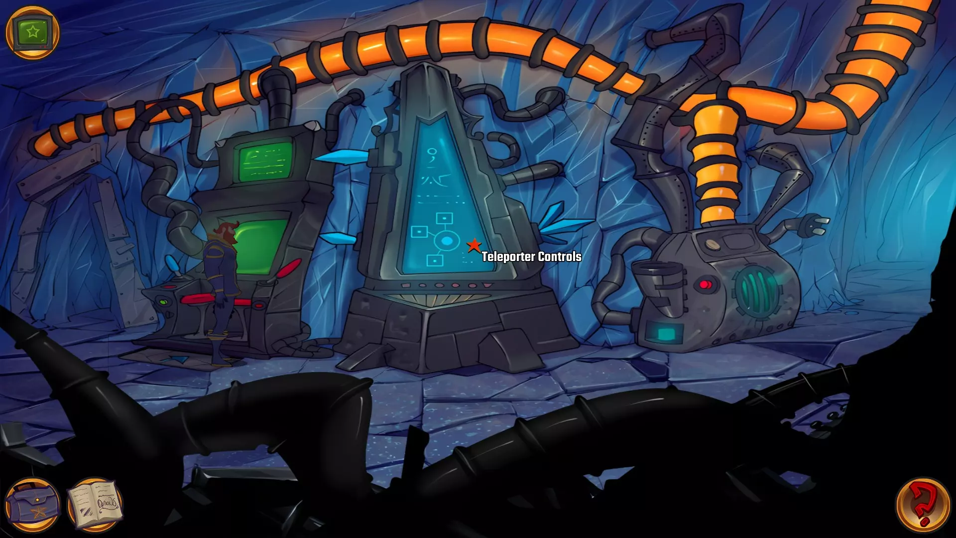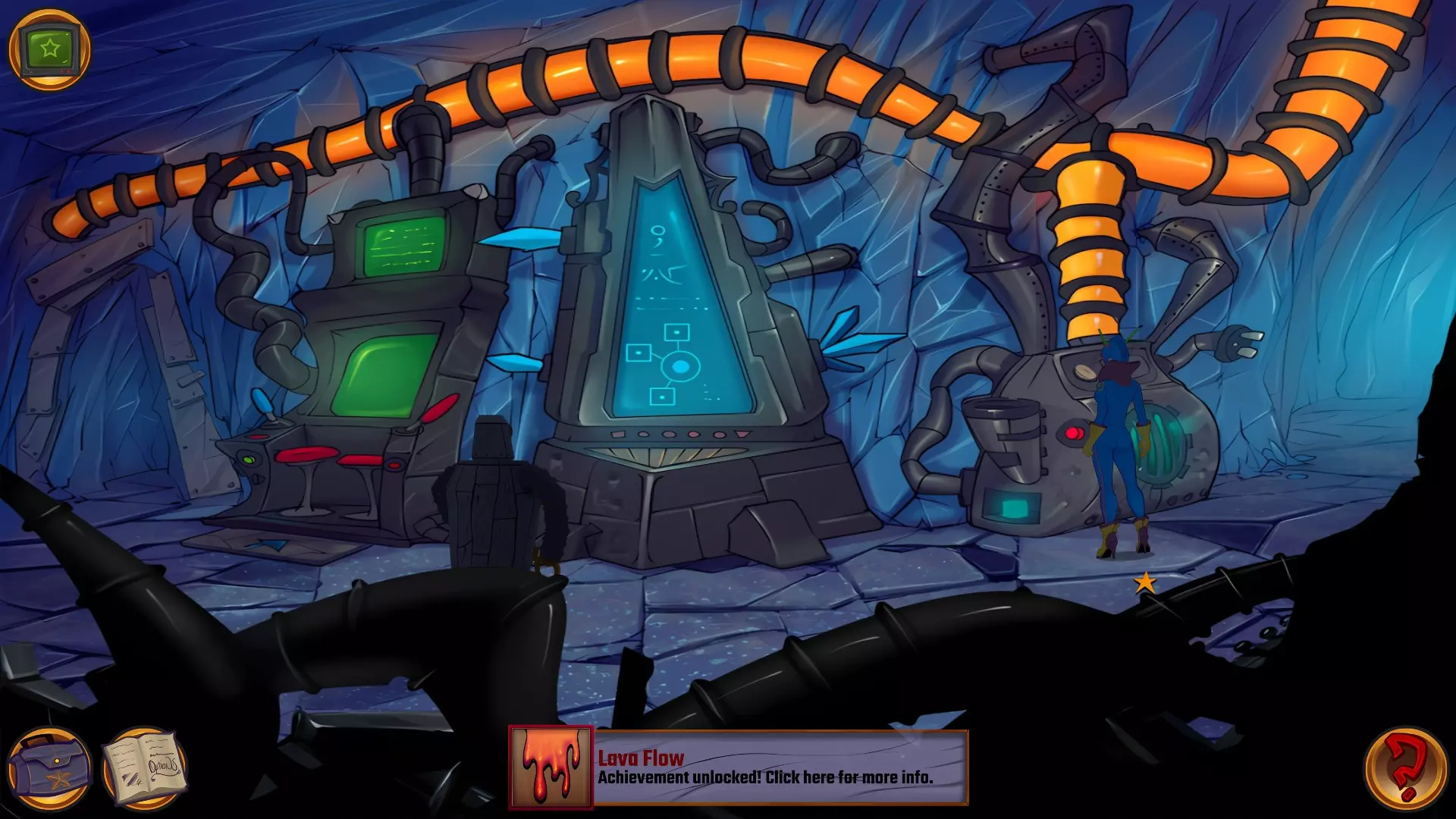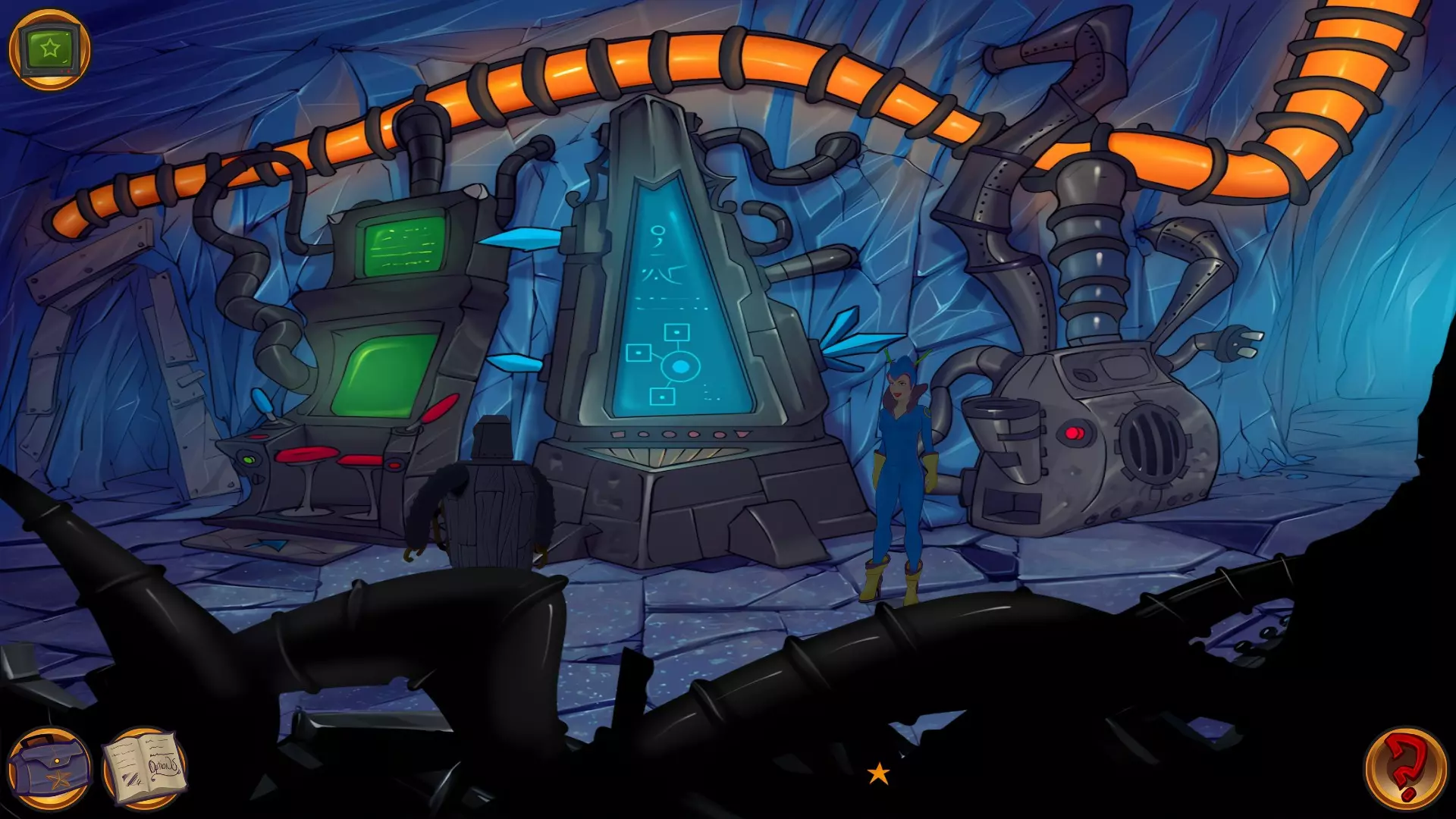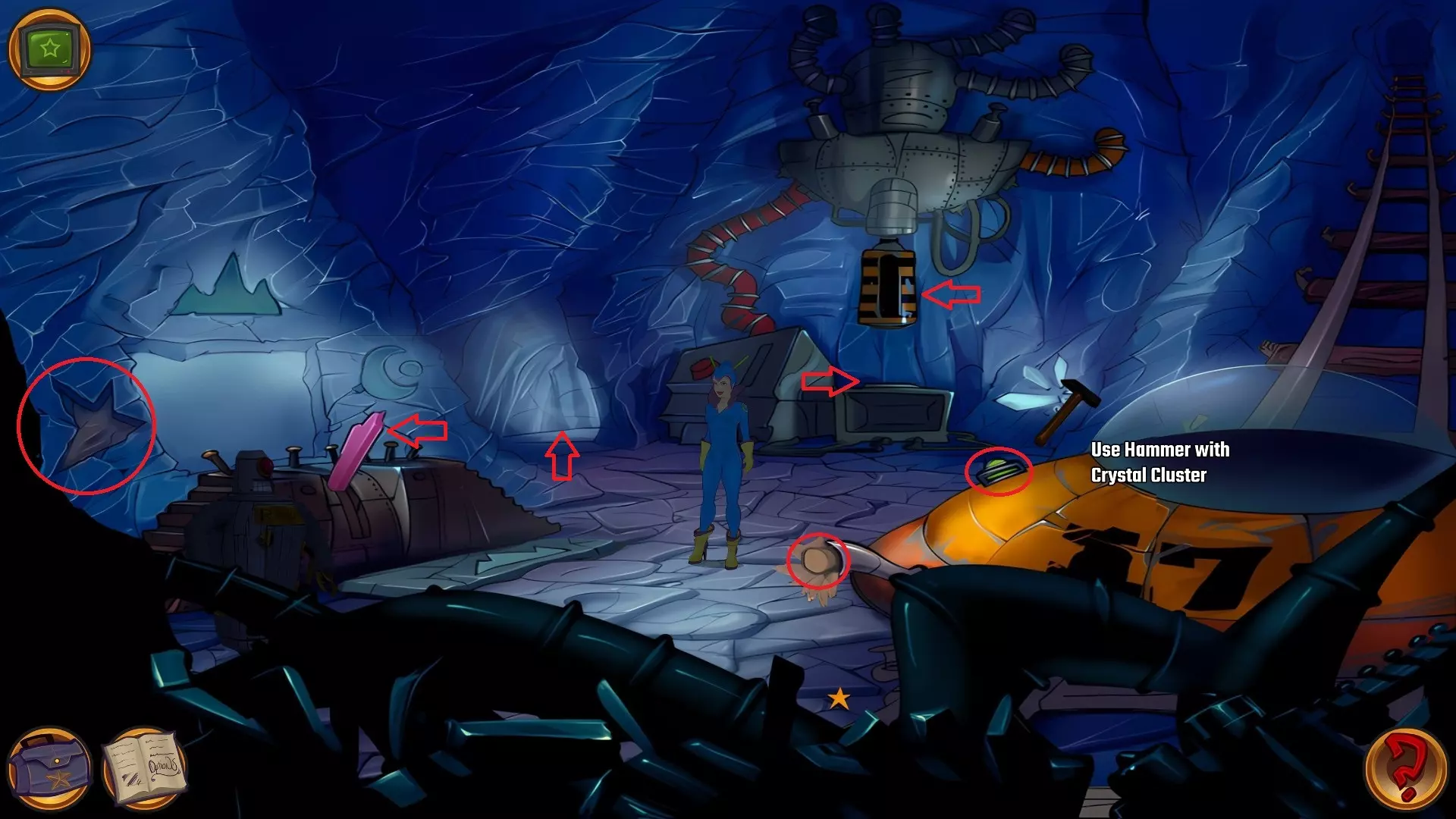 检查左侧的星形凹陷。 检查带有红色水晶开关的大型显示器,但它没有通电。 从飞碟的排气口拿走软木塞。 拿走飞碟的燃料罐。 用锤子敲击蓝色水晶簇以获取蓝色水晶。 检查压力机,它分为两部分。顶部是压力机,底部是工作区域。 通过大型压力机旁边的开口进入下一个房间。 你现在身处电脑室。