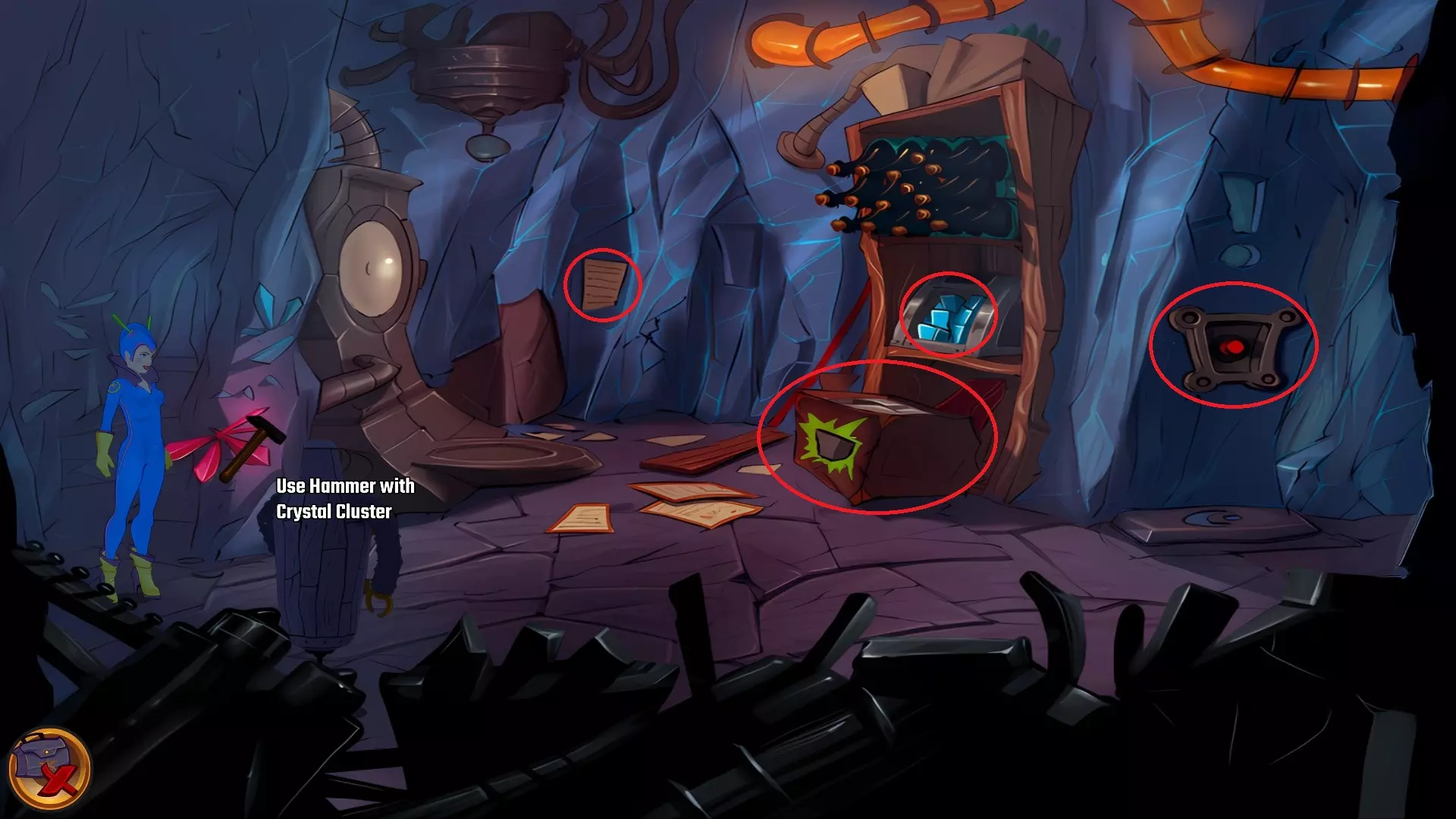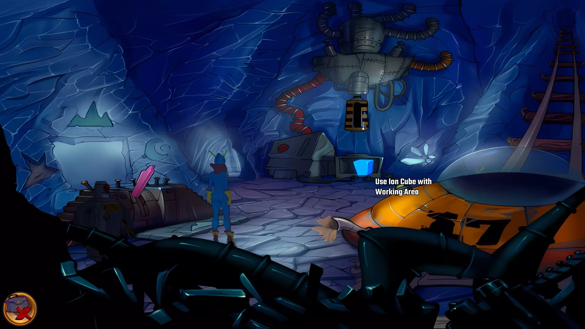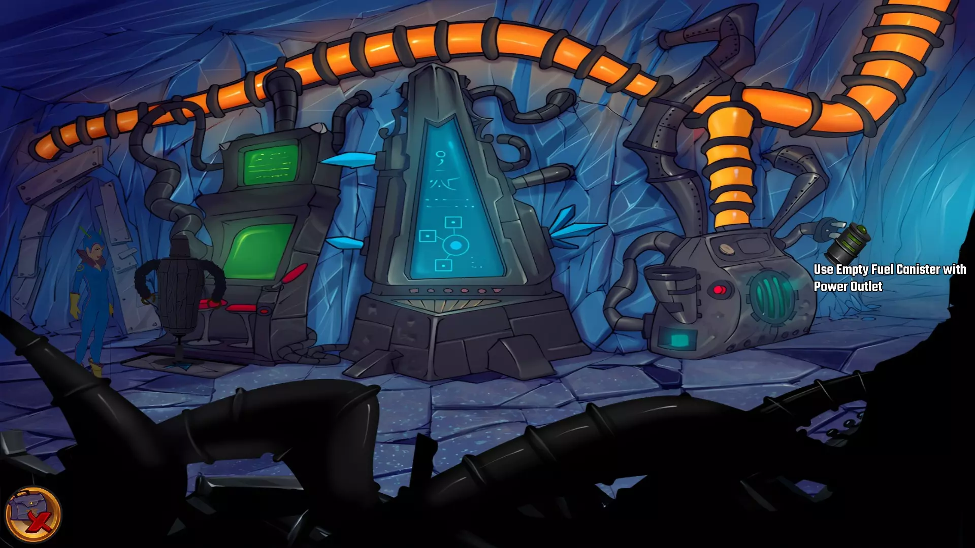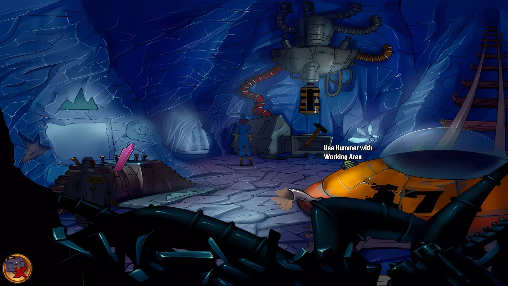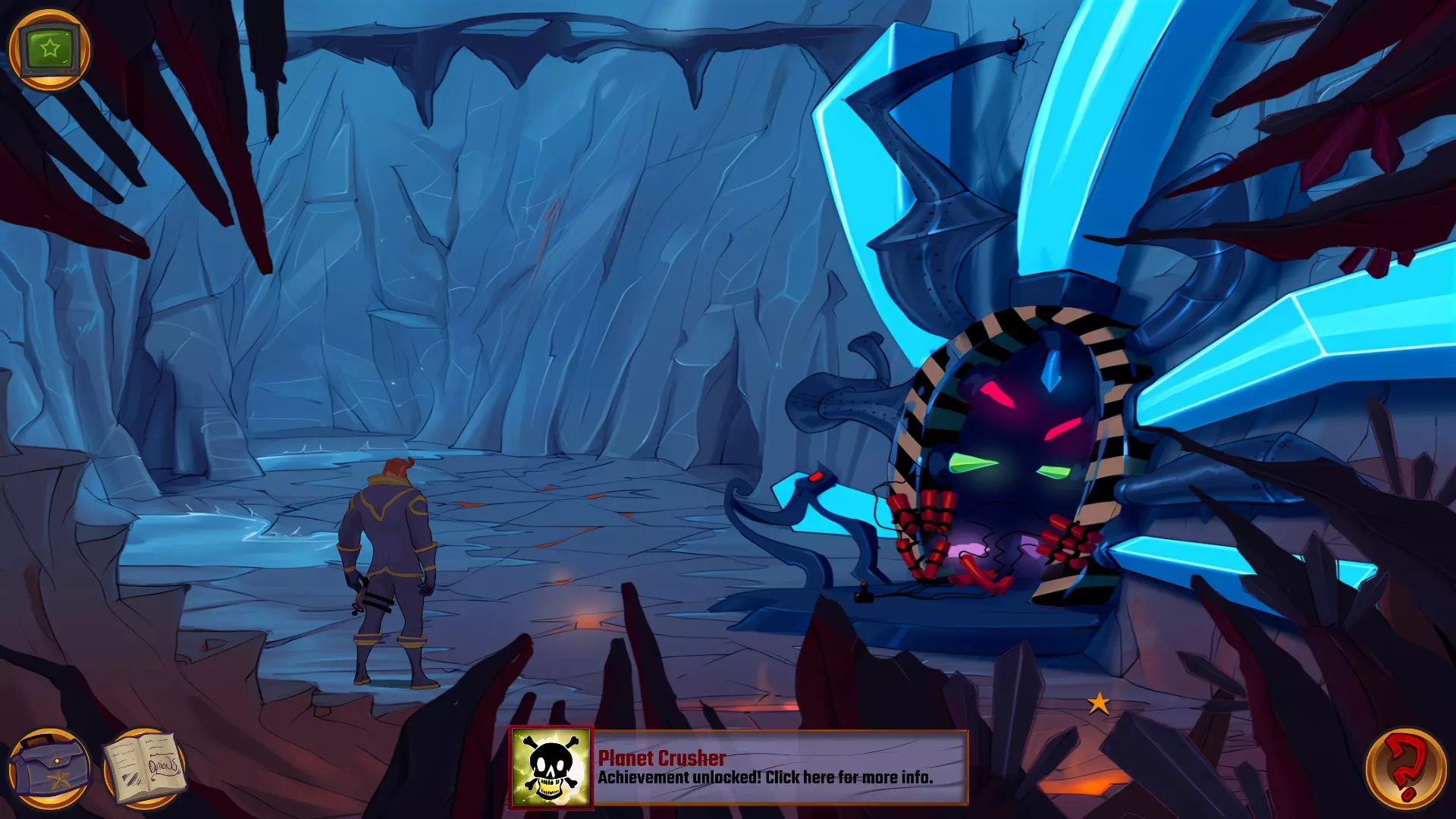 检查左侧的星形凹陷。 检查带有红色水晶开关的大型显示器,但它没有通电。 从飞碟的排气口拿走软木塞。 拿走飞碟的燃料罐。 用锤子敲击蓝色水晶簇以获取蓝色水晶。 检查压力机,它分为两部分。顶部是压力机,底部是工作区域。 通过大型压力机旁边的开口进入下一个房间。 你现在身处电脑室。