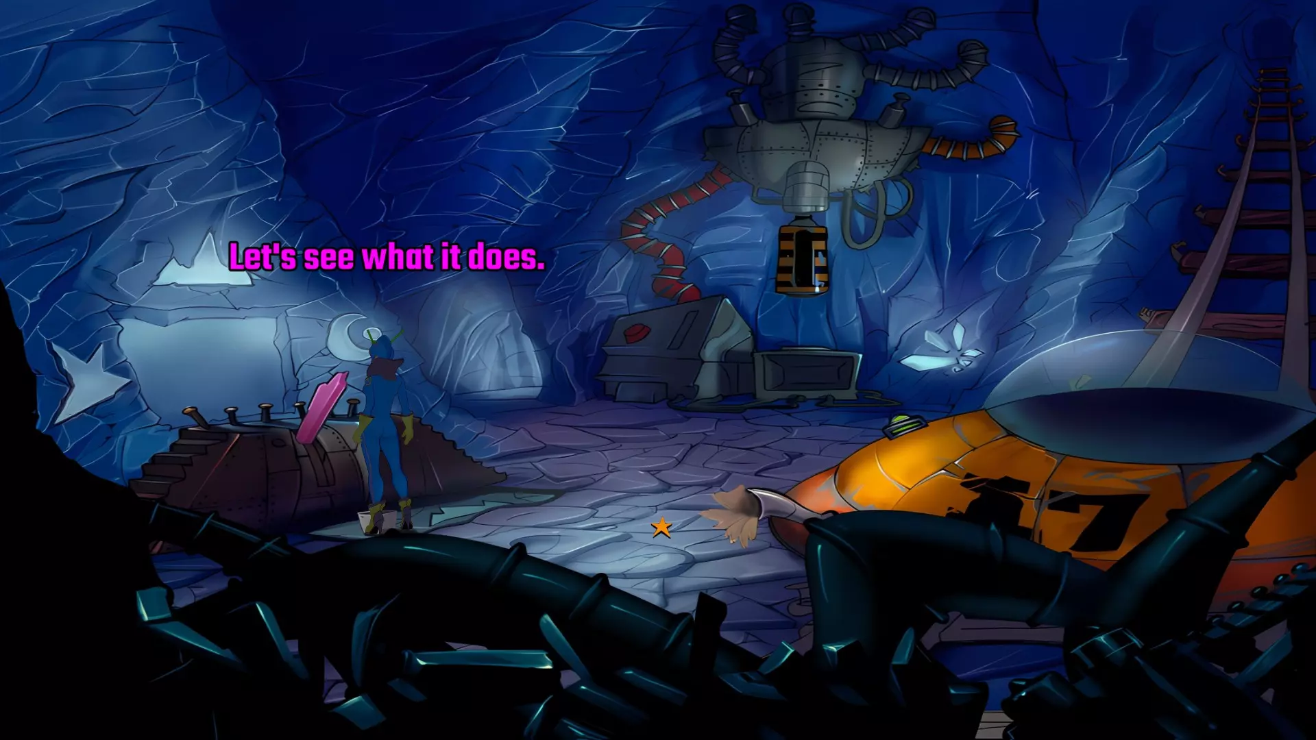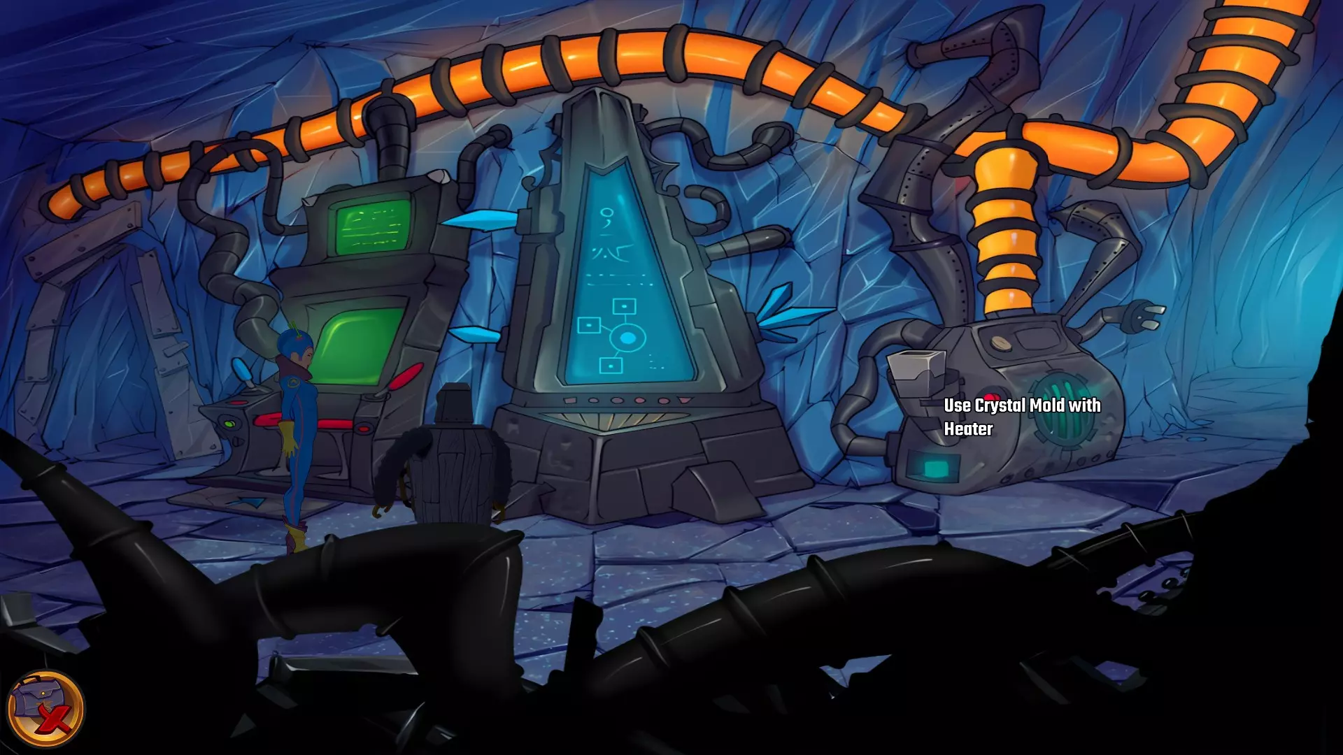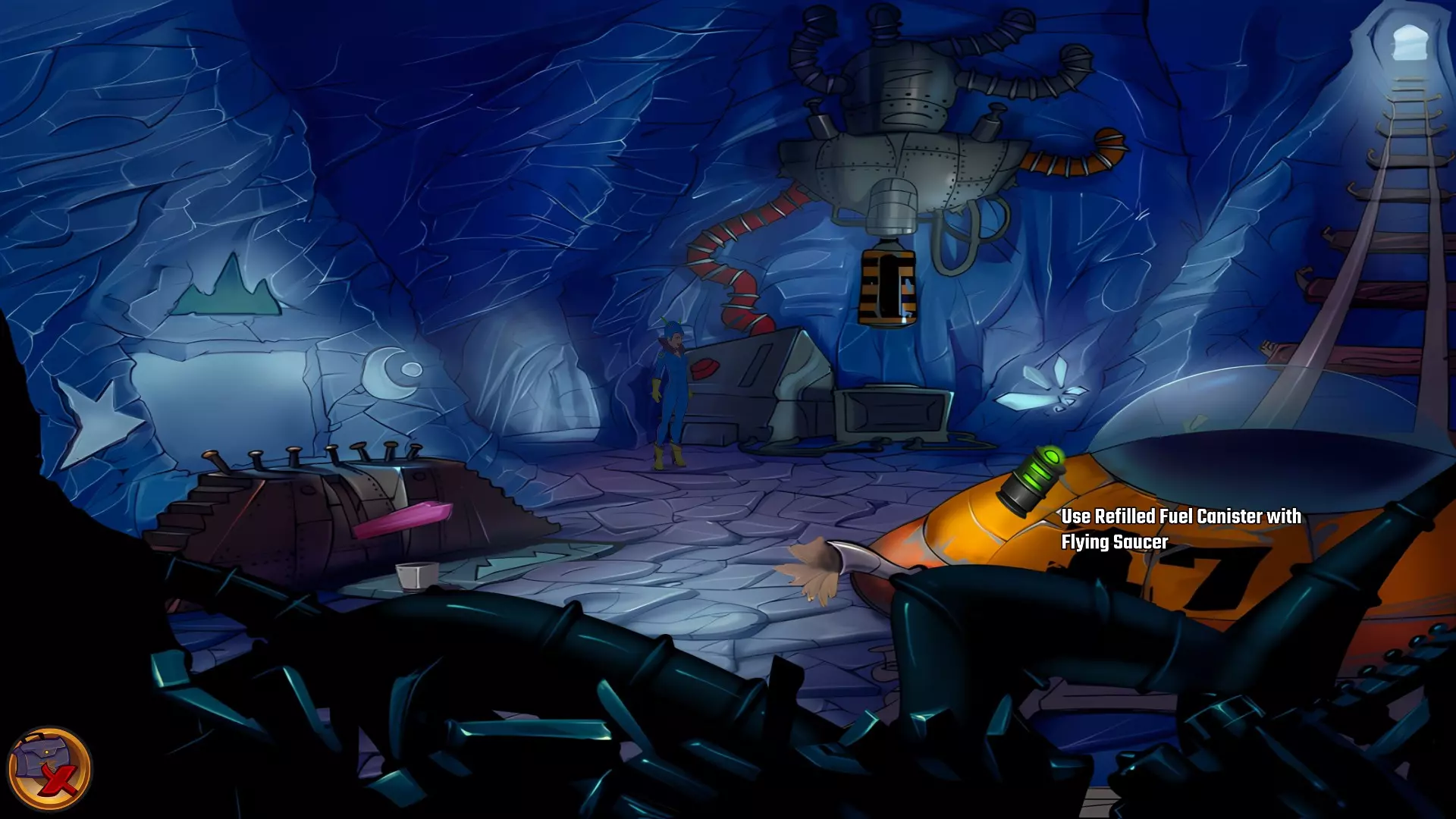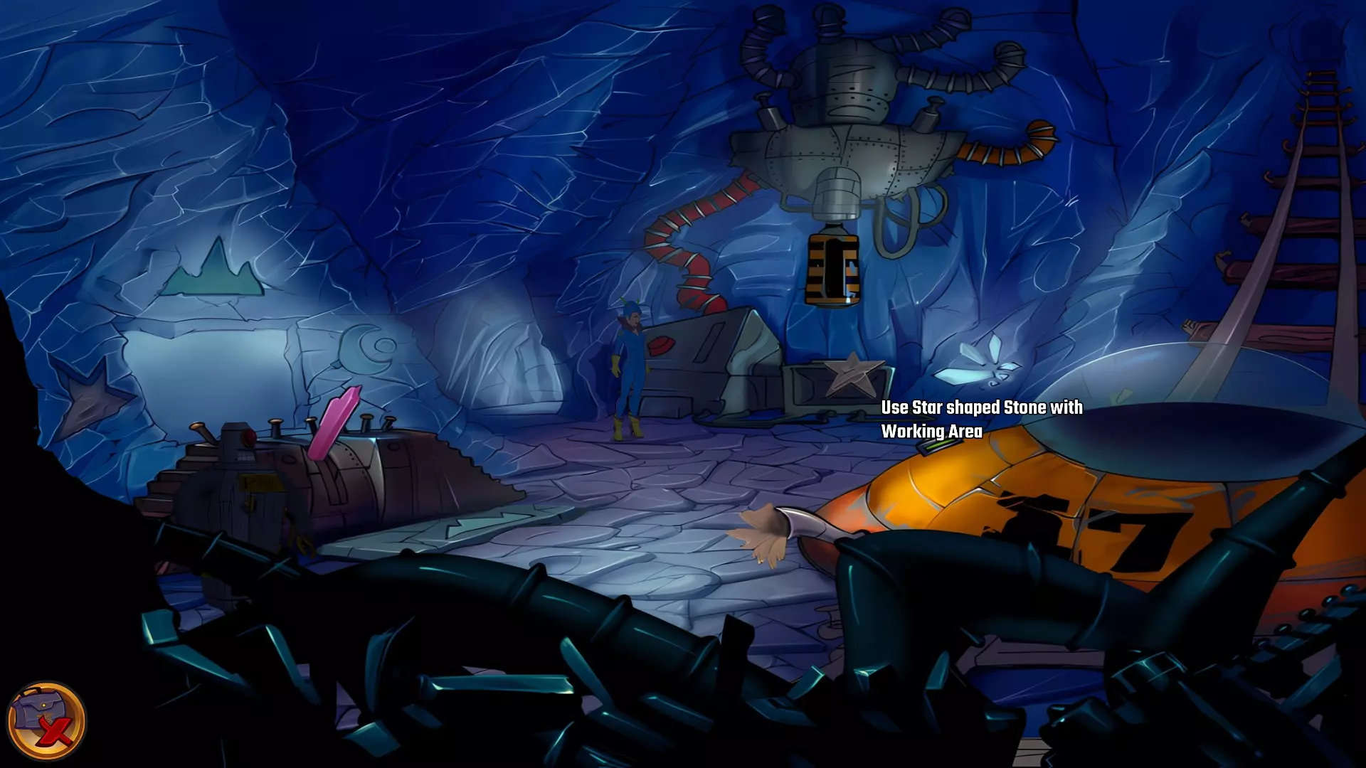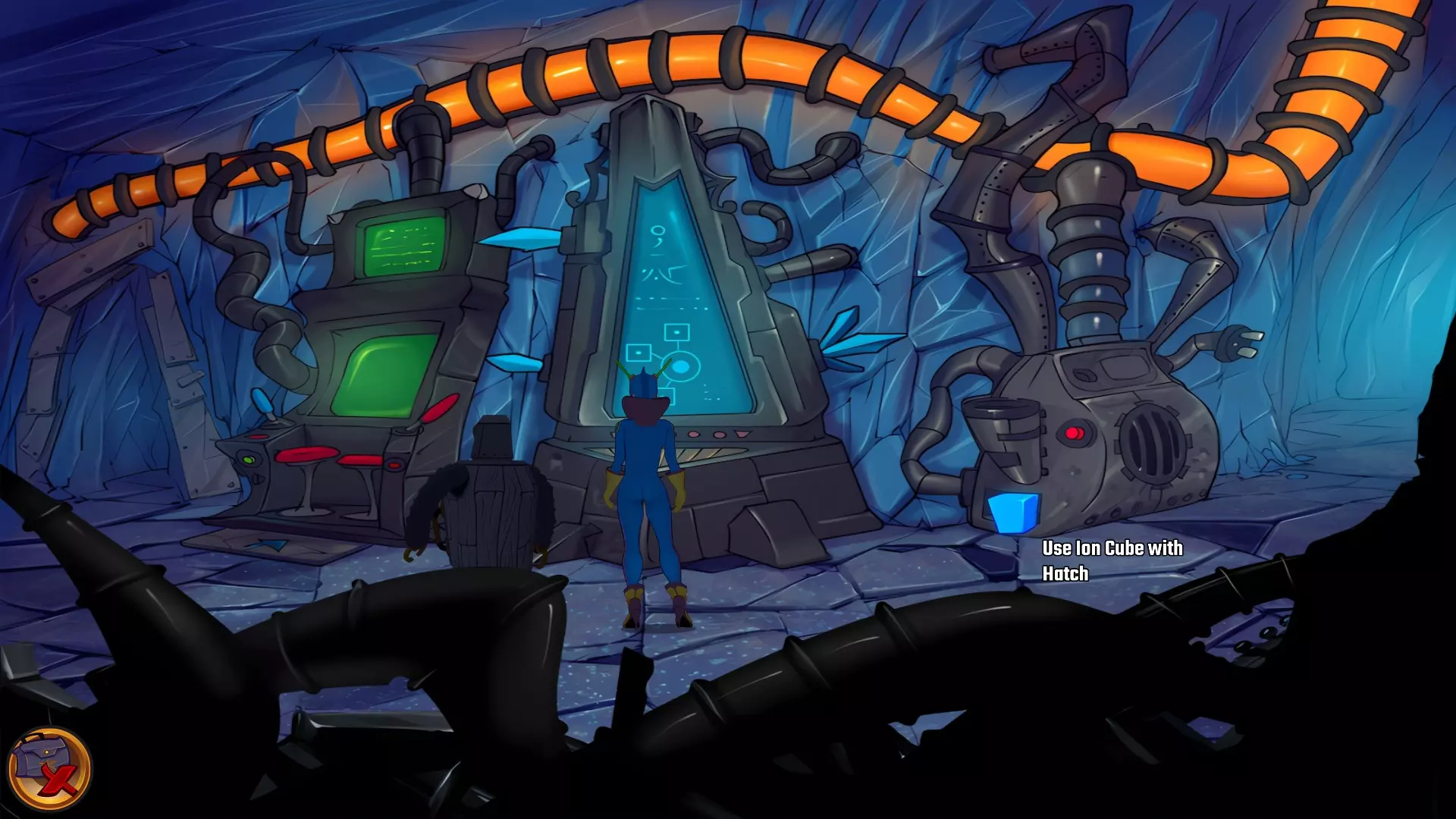 检查左侧的星形凹陷。 检查带有红色水晶开关的大型显示器,但它没有通电。 从飞碟的排气口拿走软木塞。 拿走飞碟的燃料罐。 用锤子敲击蓝色水晶簇以获取蓝色水晶。 检查压力机,它分为两部分。顶部是压力机,底部是工作区域。 通过大型压力机旁边的开口进入下一个房间。 你现在身处电脑室。