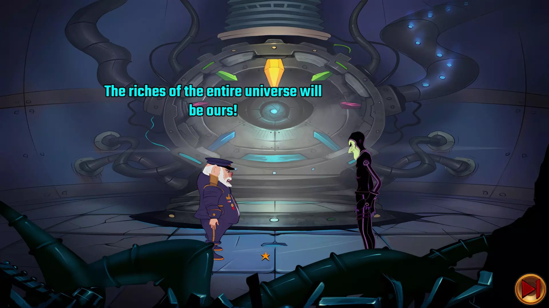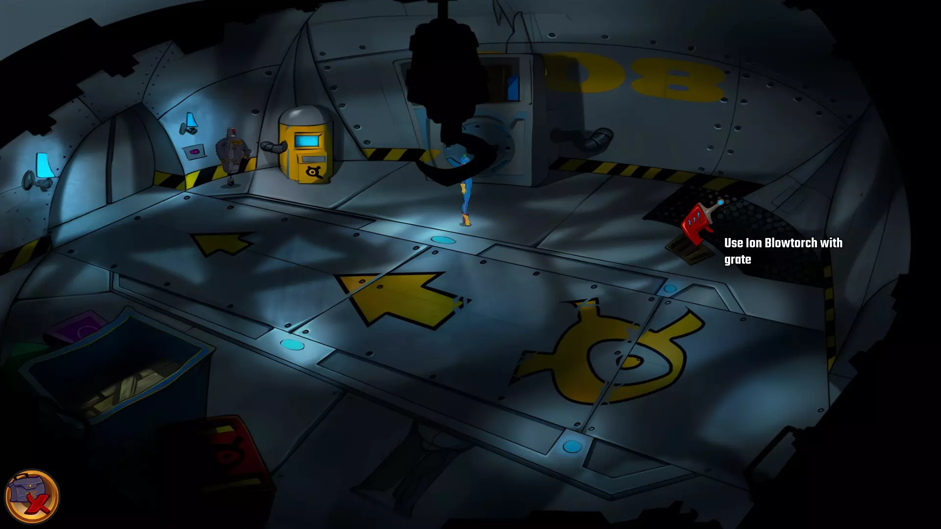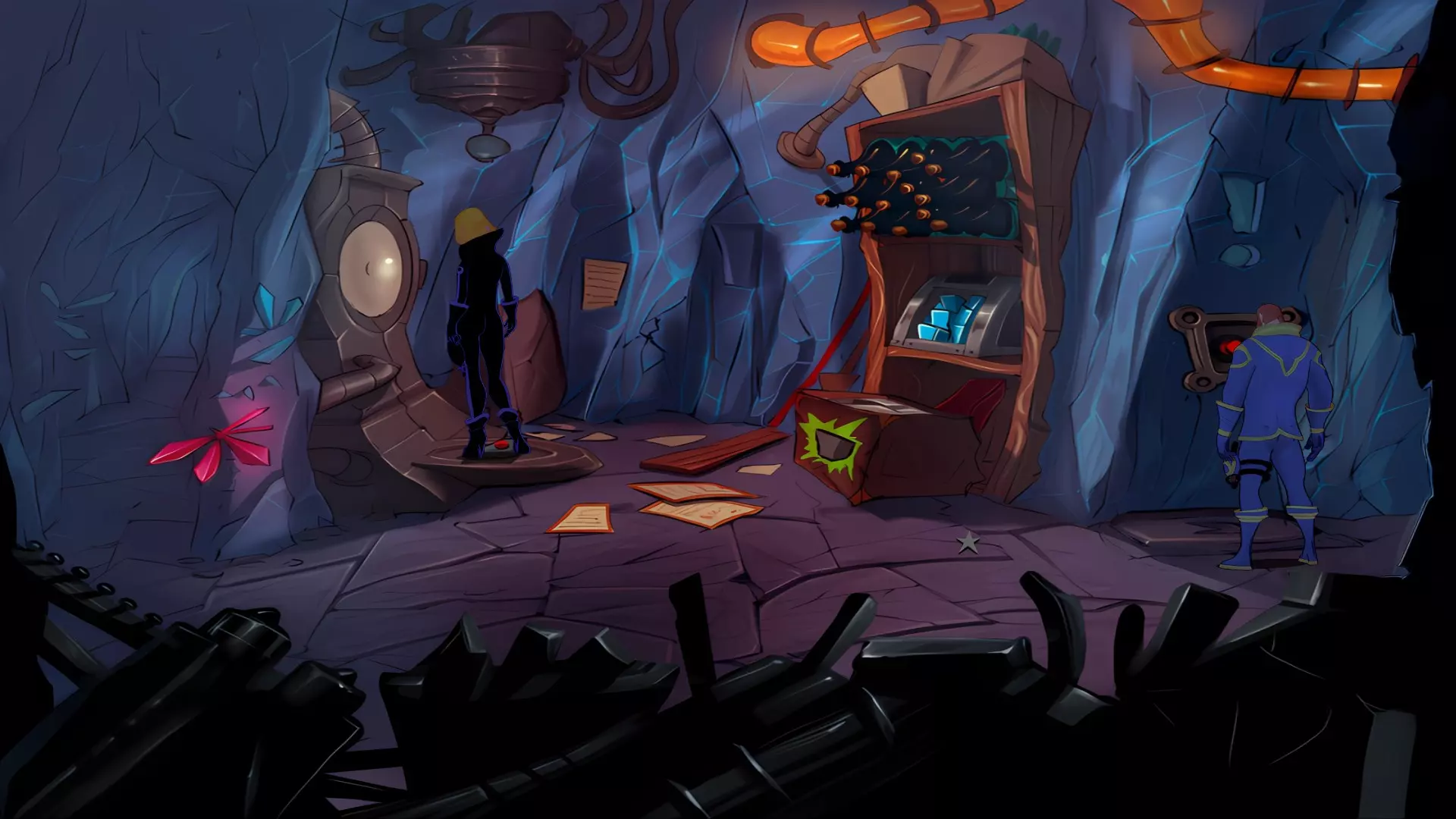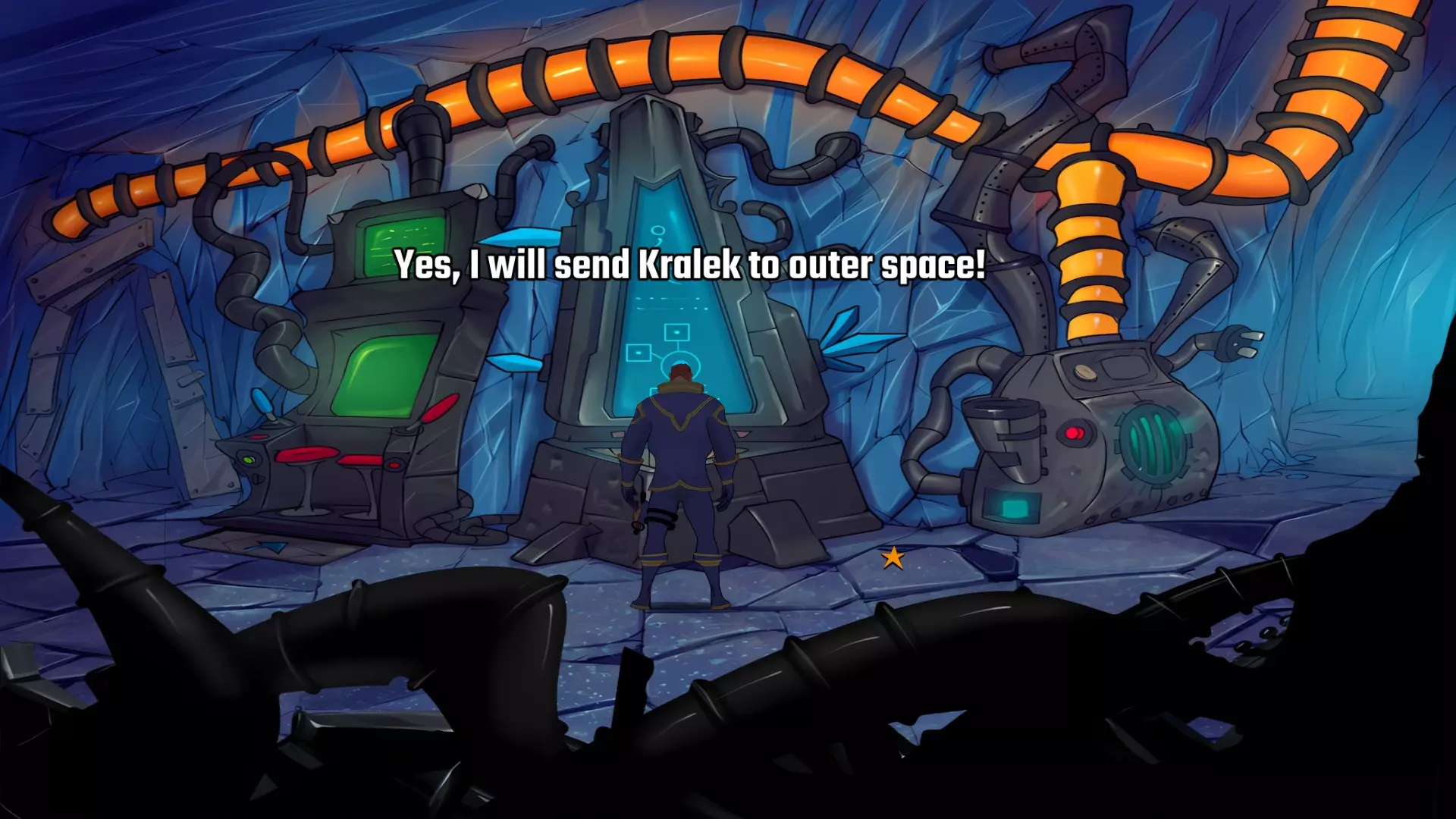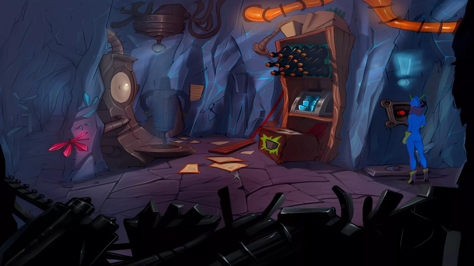 检查左侧的星形凹陷。 检查带有红色水晶开关的大型显示器,但它没有通电。 从飞碟的排气口拿走软木塞。 拿走飞碟的燃料罐。 用锤子敲击蓝色水晶簇以获取蓝色水晶。 检查压力机,它分为两部分。顶部是压力机,底部是工作区域。 通过大型压力机旁边的开口进入下一个房间。 你现在身处电脑室。
