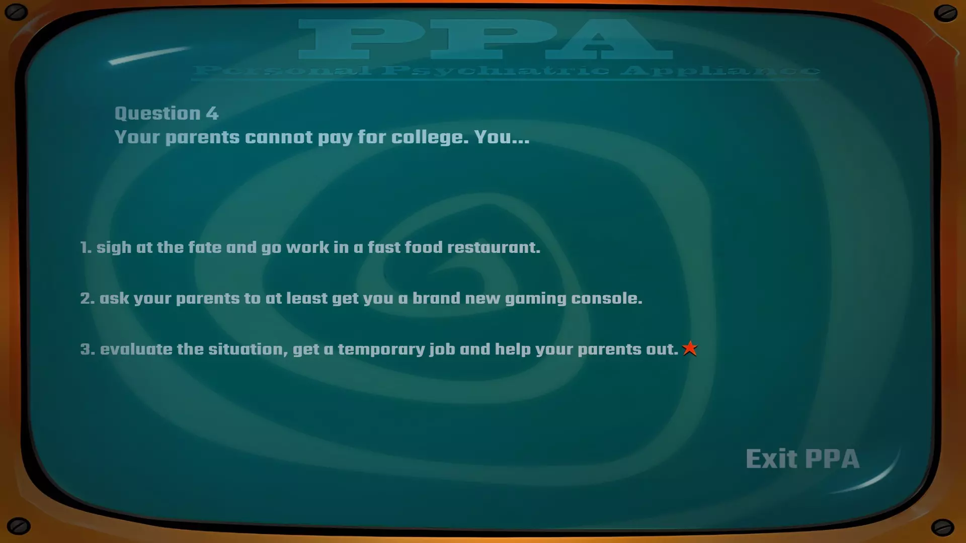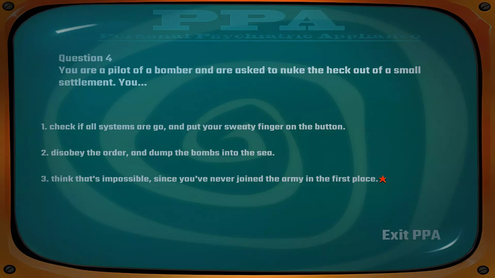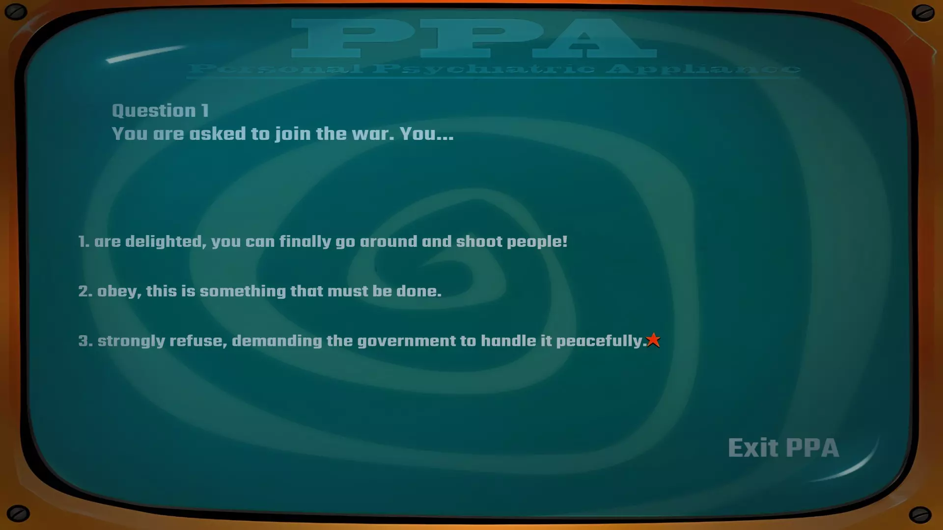 建议在此处存档以防万一,若要获得成就,你需要在完成露娜和丹尼的心理评估以获取【和平主义报告】和【坚定意志报告】时不出现任何错误。我进行了多次尝试,发现有些选项组合虽然能让你获得正确报告,但并非“完美”得分,因此无法解锁成就。使用仓库中的【战利品终端】开始心理评估。丹尼的答案:3-2-3-3-1。问题1