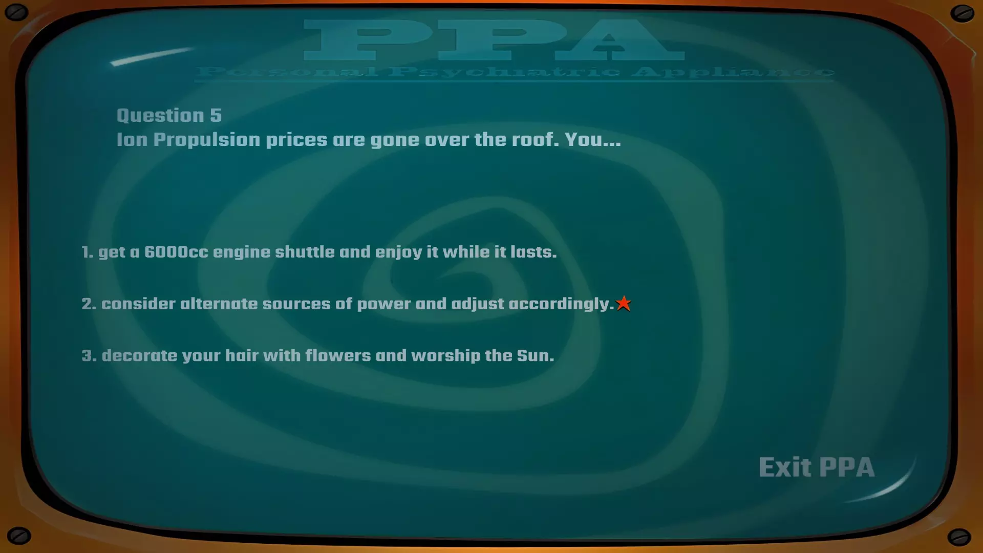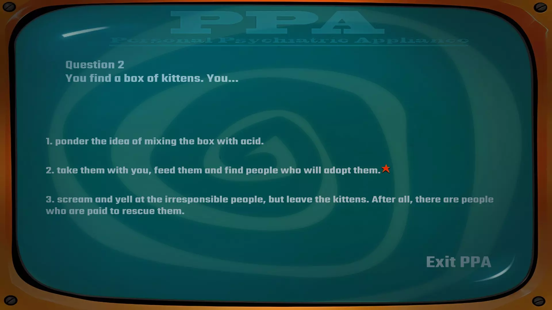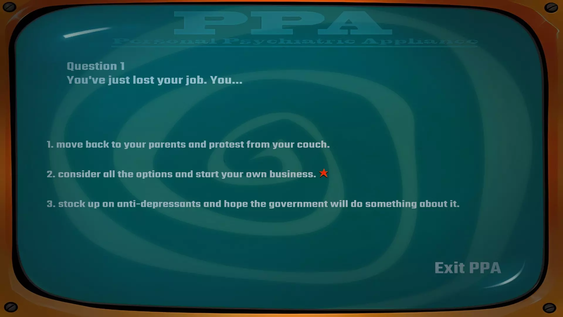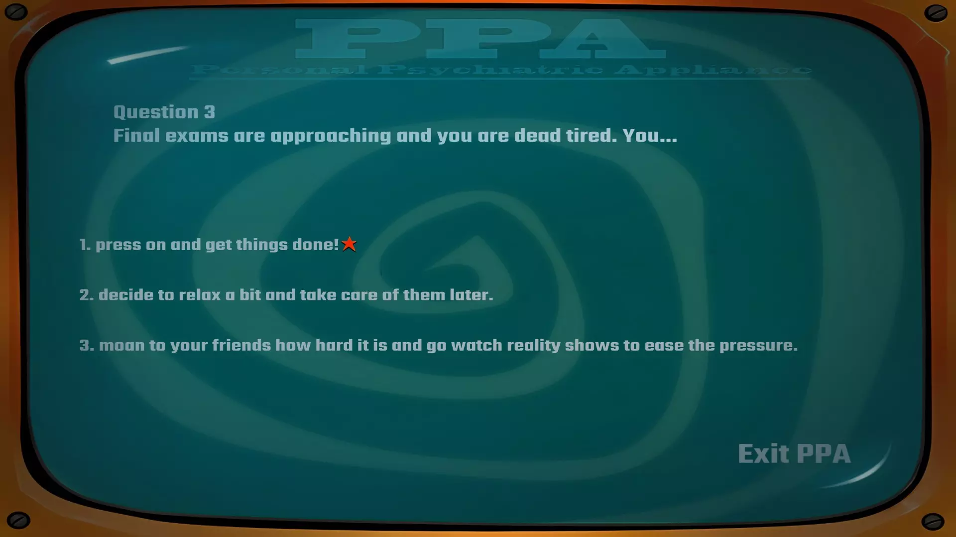 建议在此处存档以防万一,若要获得成就,你需要在完成露娜和丹尼的心理评估以获取【和平主义报告】和【坚定意志报告】时不出现任何错误。我进行了多次尝试,发现有些选项组合虽然能让你获得正确报告,但并非“完美”得分,因此无法解锁成就。使用仓库中的【战利品终端】开始心理评估。丹尼的答案:3-2-3-3-1。问题1