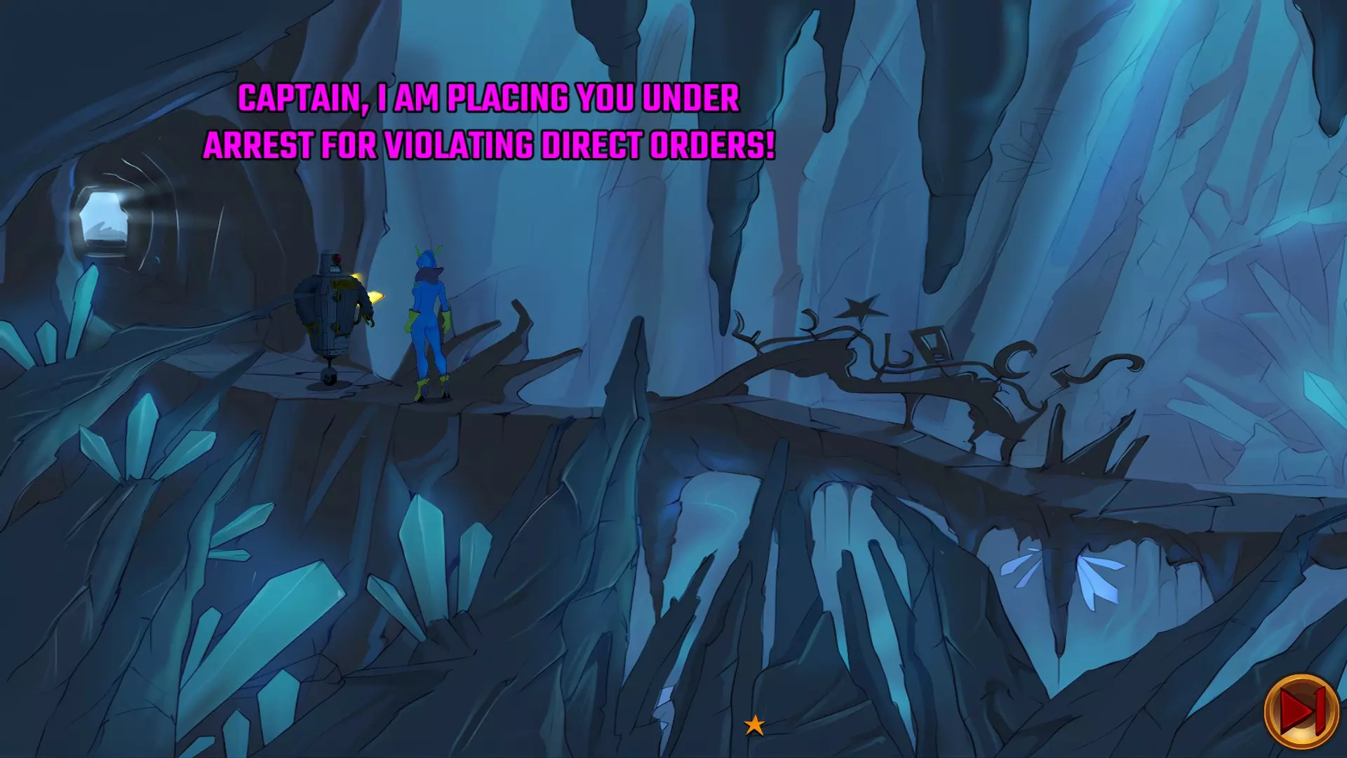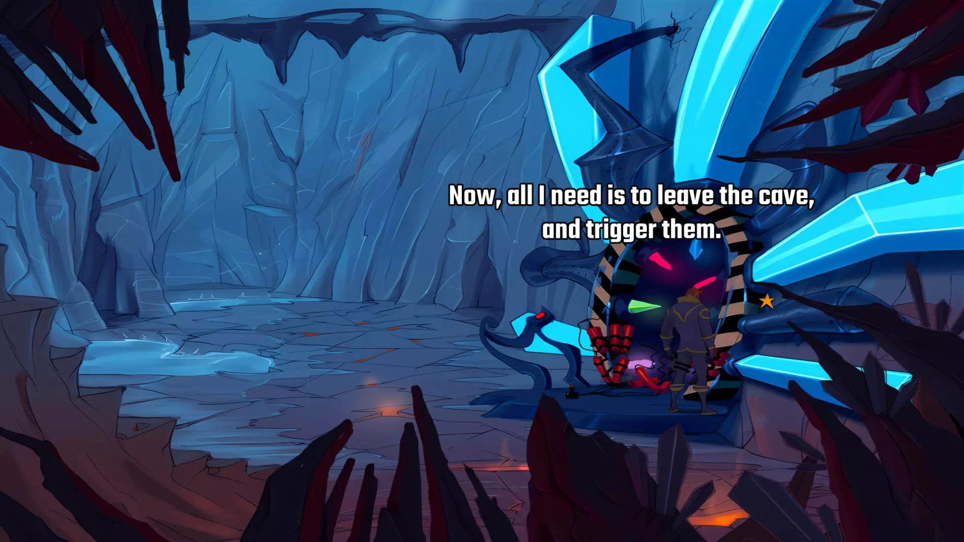 跑到左边的洞穴,前往储藏室。打开你的物品栏,将雷管放入重力置换器。克拉莱克传送到房间里并冲向雷管,与此同时,布拉维船长去按红色按钮。