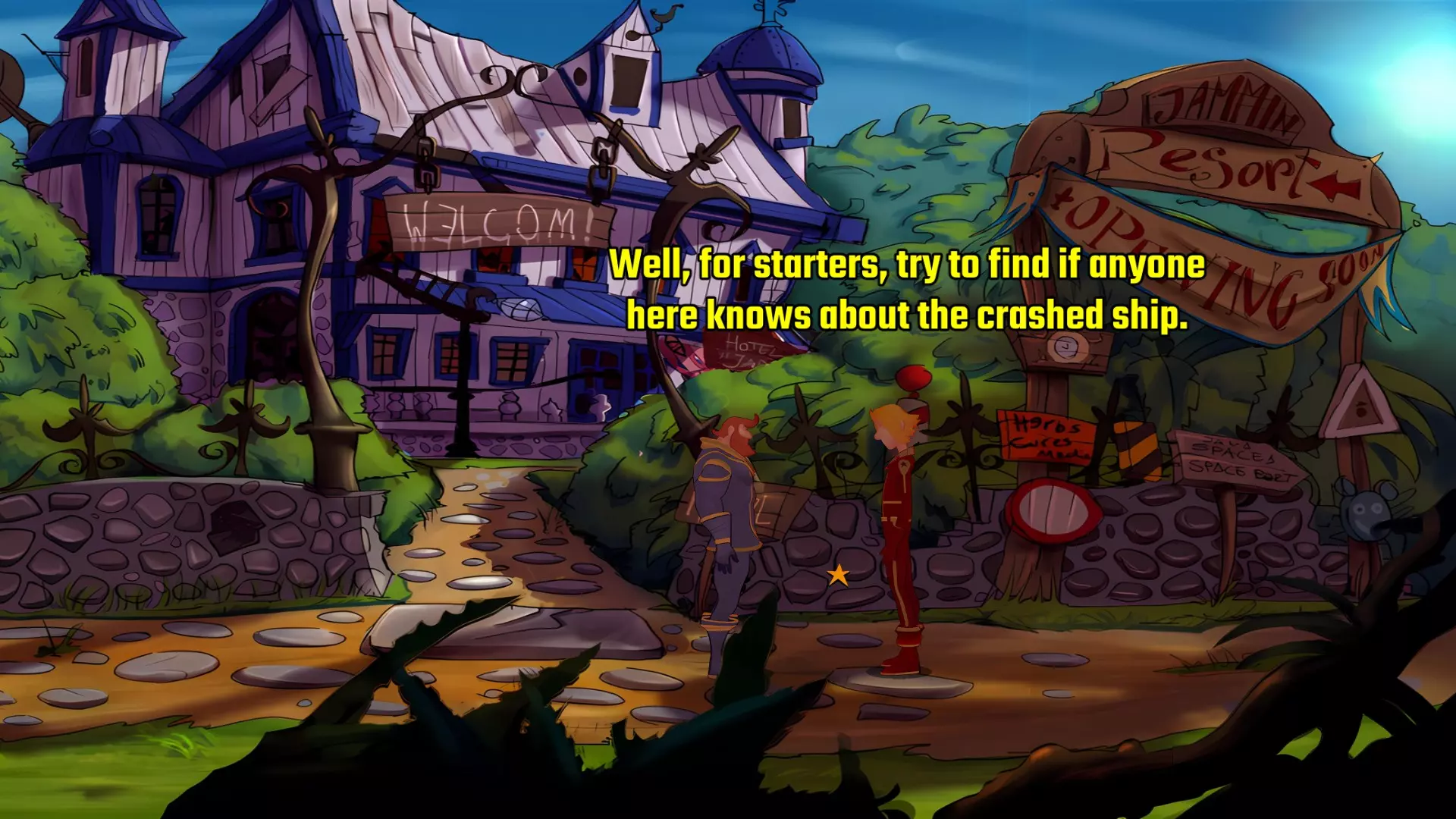 前往酒店右侧,即可到达公园。与老人交谈,获取关于失事飞船的信息。