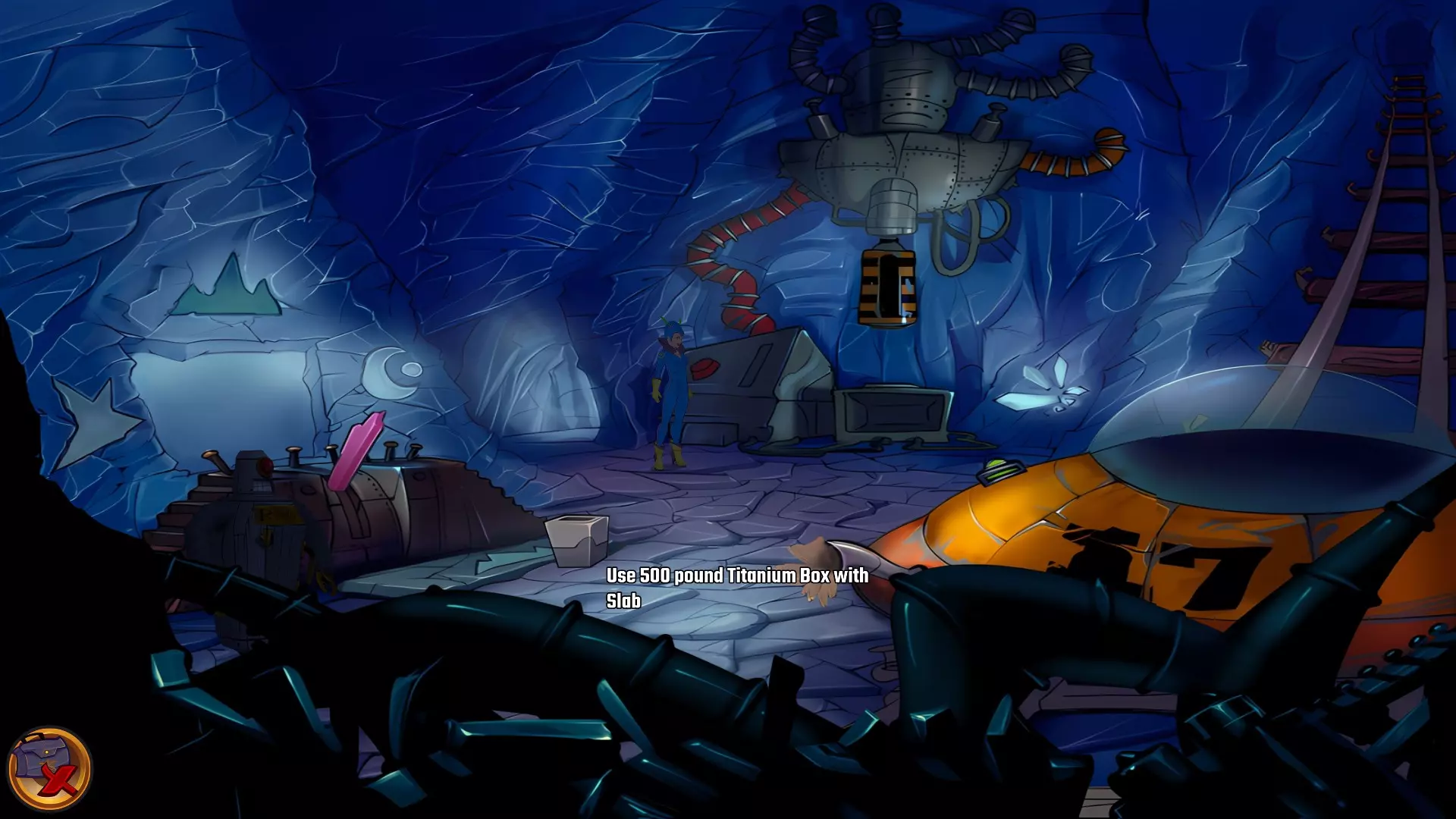 在这里多拿些湿黏土。 将另一个钛盒与湿黏土组合。 再次进入左侧洞穴回到储藏室。 再拿一个钛盒和一个离子立方体。 将一个钛盒放在重力置换器上,按下红色按钮使其变重。你无法拿起它,所以让划艇帮你拿起。