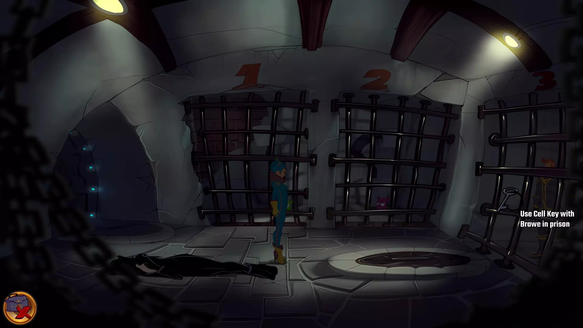 返回后向右走,一直走过电梯。你会来到关押布拉维船长的监狱前,可以和守卫对话,但他不会透露太多信息。检查雕像并获取克里布斯标志。