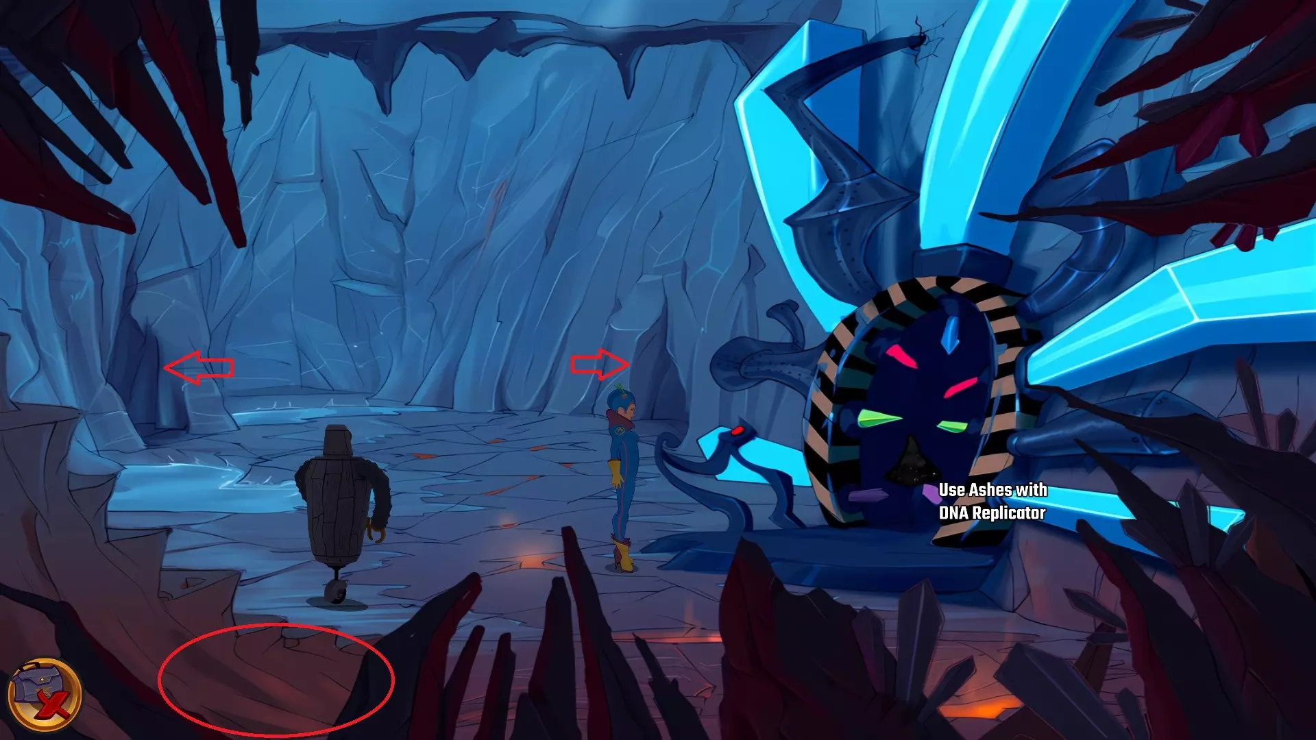 切换到丹尼,前往储藏室,让他站在红色按钮下方的石板上。 切换回露娜,前往中间飞碟室。 将离子薄饼放在工作区域。